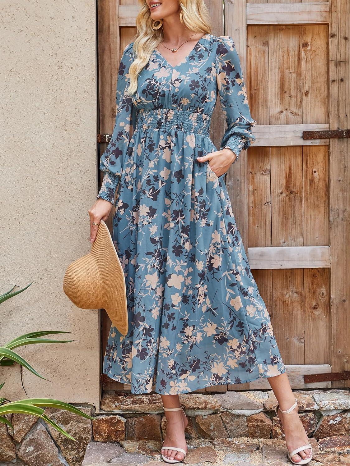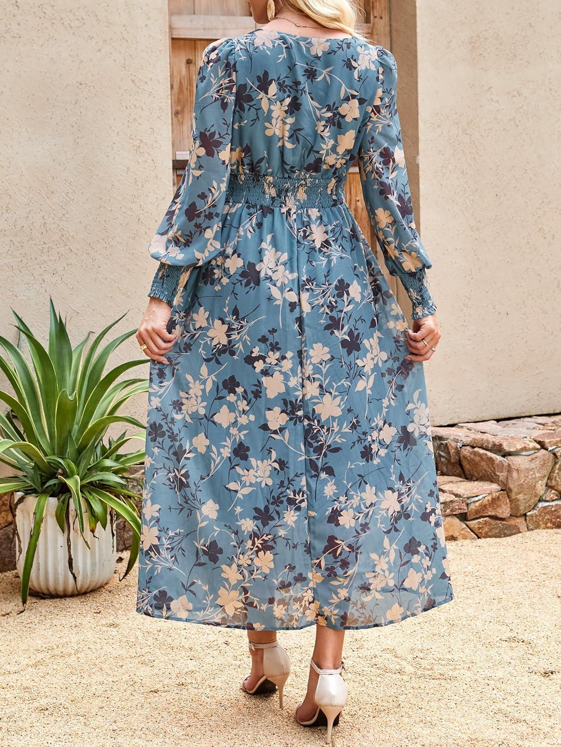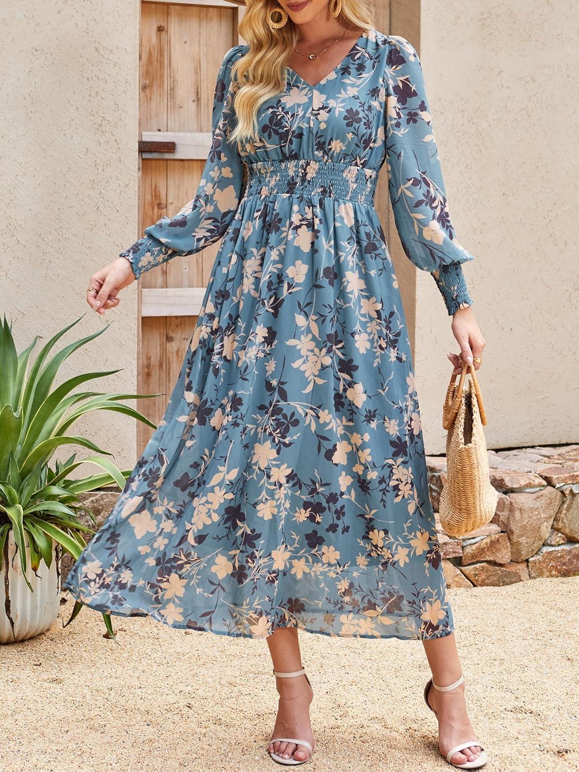 ANRABESS Women’s Long Sleeve Floral Maxi Dress Casual V Neck Chiffon Boho Flowy Beach Fall Wedding Guest Party Long Dresses(Floral Blue)