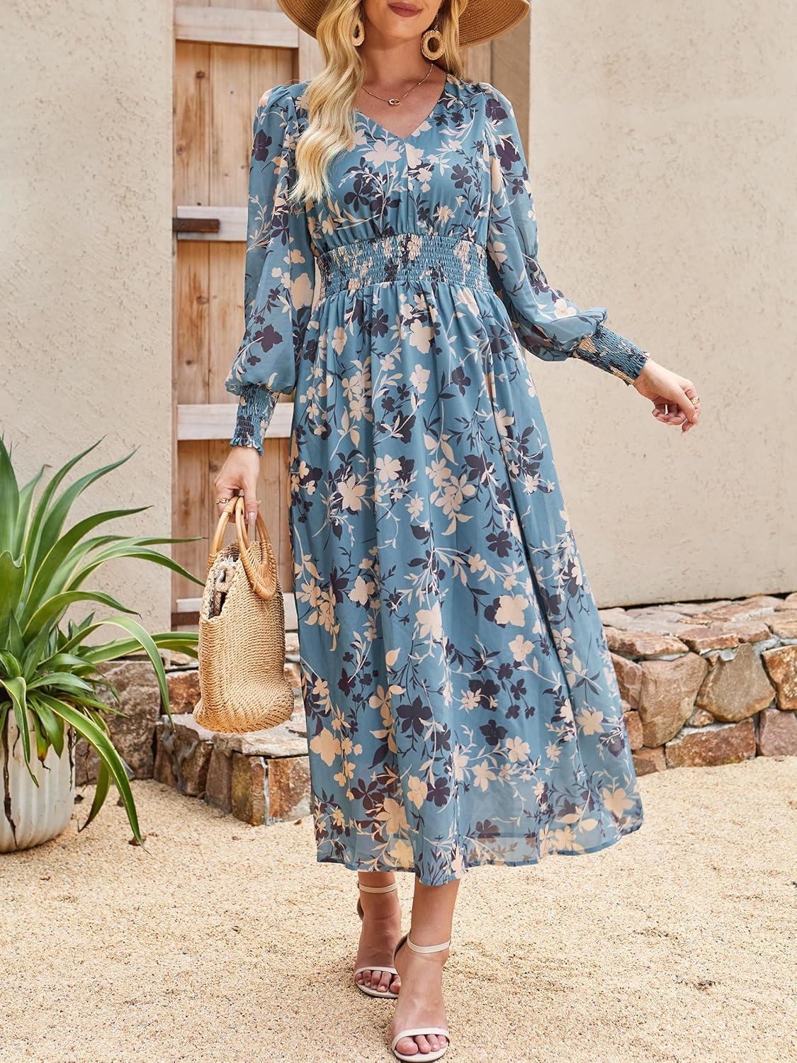 ANRABESS Women’s Long Sleeve Floral Maxi Dress Casual V Neck Chiffon Boho Flowy Beach Fall Wedding Guest Party Long Dresses(Floral Blue Apricot)