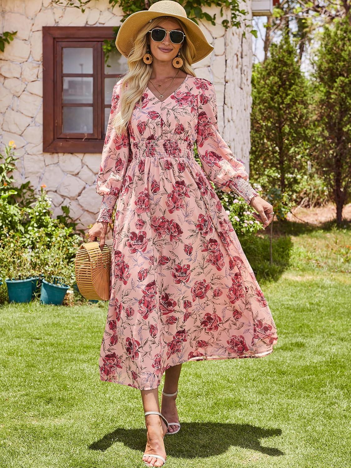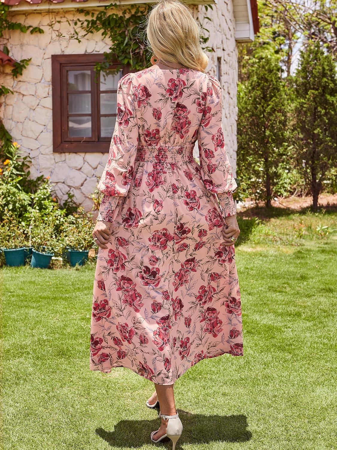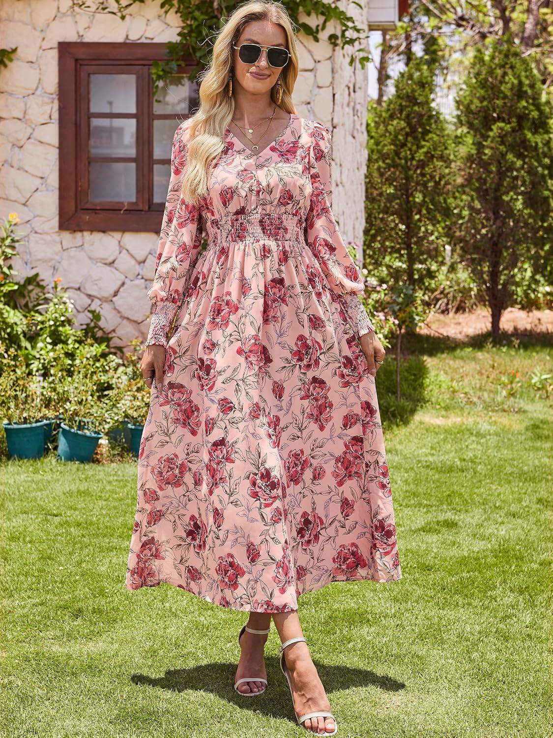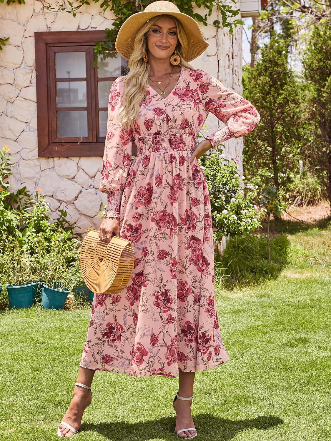 ANRABESS Women’s Long Sleeve Floral Maxi Dress Casual V Neck Chiffon Boho Flowy Beach Fall Wedding Guest Party Long Dresses(Rose Red Floral)