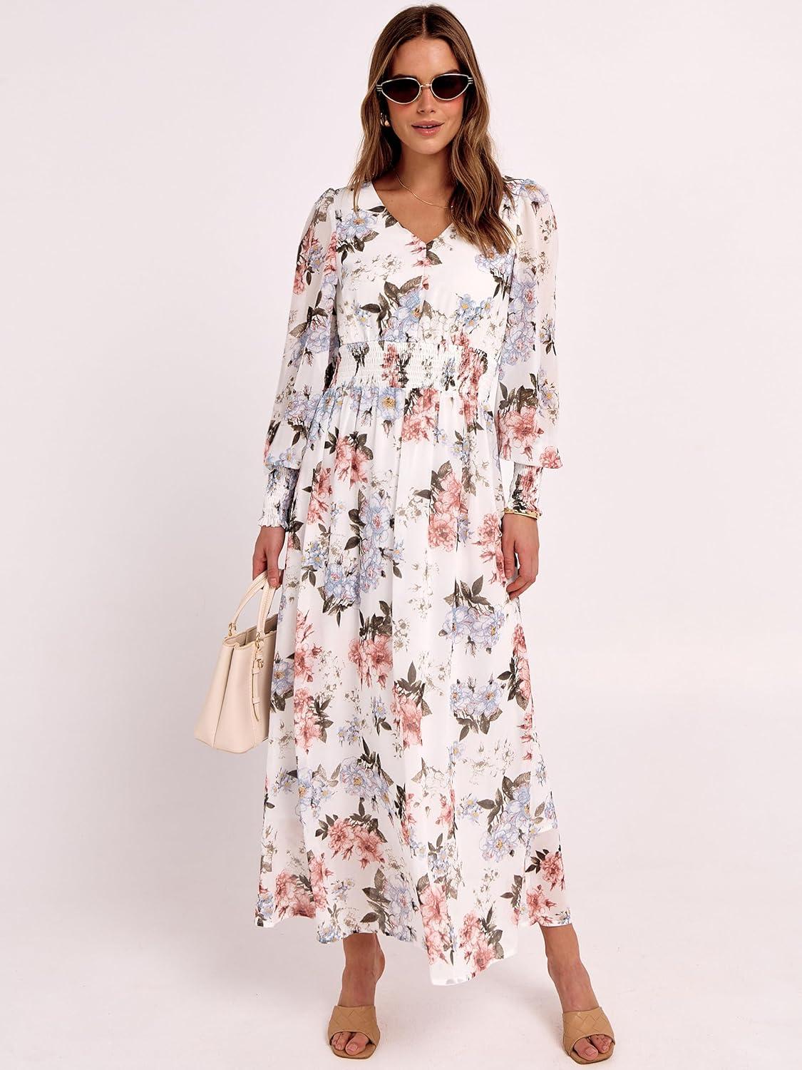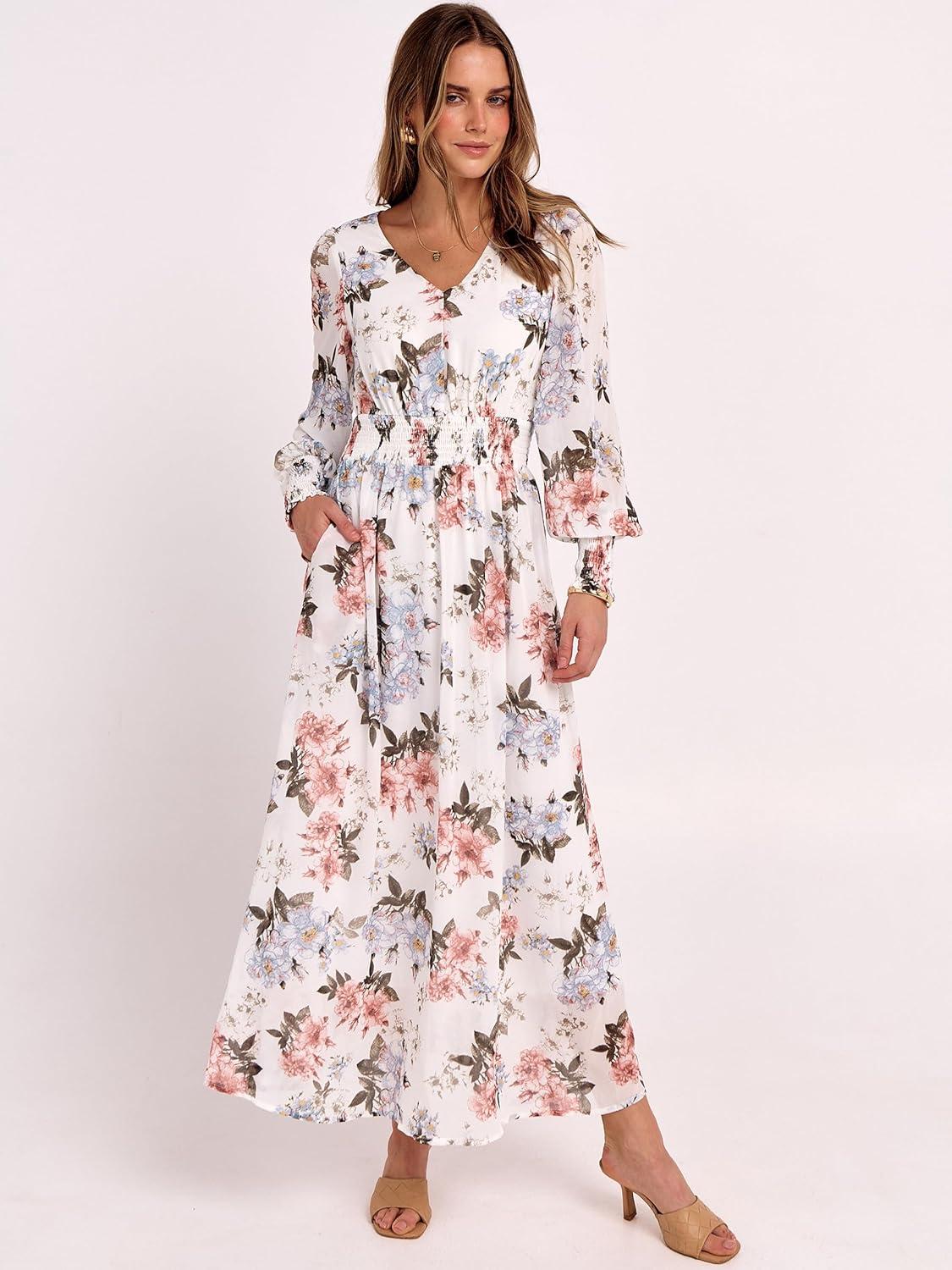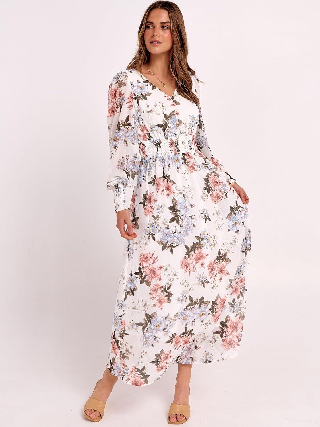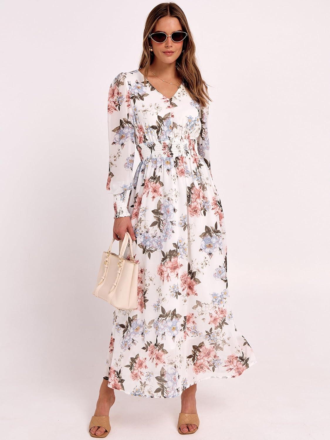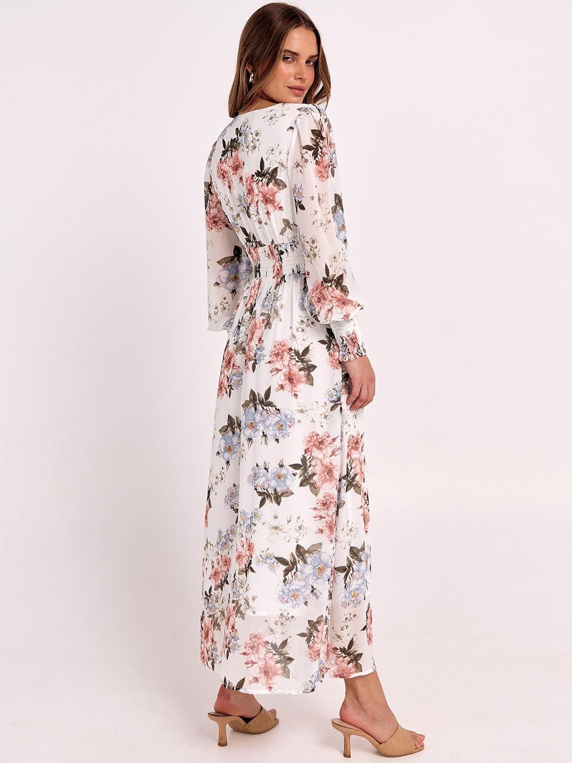 Women’s Boho Flowy Wrap V Neck Long Sleeve Floral Print Slit Beach Wedding Guest Long Maxi Dresses