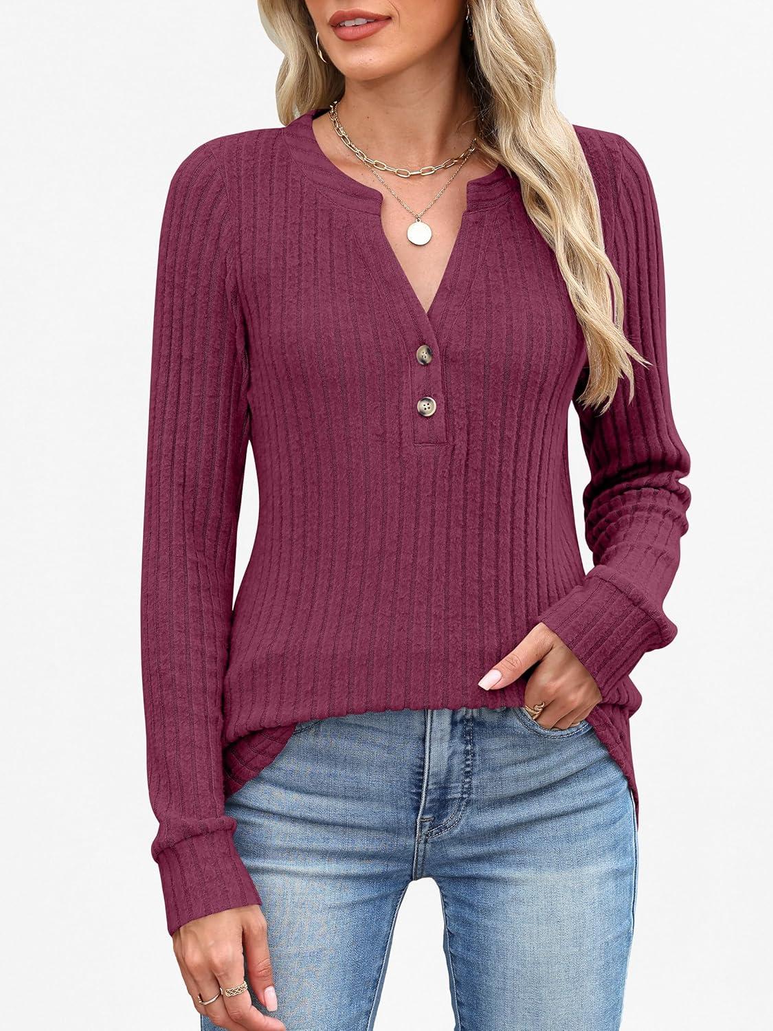 ANRABESS Womens Long Sleeve Henley Shirts 2025 Fall Tunic Tops Ribbed Knit Lightweight Sweaters Dressy Casual Blouse Outfits(Burgundy)