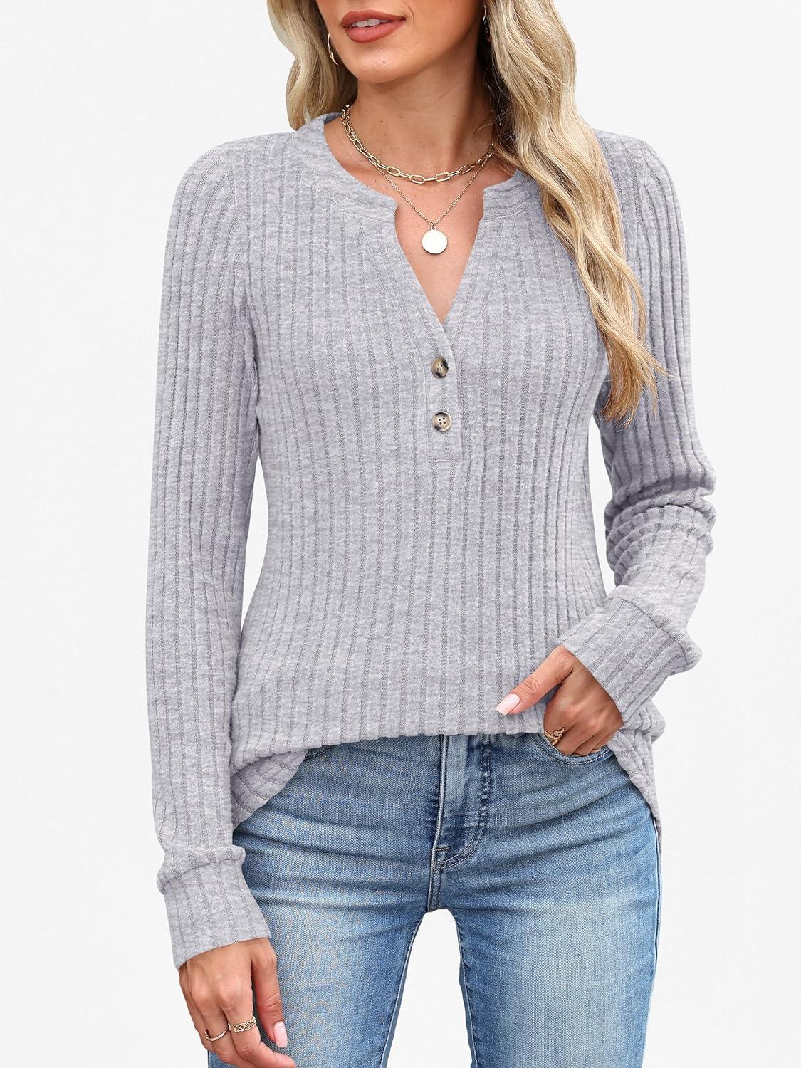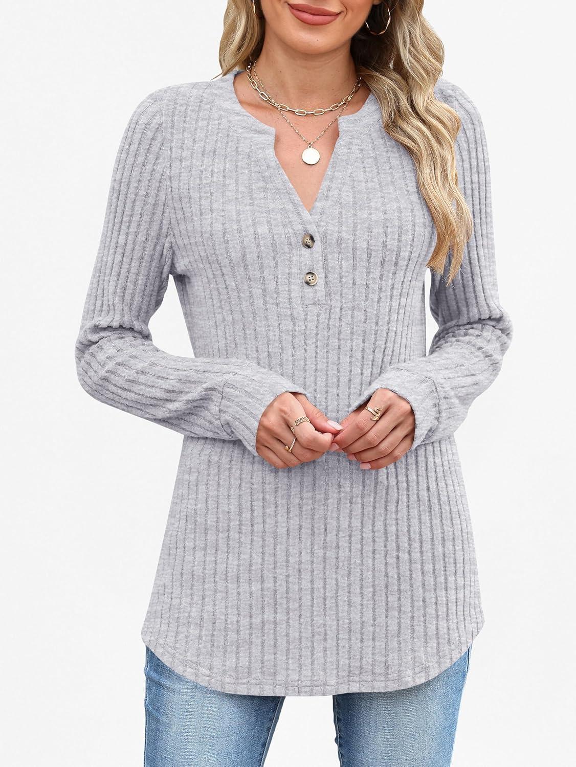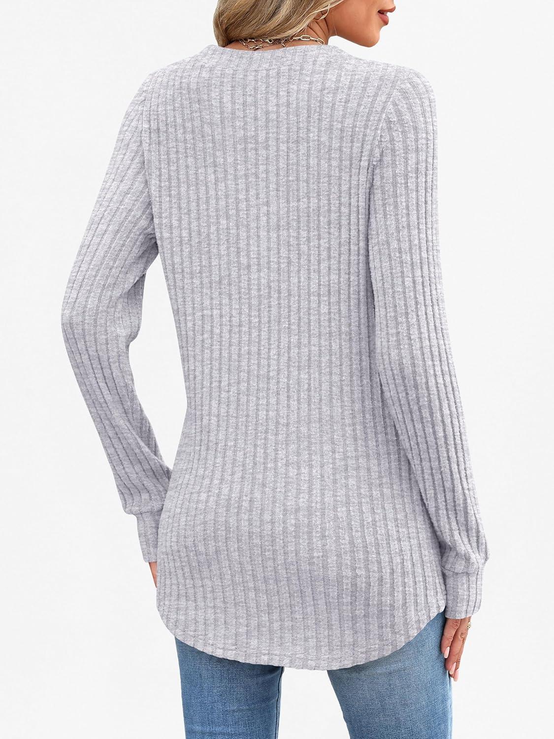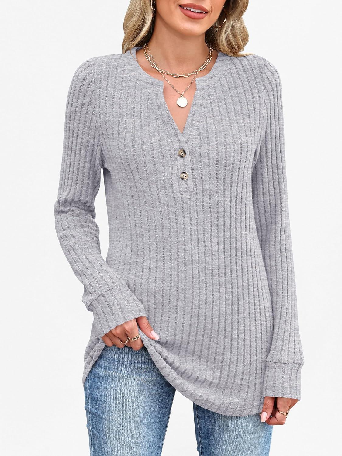 ANRABESS Womens Long Sleeve Henley Shirts 2025 Fall Tunic Tops Ribbed Knit Lightweight Sweaters Dressy Casual Blouse Outfits(Grey)