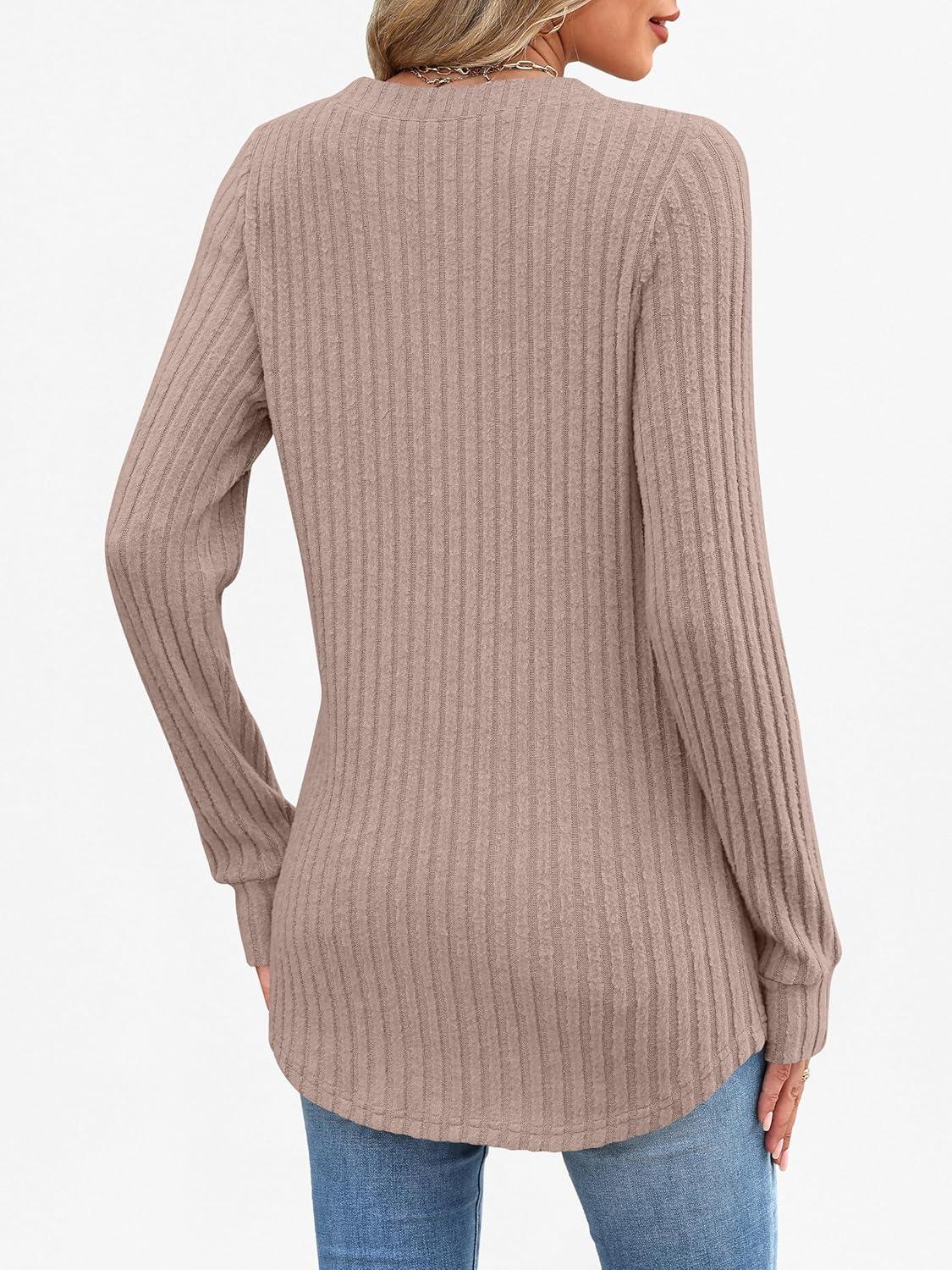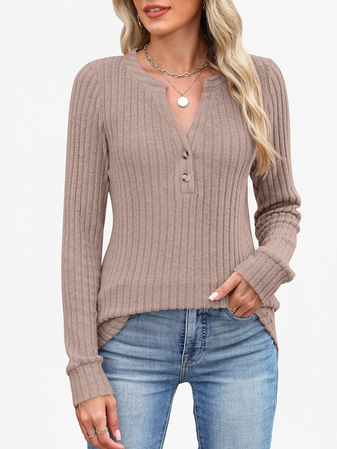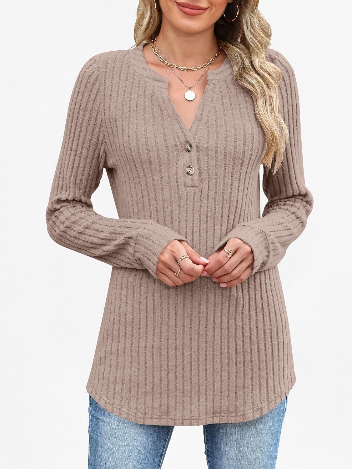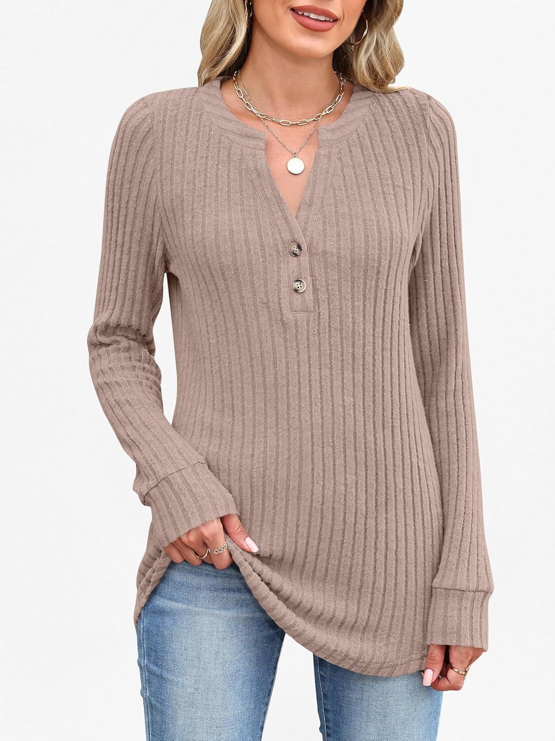 ANRABESS Womens Long Sleeve Henley Shirts 2025 Fall Tunic Tops Ribbed Knit Lightweight Sweaters Dressy Casual Blouse Outfits(Light Khaki)