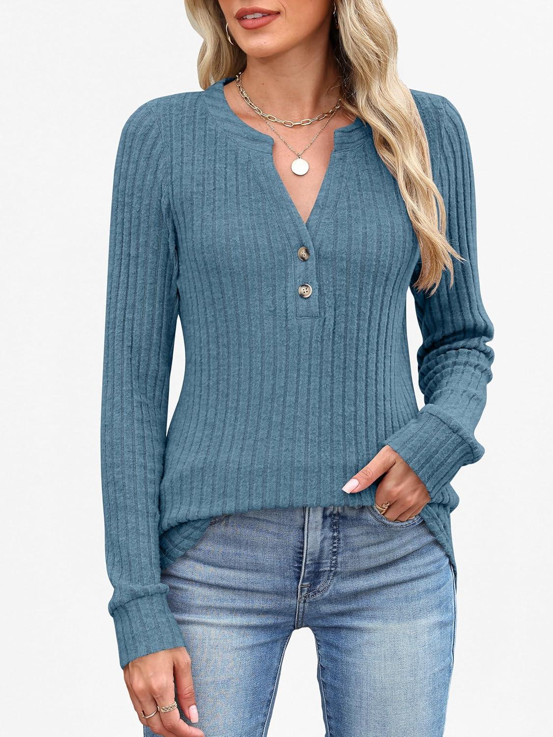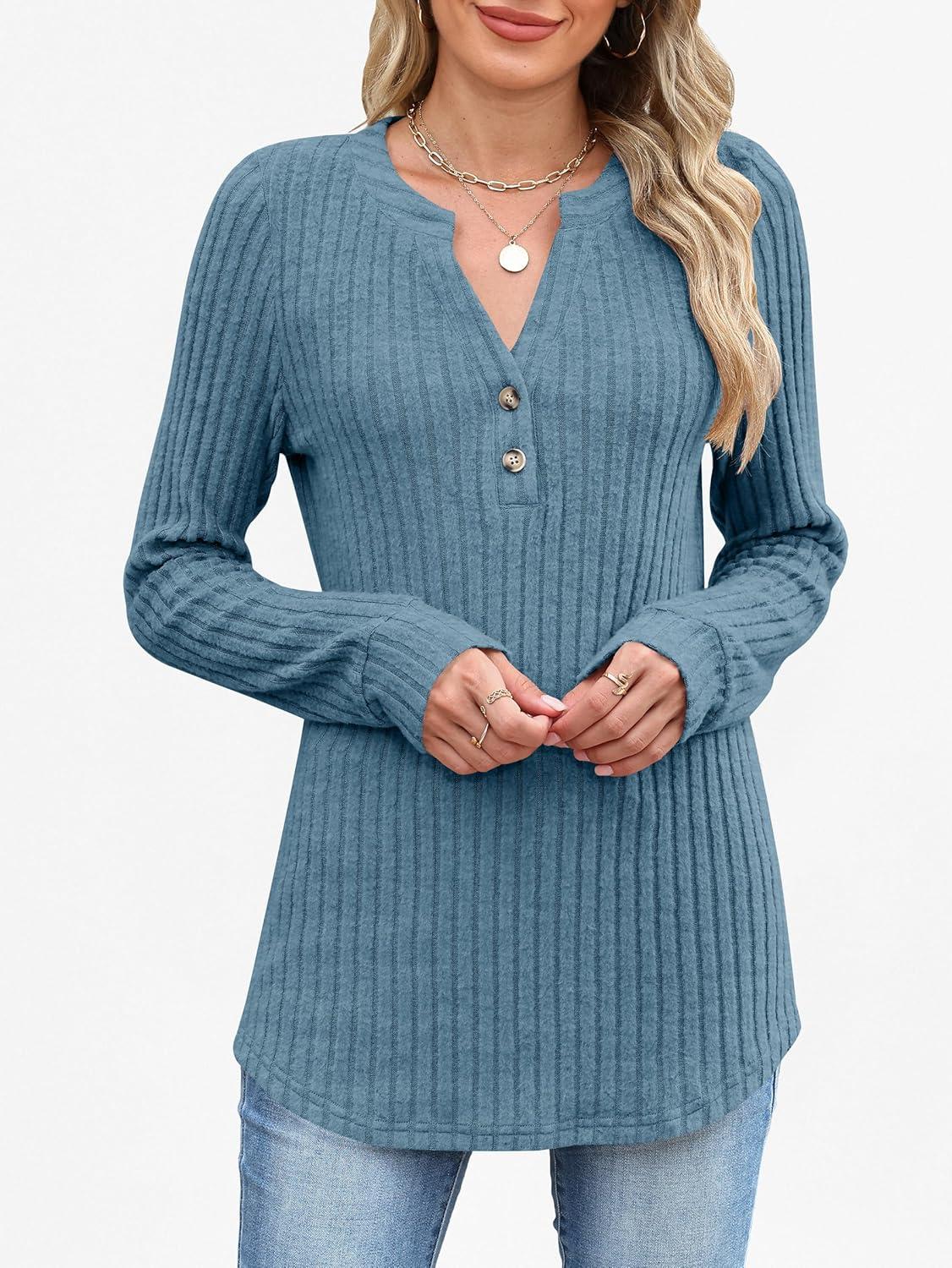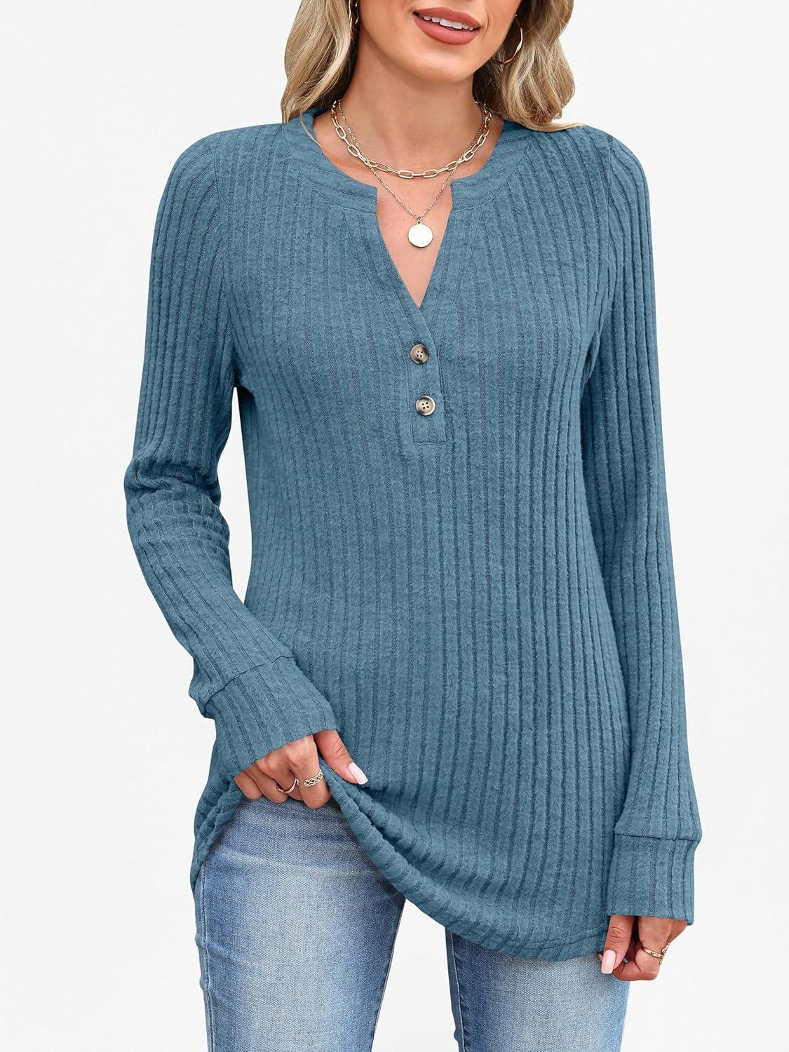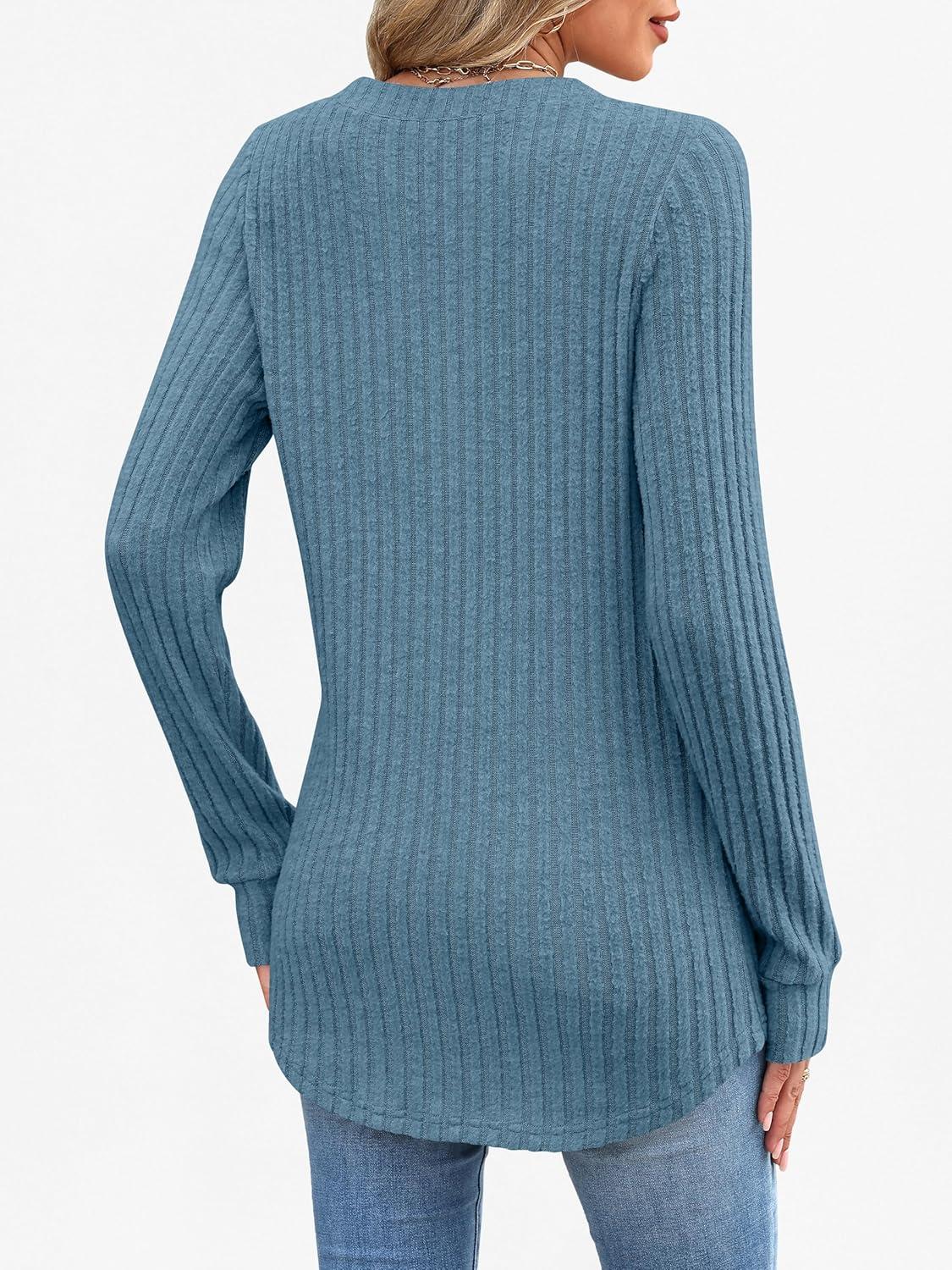 ANRABESS Womens Long Sleeve Henley Shirts 2025 Fall Tunic Tops Ribbed Knit Lightweight Sweaters Dressy Casual Blouse Outfits(Teal)