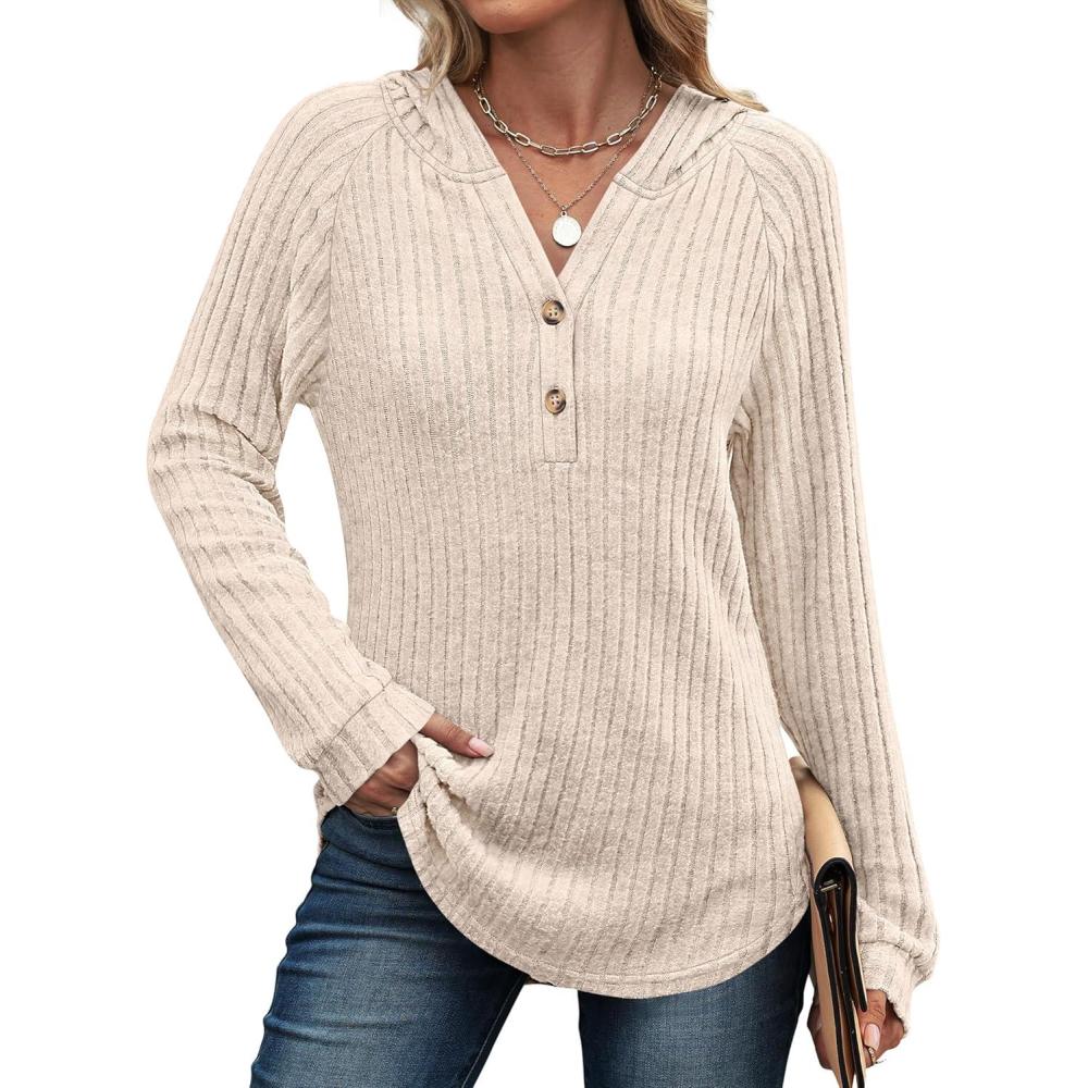 ANRABESS Womens Long Sleeve Henley Tops Ribbed Knit Hoodie Shirts 2025 Fall Loose Fit Lightweight Hooded Sweaters(Light Khaki)