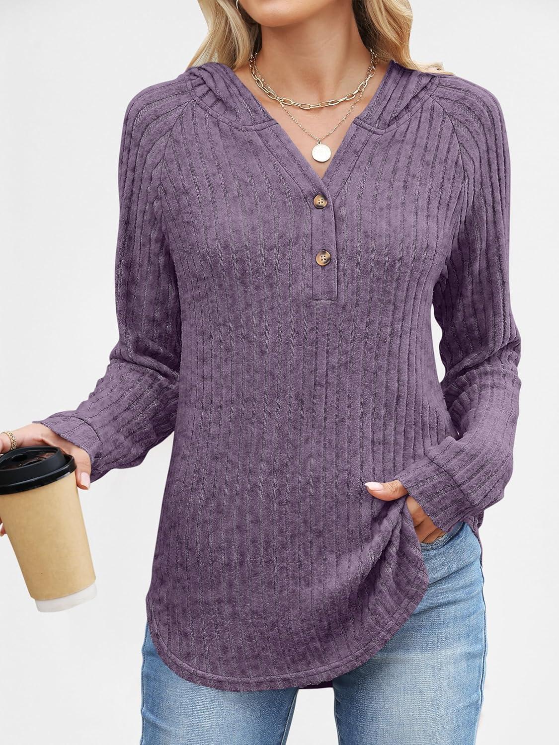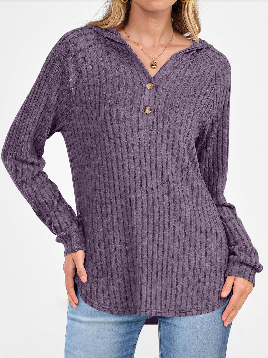 ANRABESS Womens Long Sleeve Henley Tops Ribbed Knit Hoodie Shirts 2025 Fall Loose Fit Lightweight Hooded Sweaters(Purple)