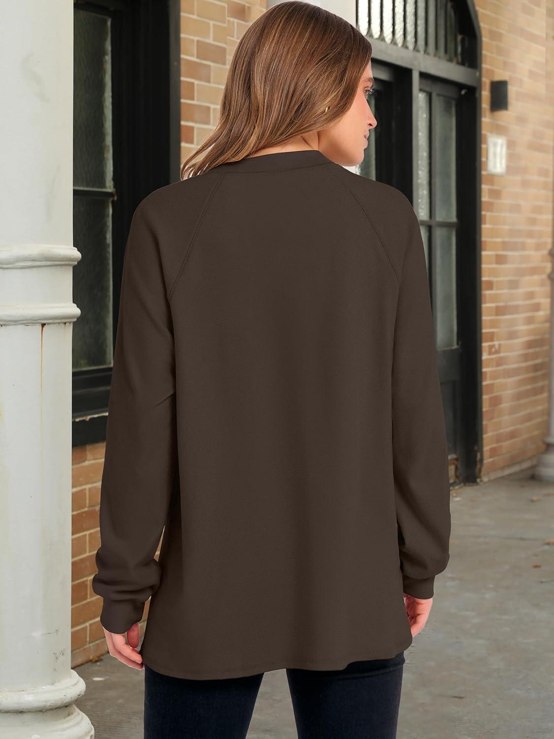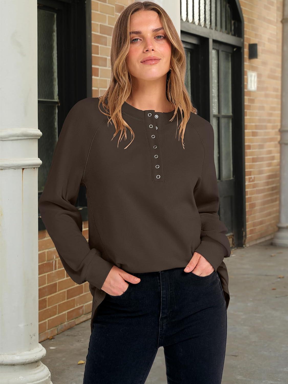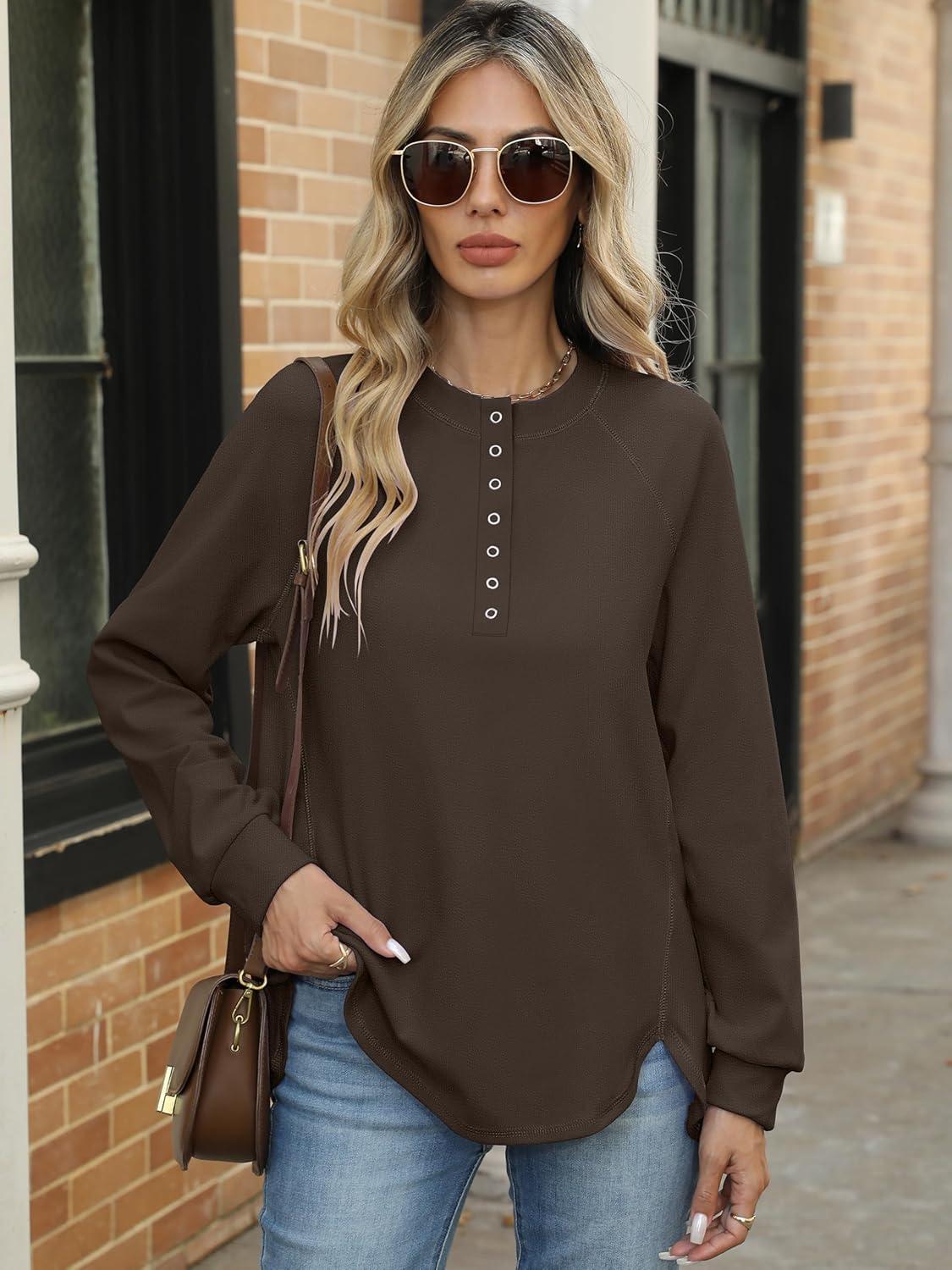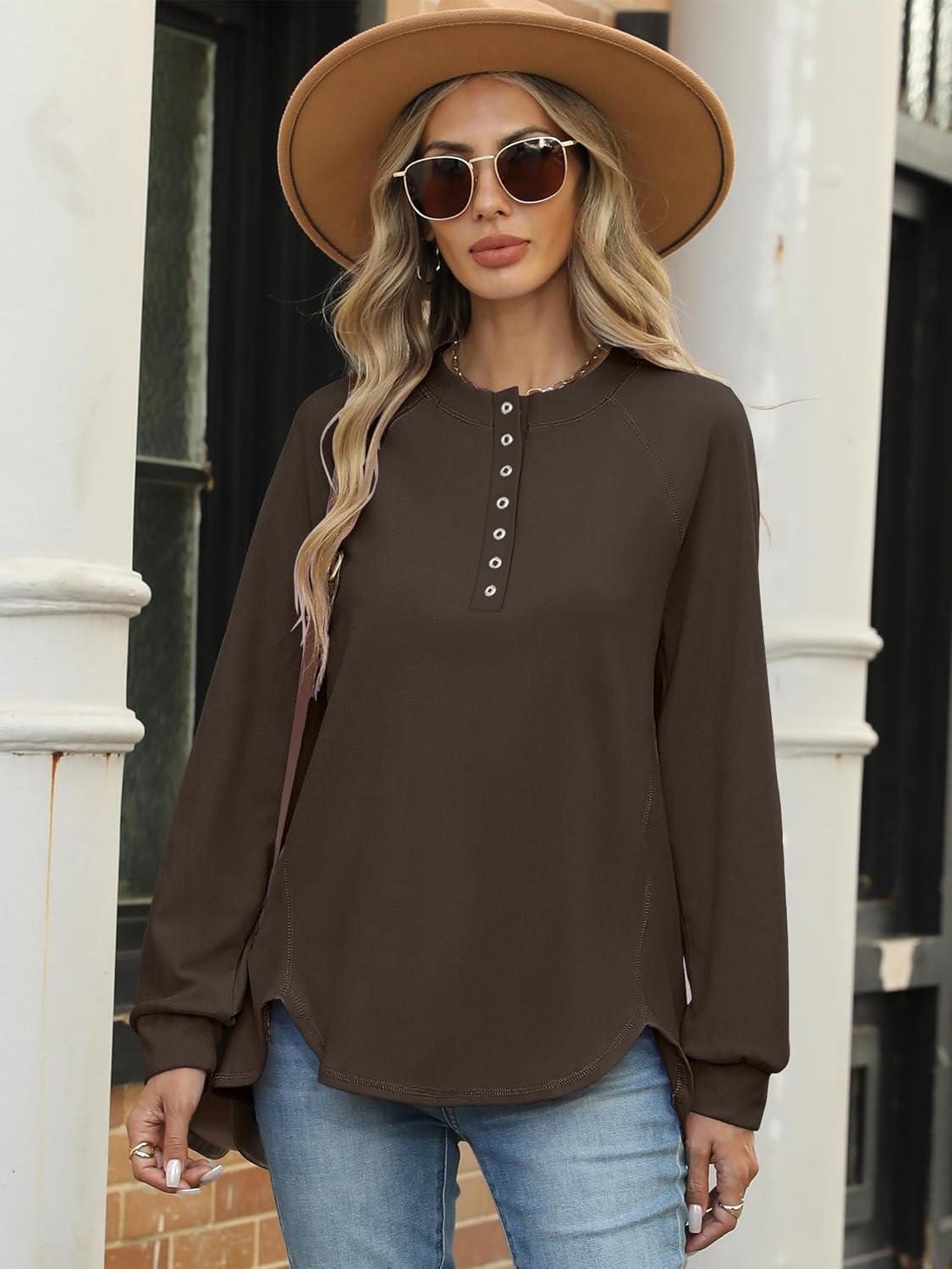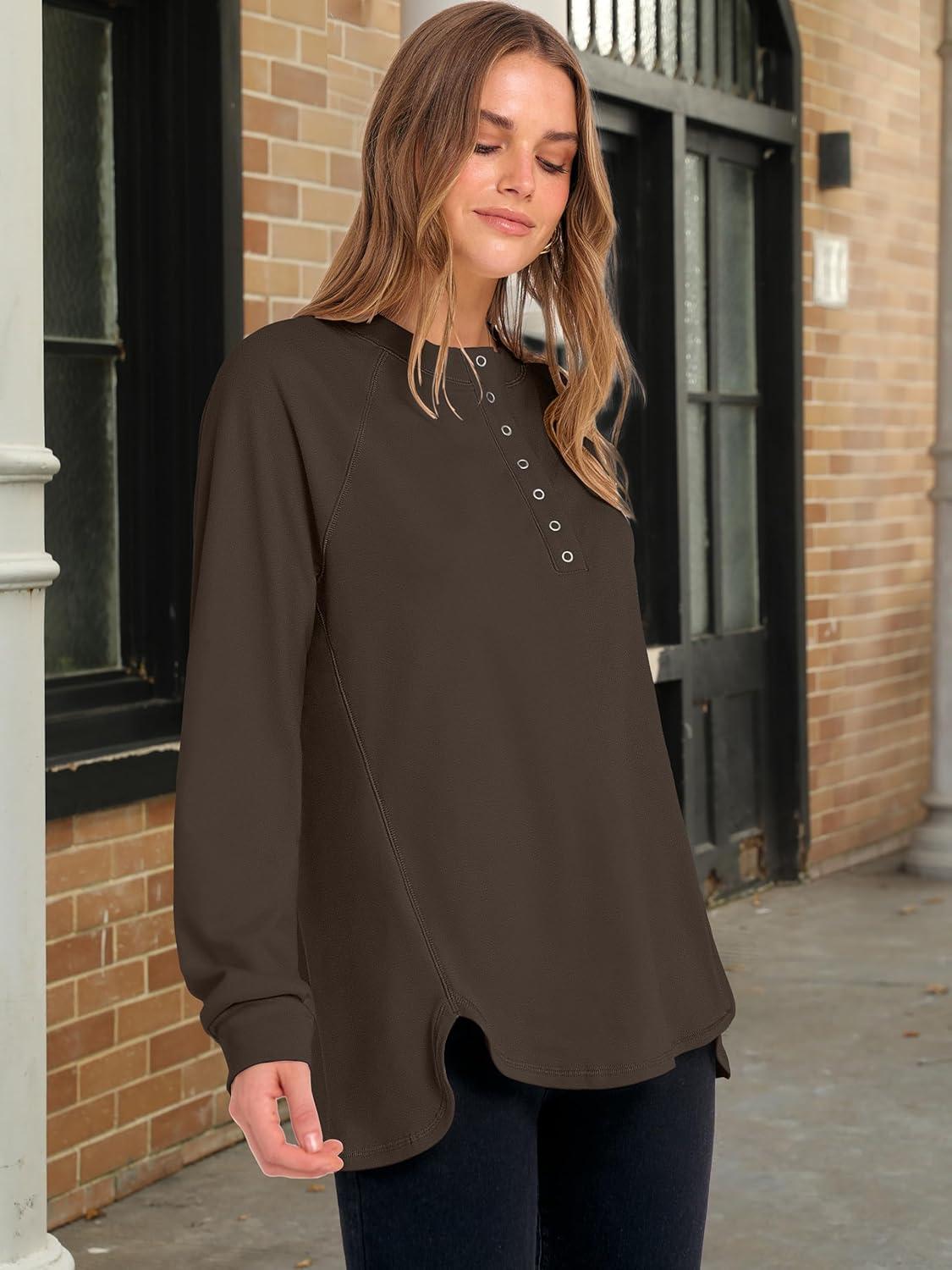 ANRABESS Women’s Long Sleeve Henley Tops Tunic Sweatshirt Loose Slit Casual Button Shirts Pullover 2025 Fall Winter Outfits(Brown)