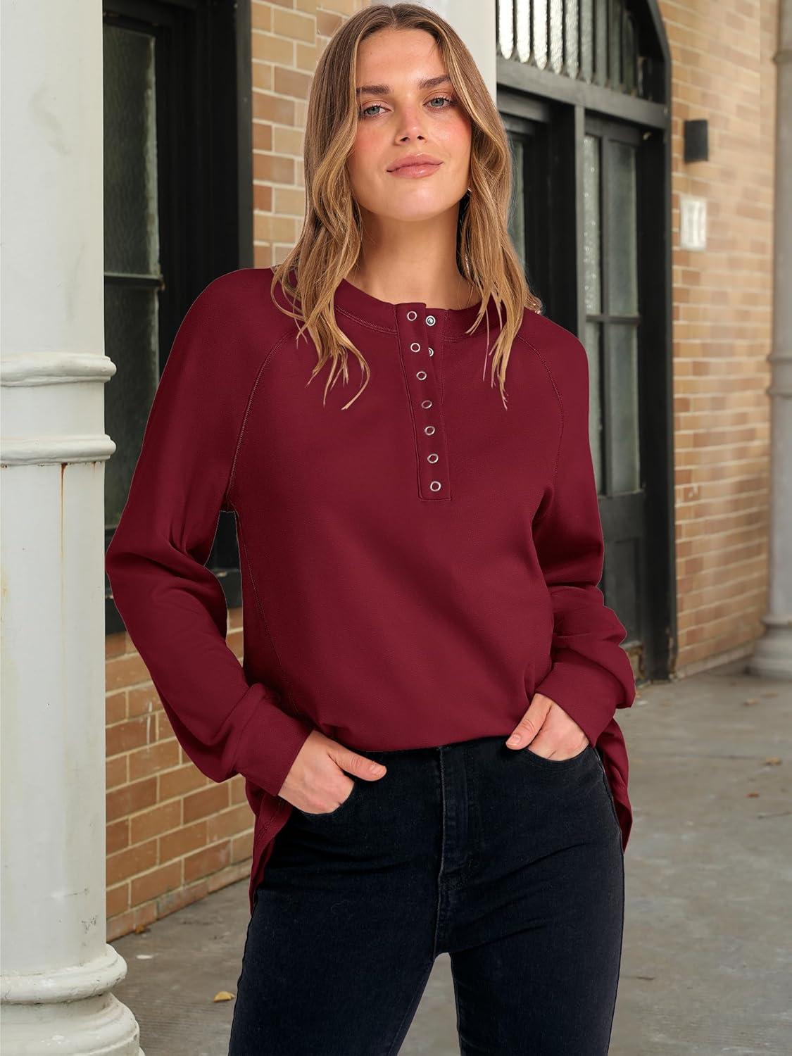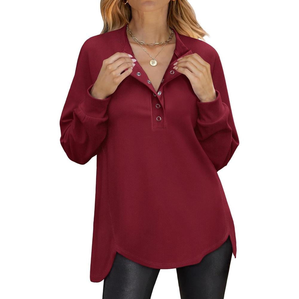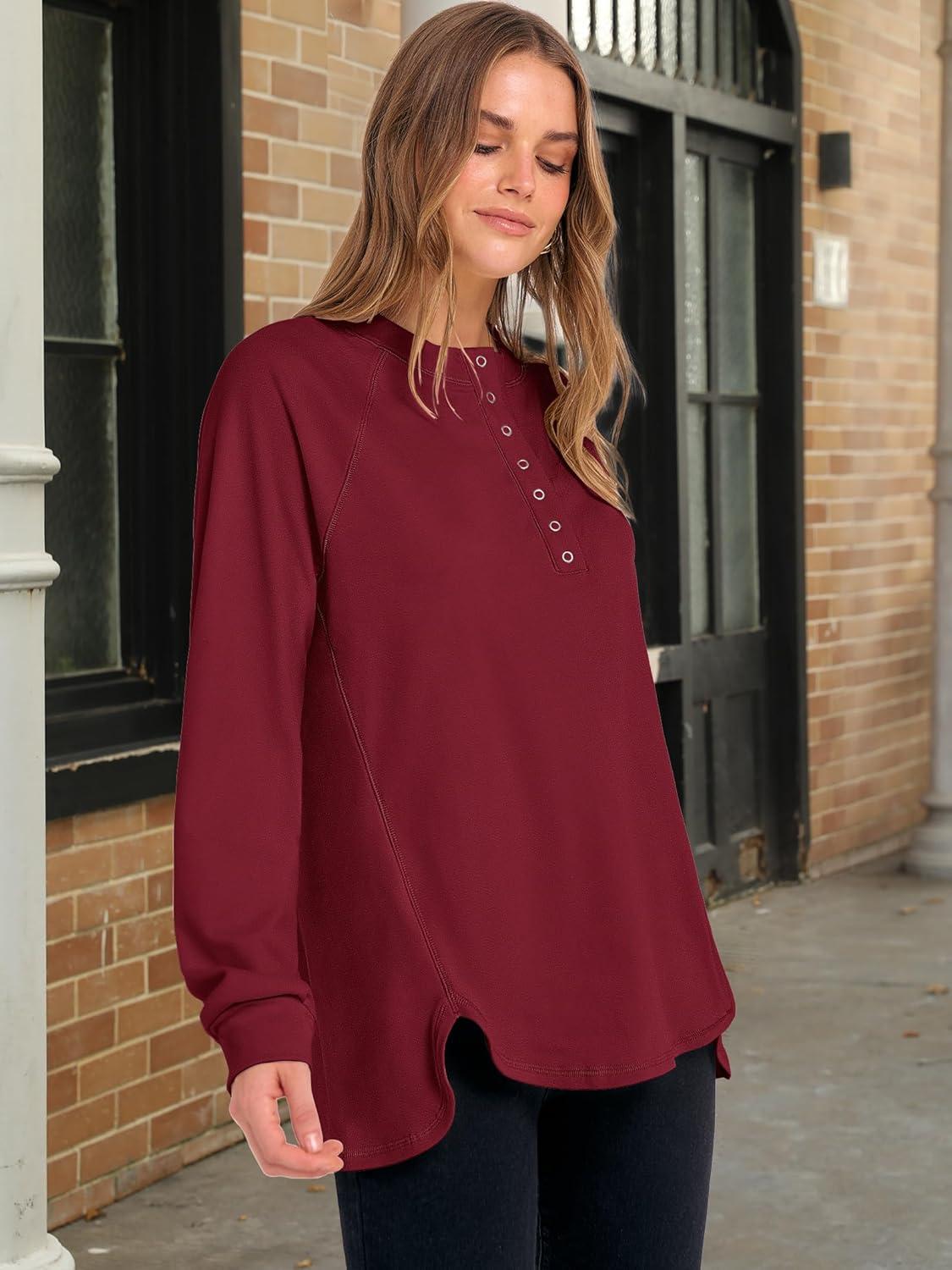 ANRABESS Women’s Long Sleeve Henley Tops Tunic Sweatshirt Loose Slit Casual Button Shirts Pullover 2025 Fall Winter Outfits(Red)