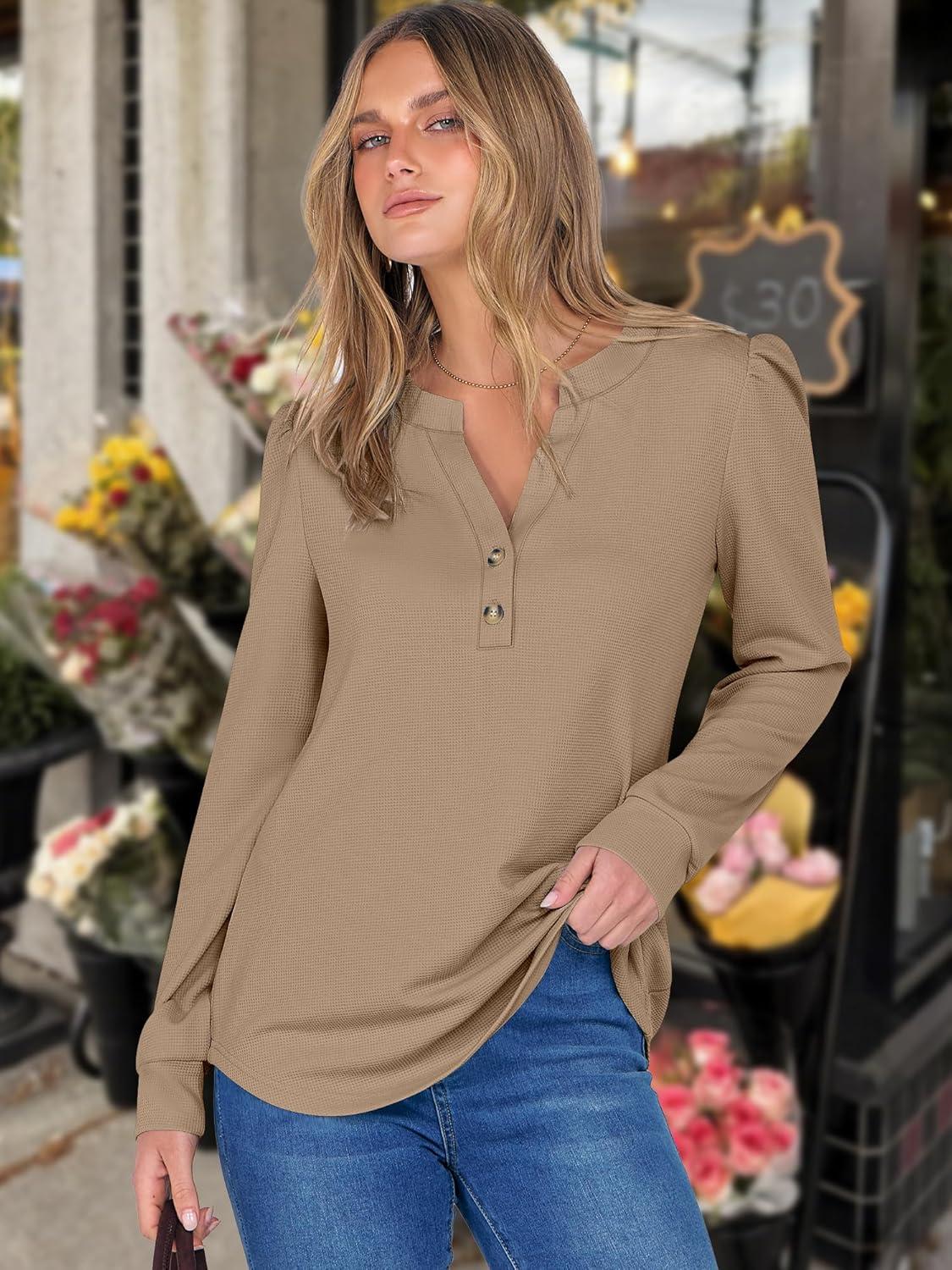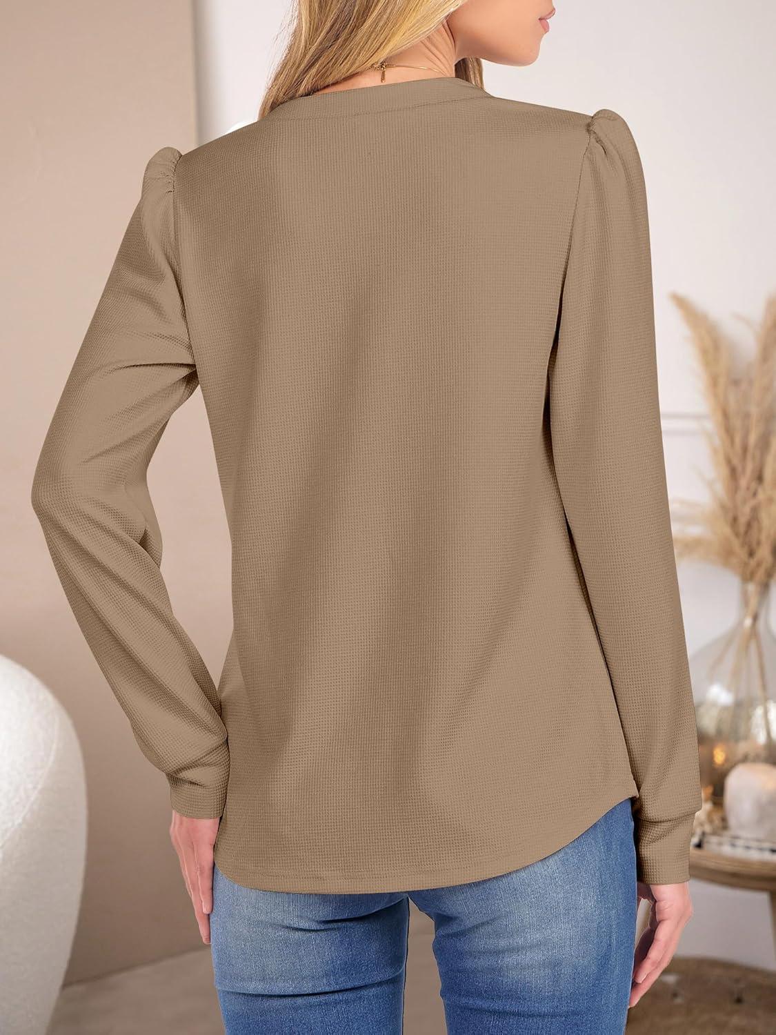 ANRABESS Women's Long Sleeve Henley Tops Waffle Knit Tunics Shirts Dressy Casual Blouses Cute T-Shirts 2025 Fall Outfit(Tan)