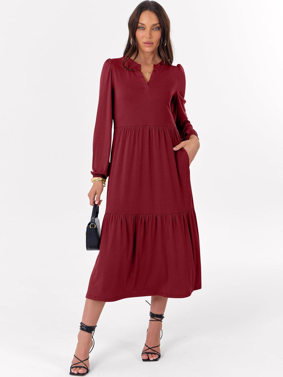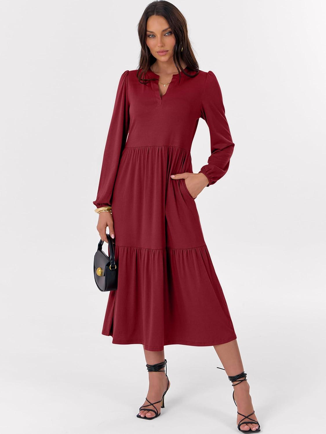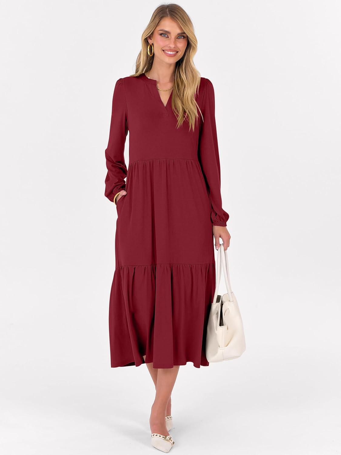 ANRABESS Women’s Long Sleeve Maxi Dresses 2025 Fall Casual V Neck Flowy Tiered Boho Modest Trendy Vacation Dress with Pockets(Deep Red)