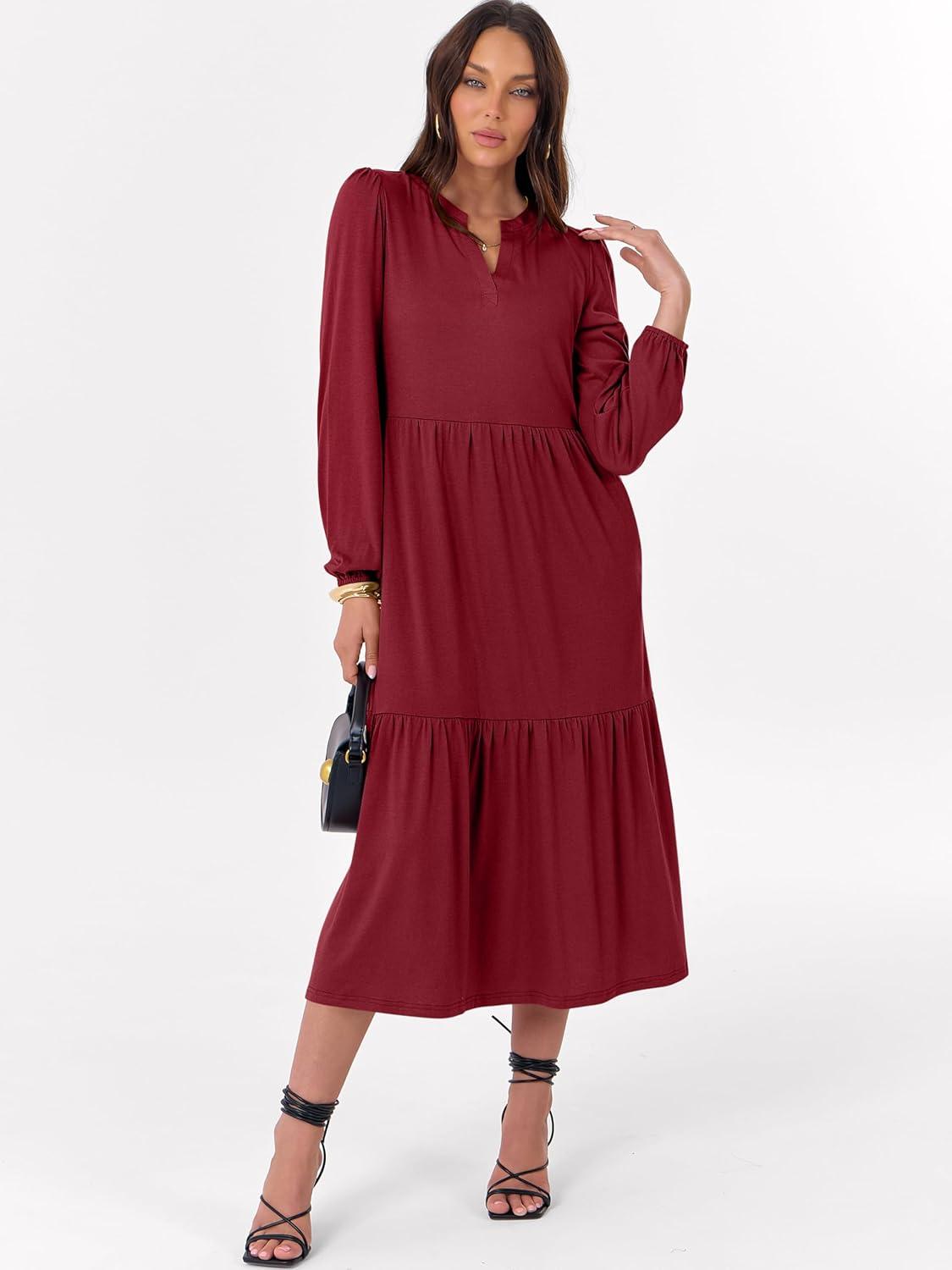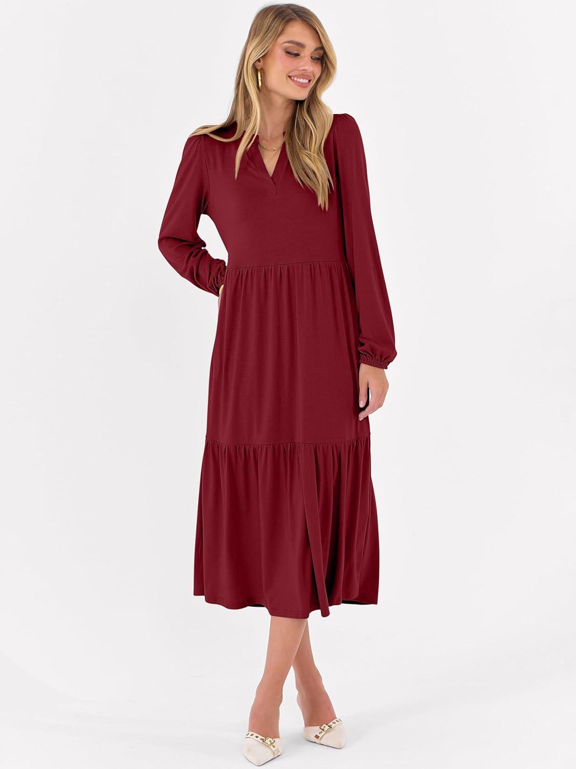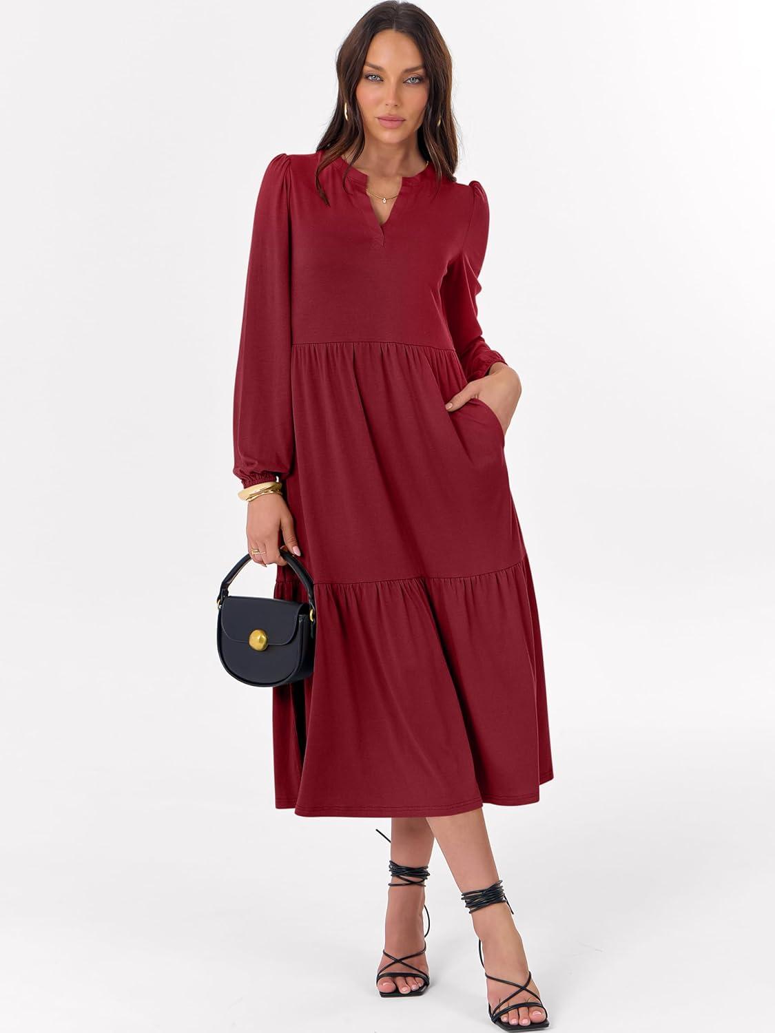 ANRABESS Women’s Long Sleeve Maxi Dresses 2025 Fall Casual V Neck Flowy Tiered Boho Modest Trendy Vacation Dress with Pockets(Deep Red)