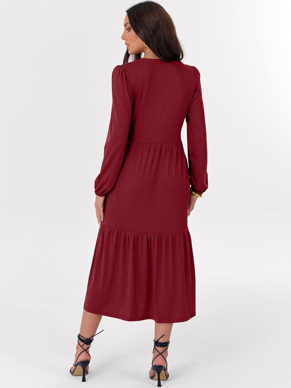 ANRABESS Women's Long Sleeve Maxi Dresses 2025 Fall Casual V Neck Flowy Tiered Boho Modest Trendy Vacation Dress with Pockets(Deep Red)