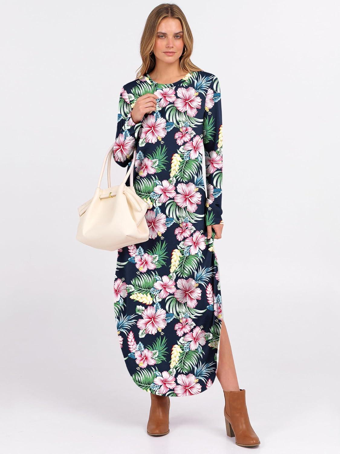 ANRABESS Women’s Long Sleeve Maxi Dresses 2025 Fall Outfits Casual Loose Split Travel Vacation T Shirt Dress with Pockets(Floral Blue White)