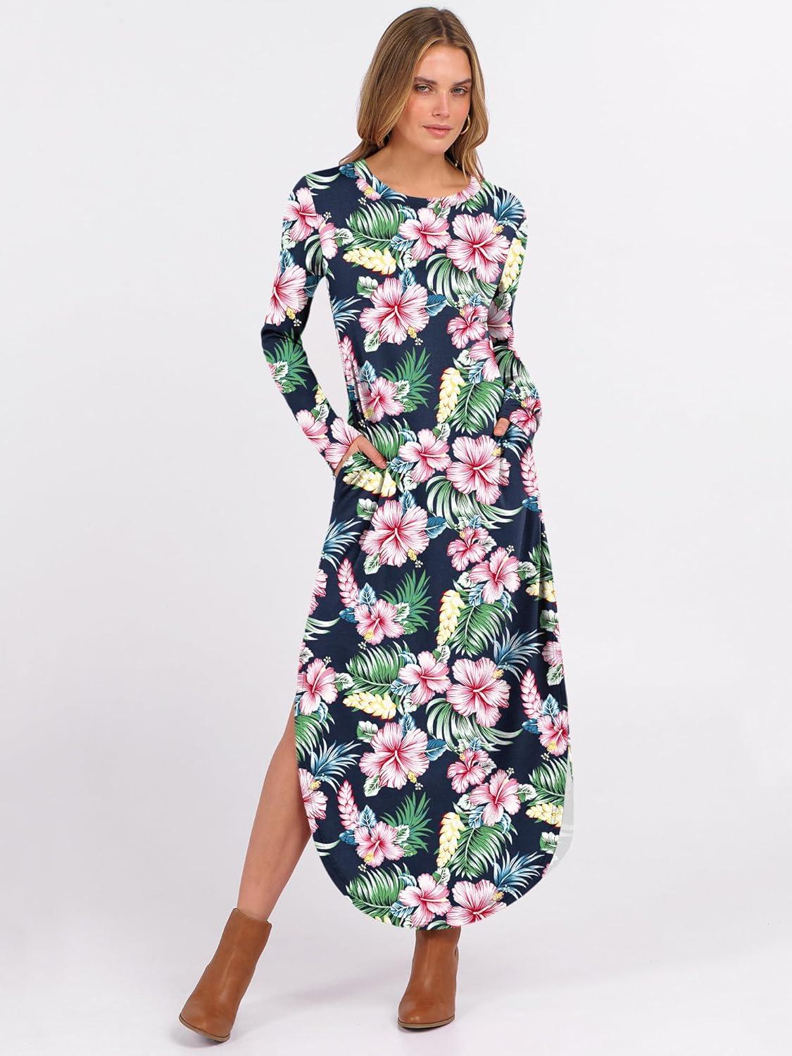 ANRABESS Women's Long Sleeve Maxi Dresses 2025 Fall Outfits Casual Loose Split Travel Vacation T Shirt Dress with Pockets(Floral Green Pink)