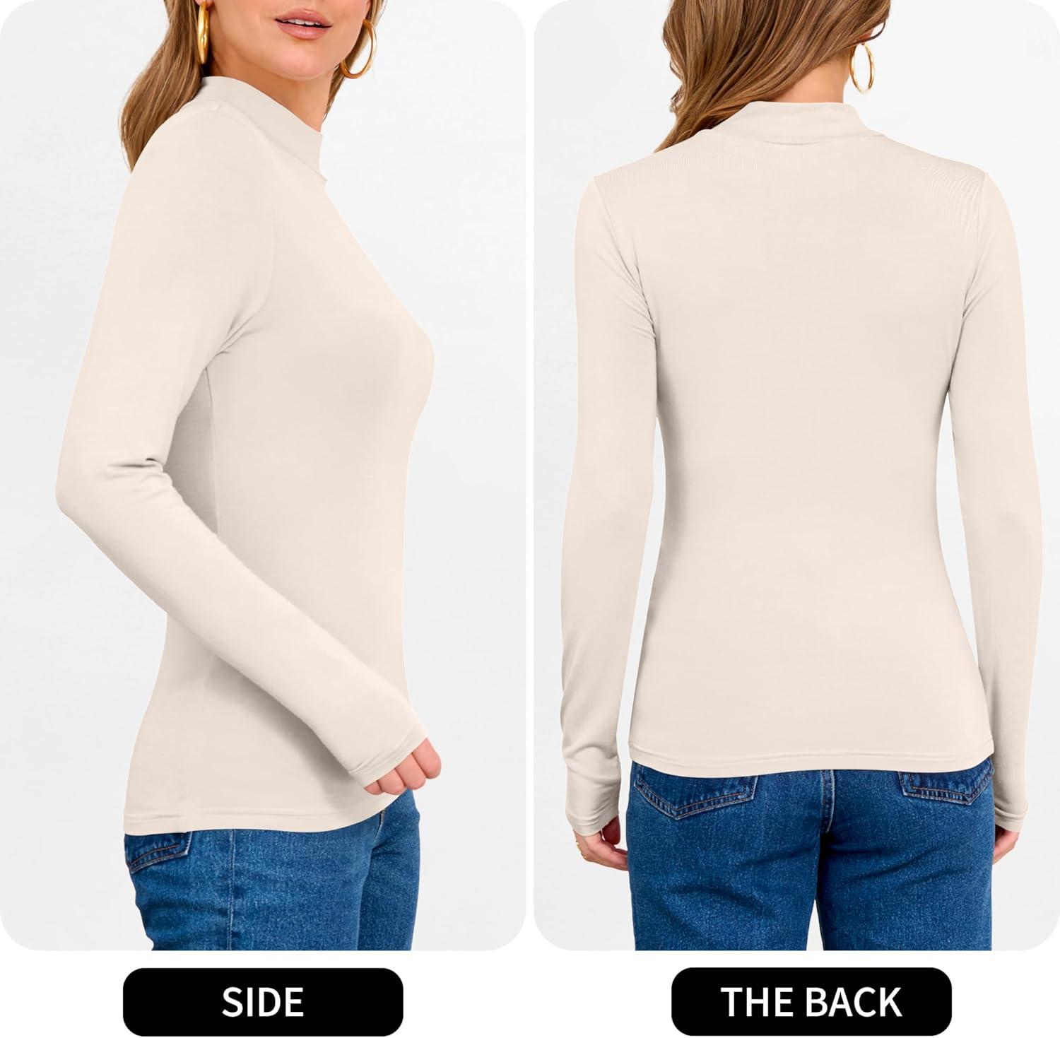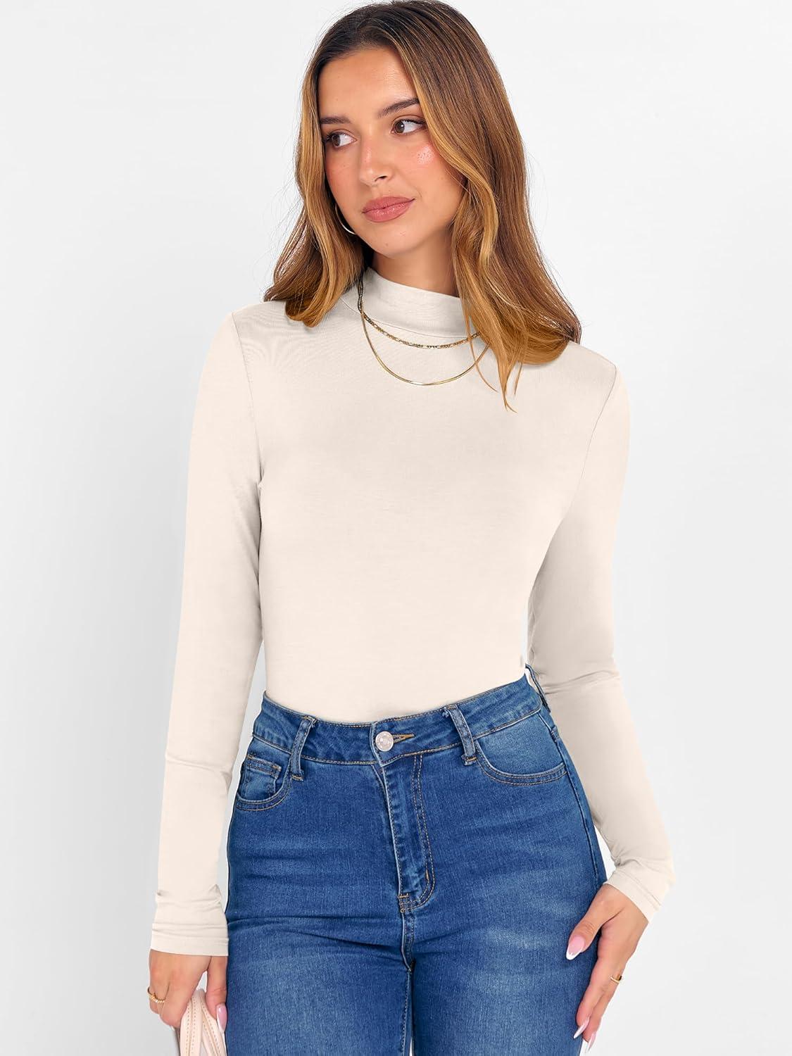 ANRABESS Womens Long Sleeve Mock Neck Tops Slim Fitted Basic Layer Office Work Shirts 2025 Fall Outfits Y2K Clothes(Beige)