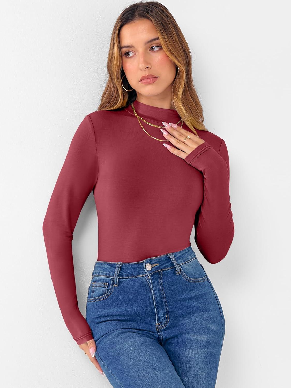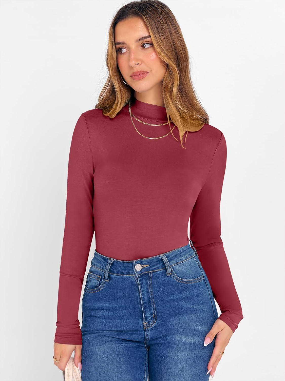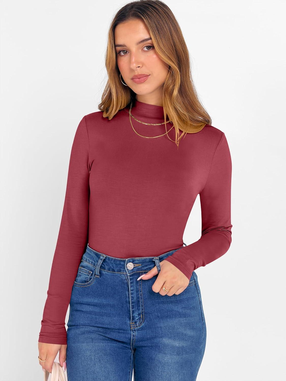 ANRABESS Womens Long Sleeve Mock Neck Tops Slim Fitted Basic Layer Office Work Shirts 2025 Fall Outfits Y2K Clothes(Burgundy)