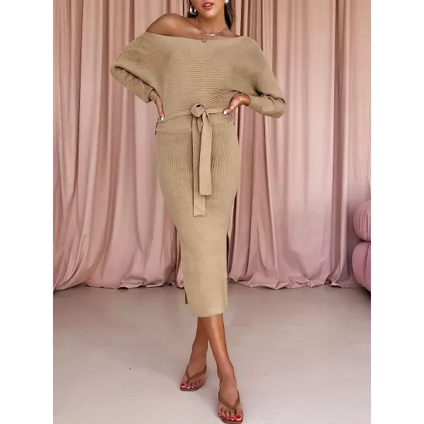 ANRABESS Women's Long Sleeve Off Shoulder Waist Belt Slim Fit Ribbed Knitted Cozy Slit Midi Sweater Dress(Khaki)