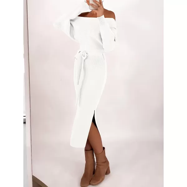 ANRABESS Women's Long Sleeve Off Shoulder Waist Belt Slim Fit Ribbed Knitted Cozy Slit Midi Sweater Dress(White)