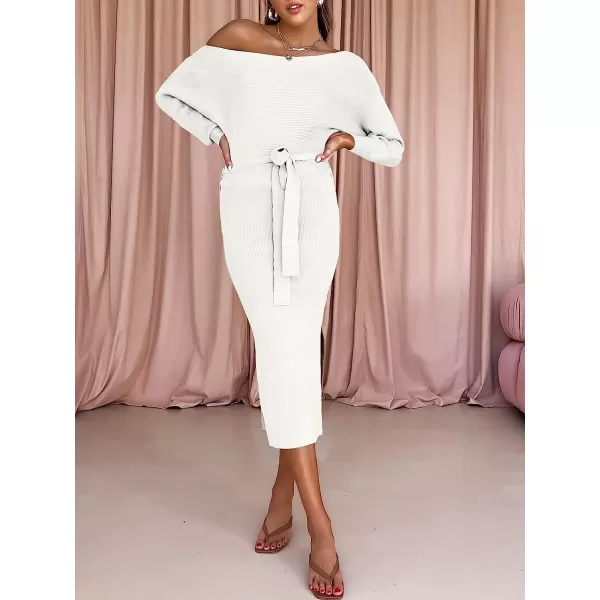 imageANRABESS Womens Long Sleeve Off Shoulder Waist Belt Slim Fit Ribbed Knitted Cozy Slit Midi Sweater DressWhite