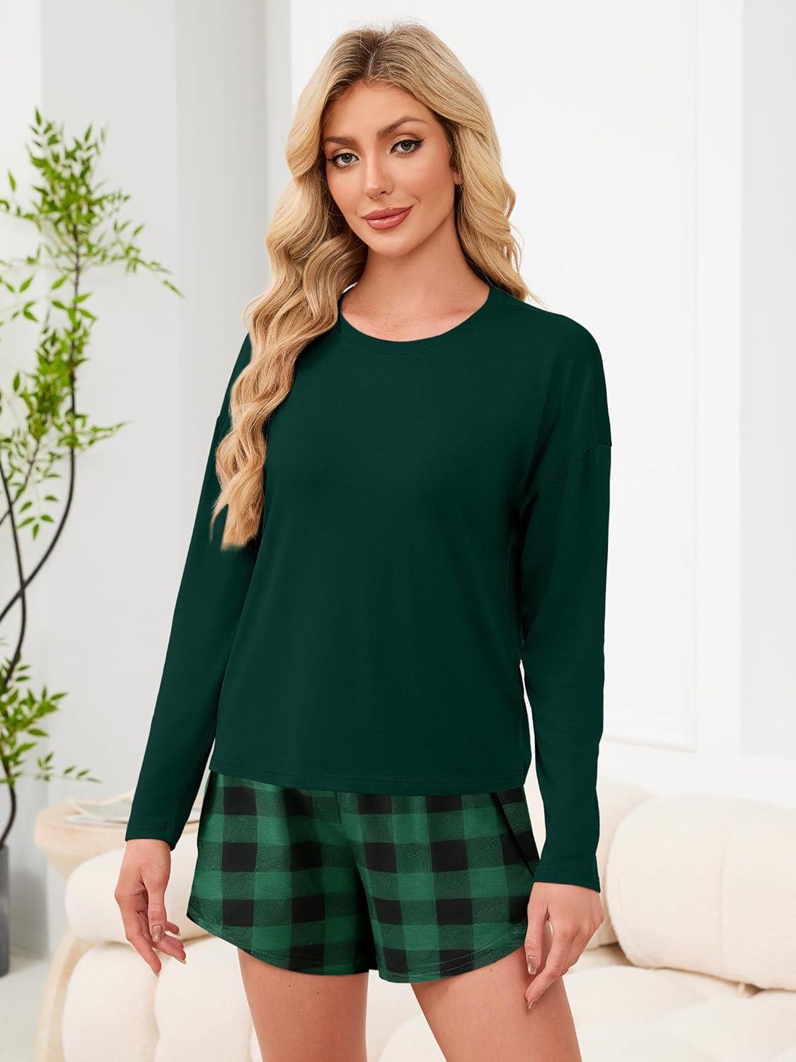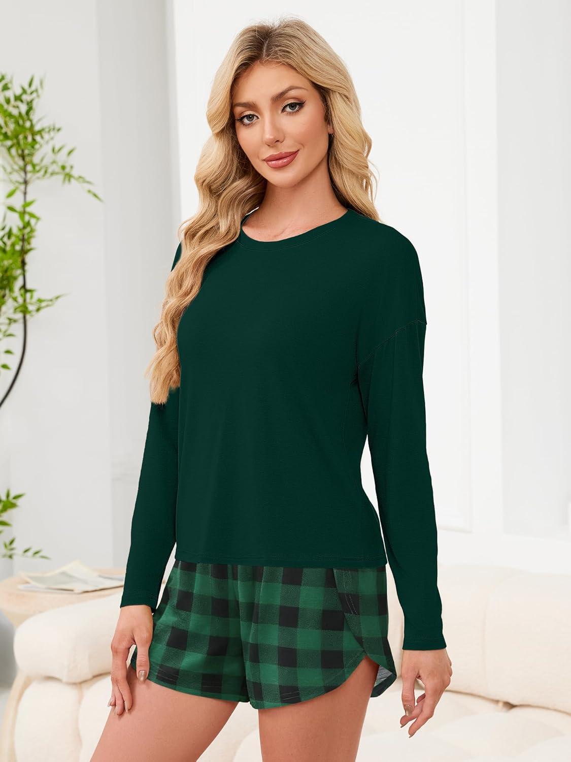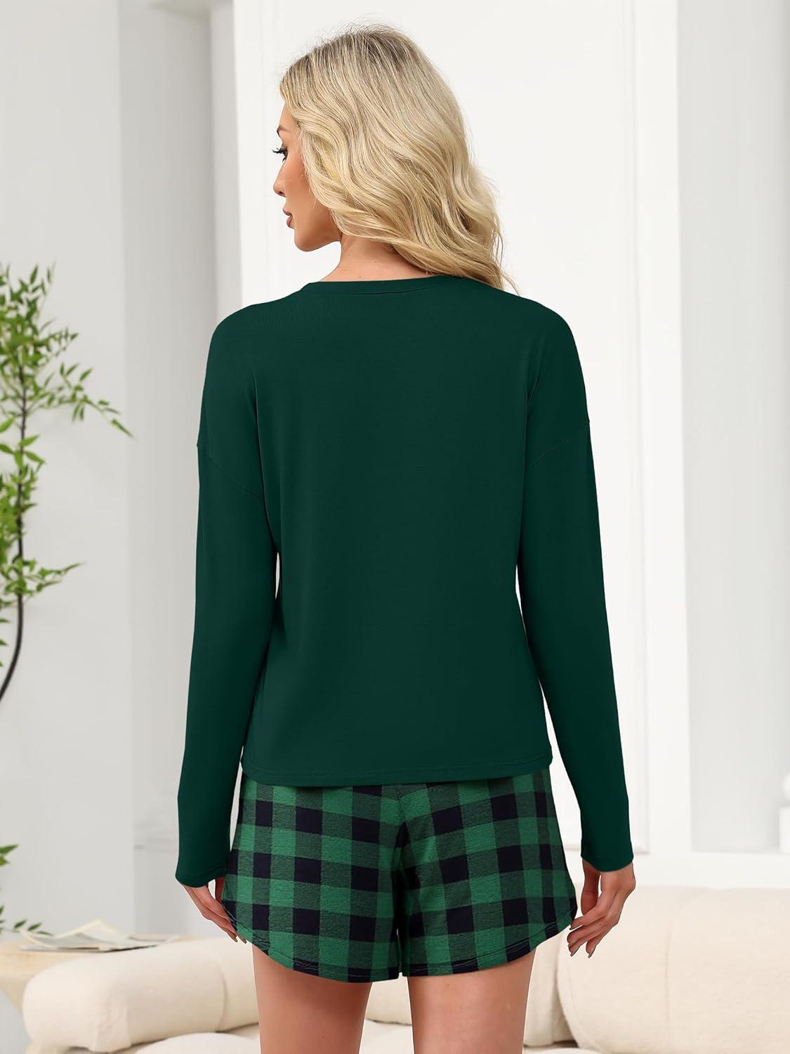 imageANRABESS Womens Long Sleeve Pajama Sets 2025 Fall 2 Piece Outfits Lounge Matching Short Set Striped Pjs Loungewear SleepwearGreen Plaid