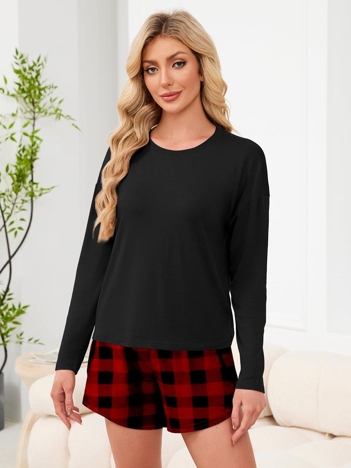 imageANRABESS Womens Long Sleeve Pajama Sets 2025 Fall 2 Piece Outfits Lounge Matching Short Set Striped Pjs Loungewear SleepwearRed Plaid