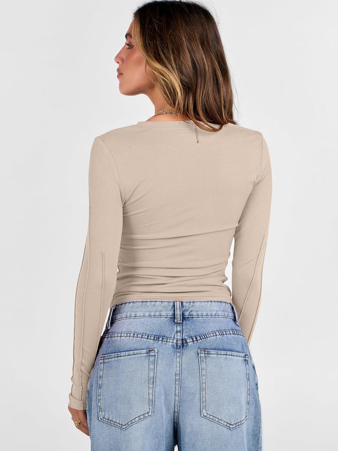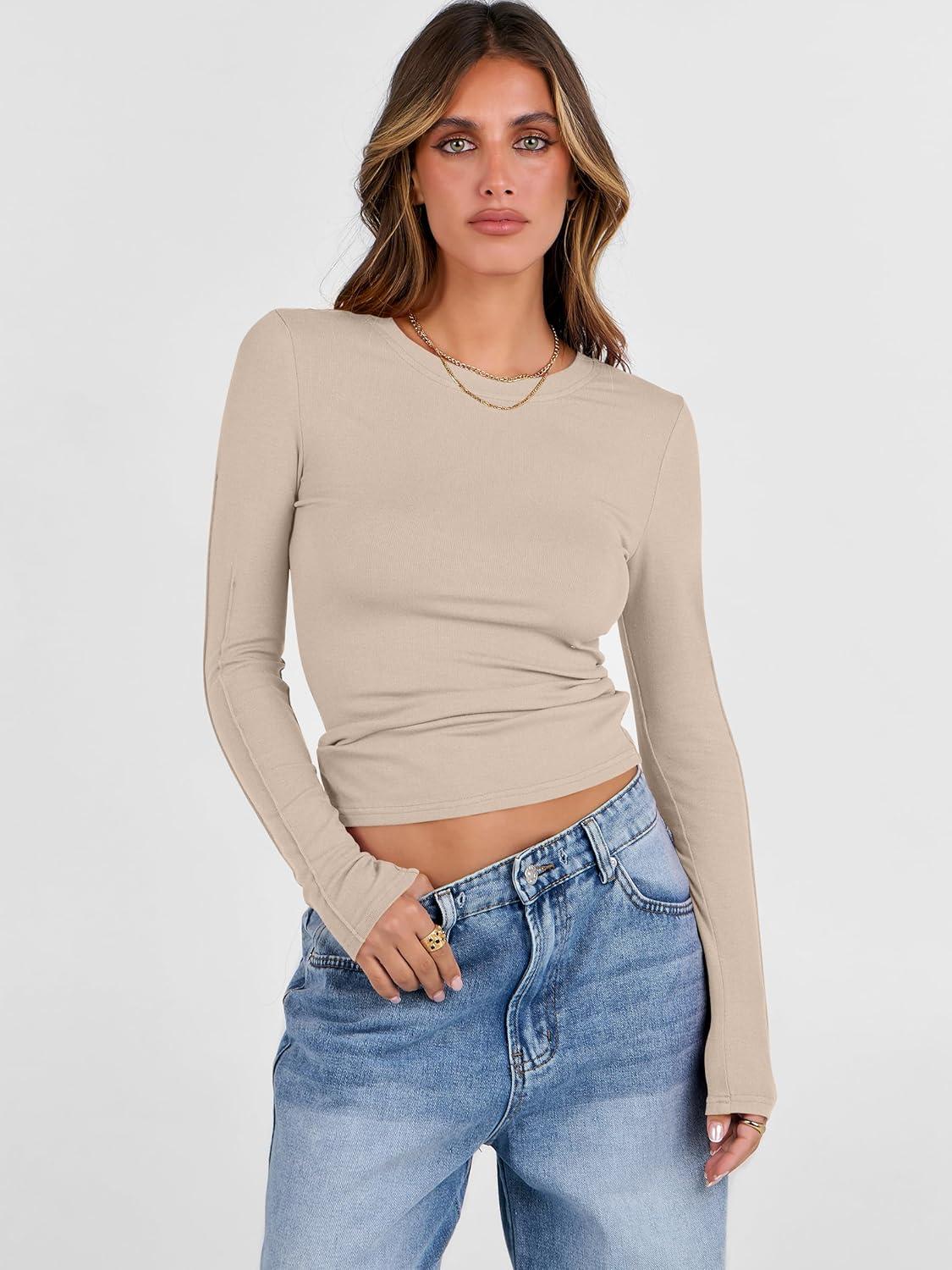 ANRABESS Womens Long Sleeve Shirts Crew Neck Fitted Knit Casual T-Shirt Going Out Tops Basic Tees Fall Fashion Outfits 2025(Khaki)