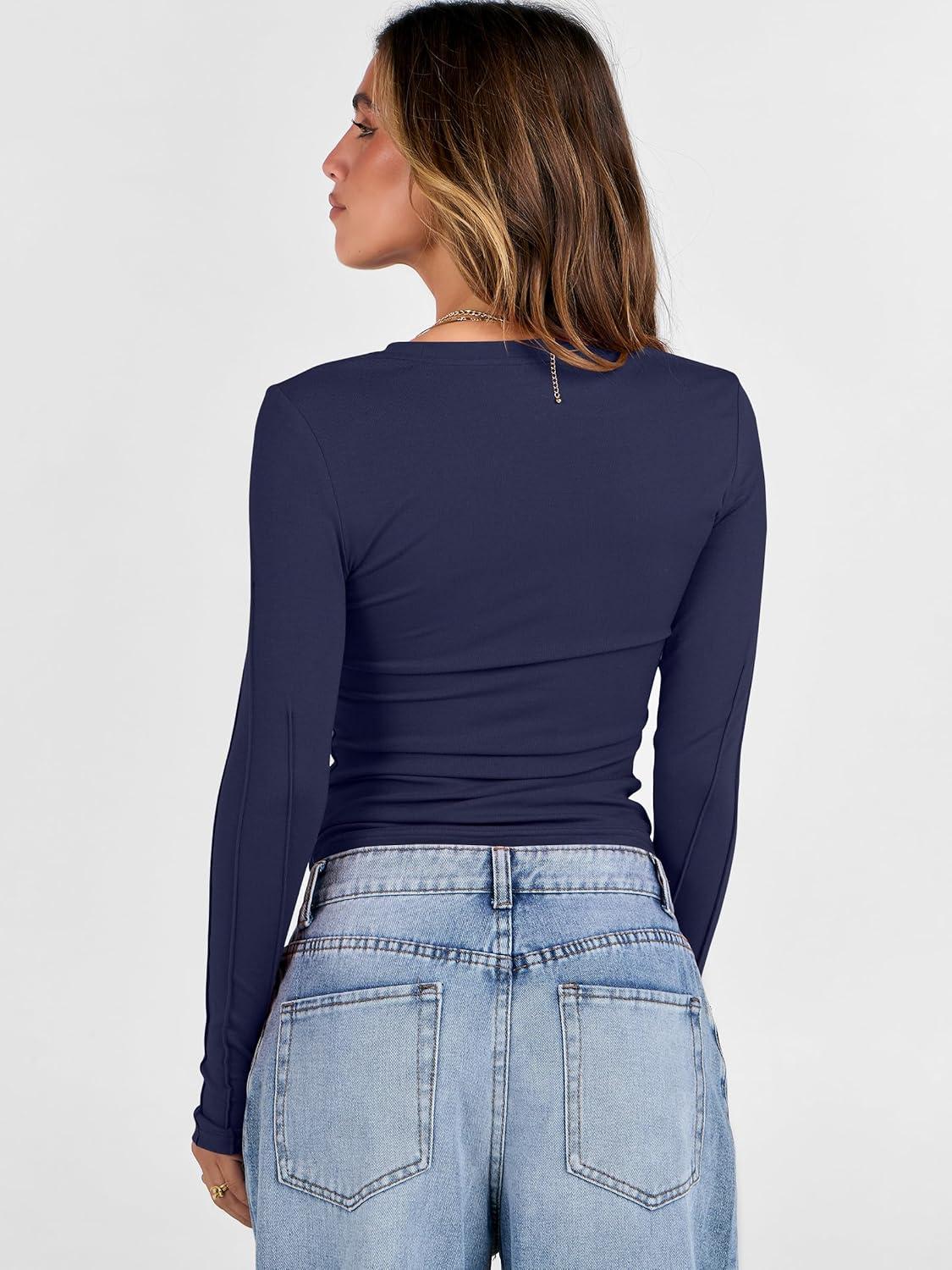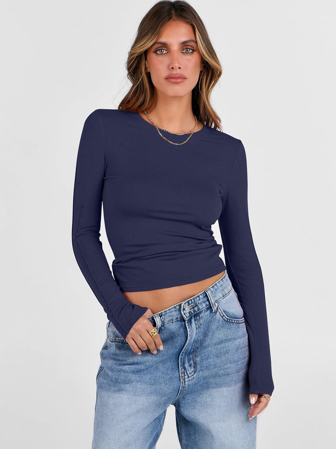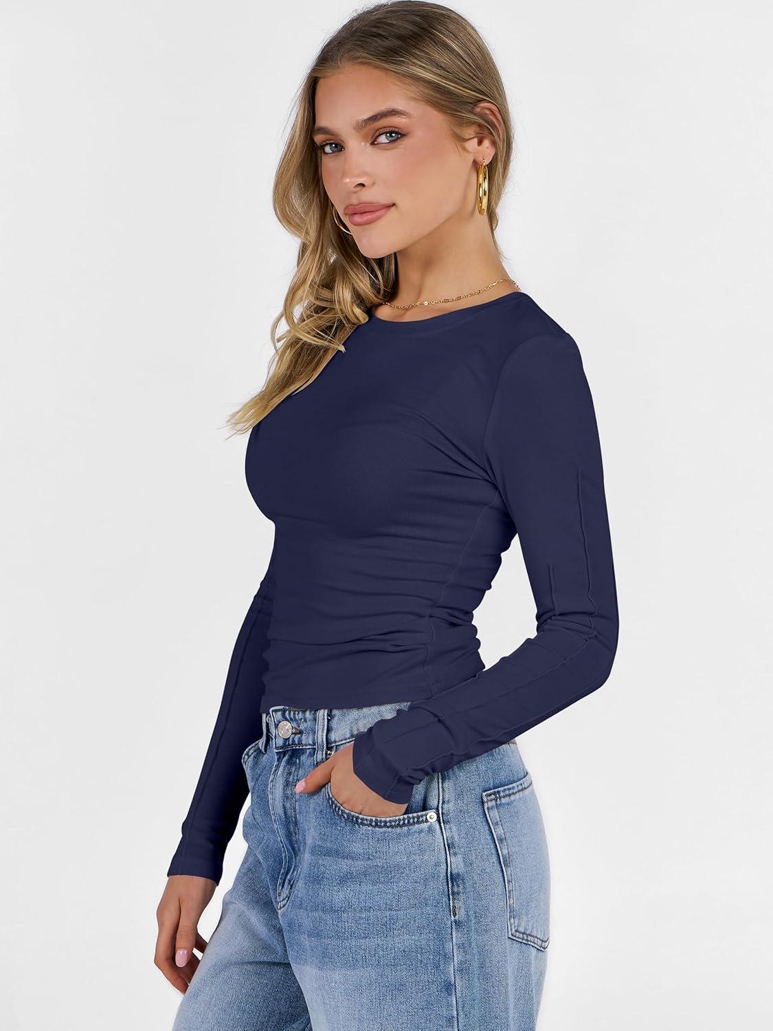 ANRABESS Womens Long Sleeve Shirts Crew Neck Fitted Knit Casual T-Shirt Going Out Tops Basic Tees Fall Fashion Outfits 2025(Navy Blue)