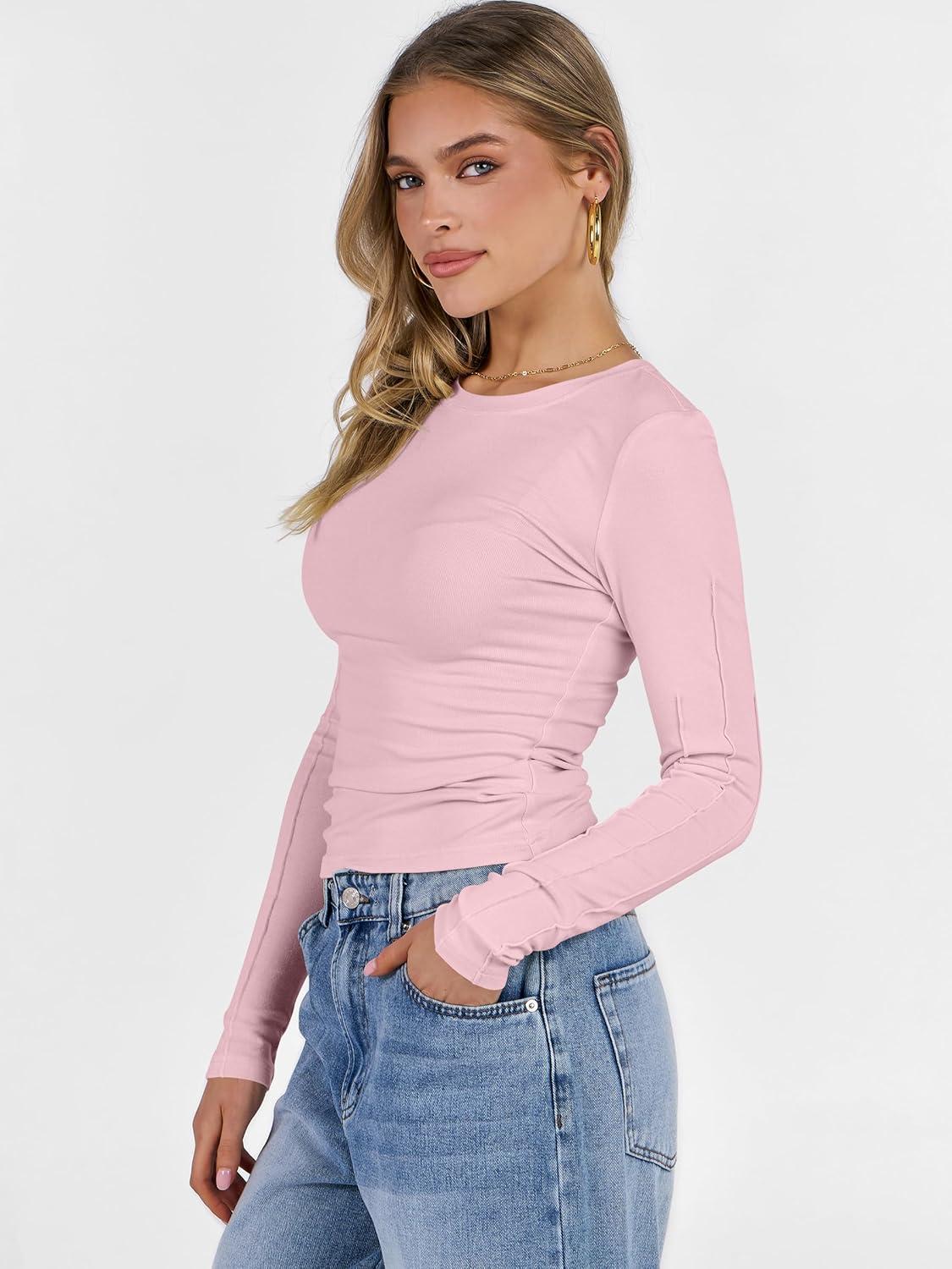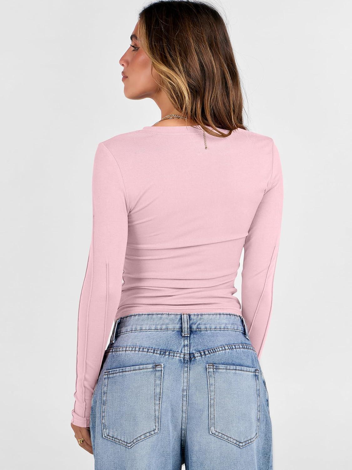 ANRABESS Womens Long Sleeve Shirts Crew Neck Fitted Knit Casual T-Shirt Going Out Tops Basic Tees Fall Fashion Outfits 2025(Pink)