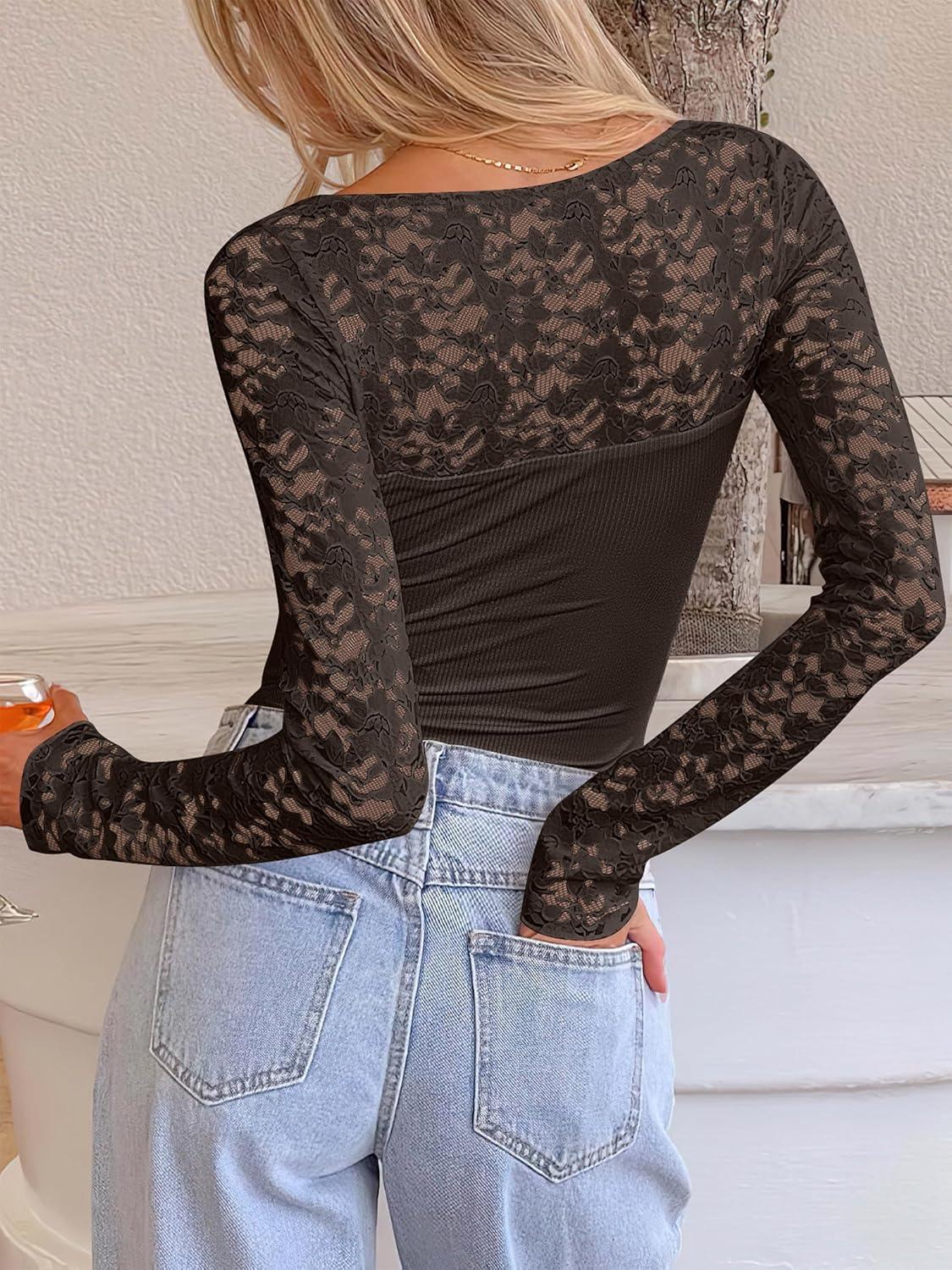 ANRABESS Womens Long Sleeve Shirts Scoop Neck Lace Going Out Tops Slim Fit Rib Knit Casual Blouses 2025 Fall Fashion Outfits(Coffee)