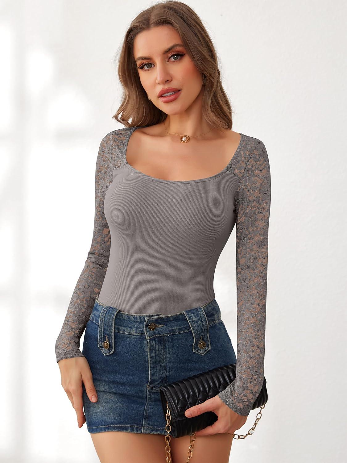 imageANRABESS Womens Long Sleeve Shirts Scoop Neck Lace Going Out Tops Slim Fit Rib Knit Casual Blouses 2025 Fall Fashion OutfitsDark Khaki