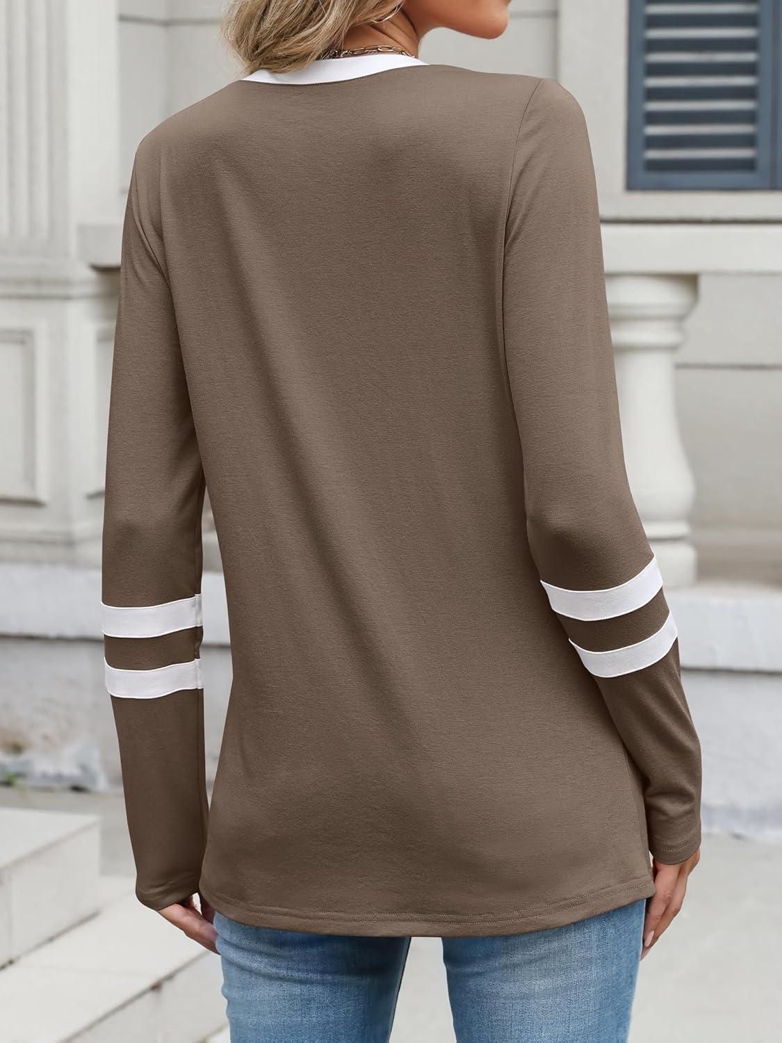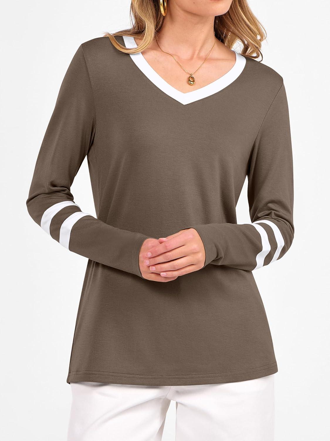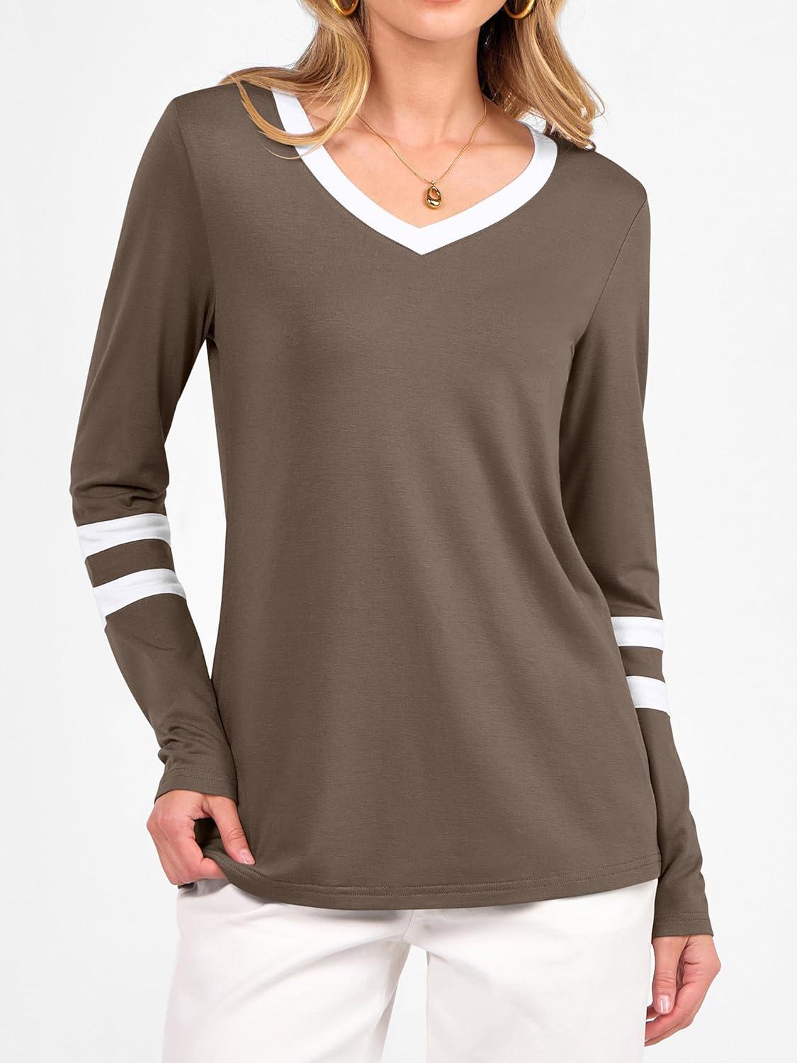 ANRABESS Womens Long Sleeve Shirts V Neck Color Block Basic Tshirt 2025 Fall Casual Striped Tee Tunics Tops Trendy Outfits(Brown)