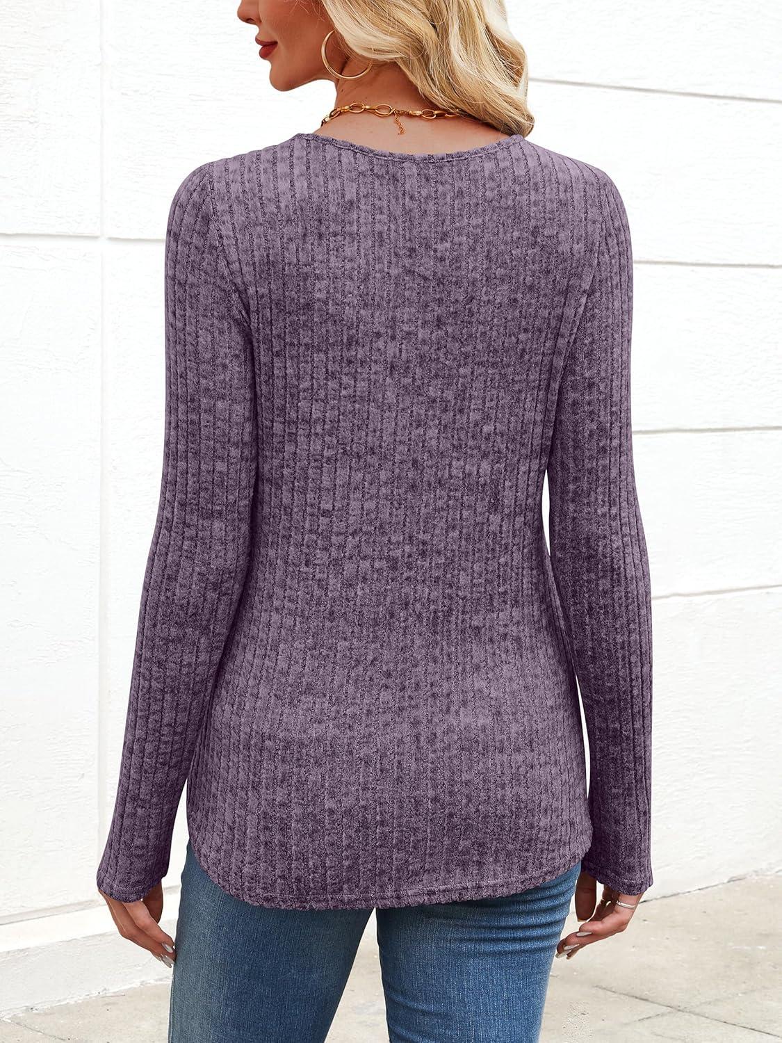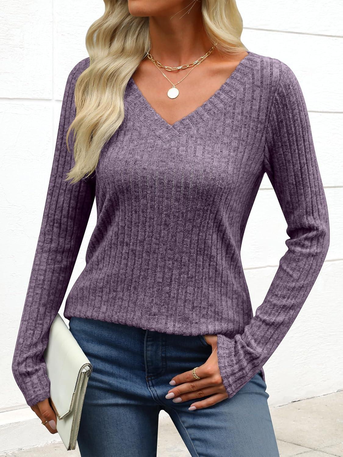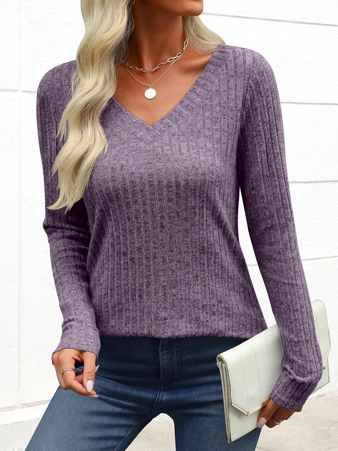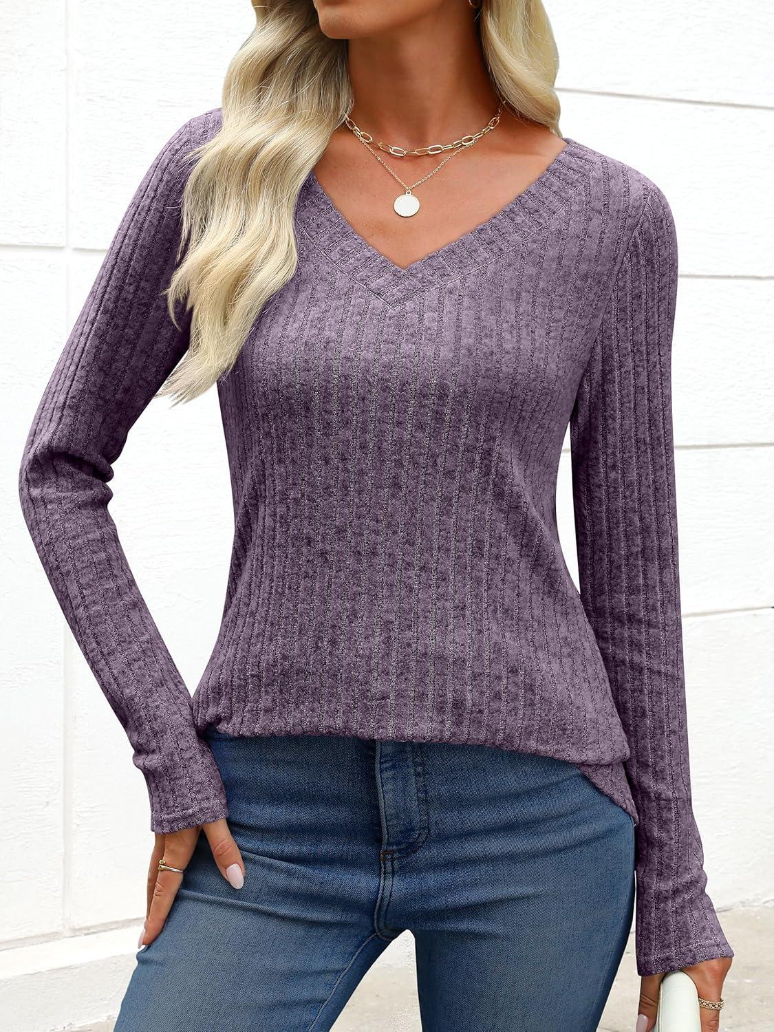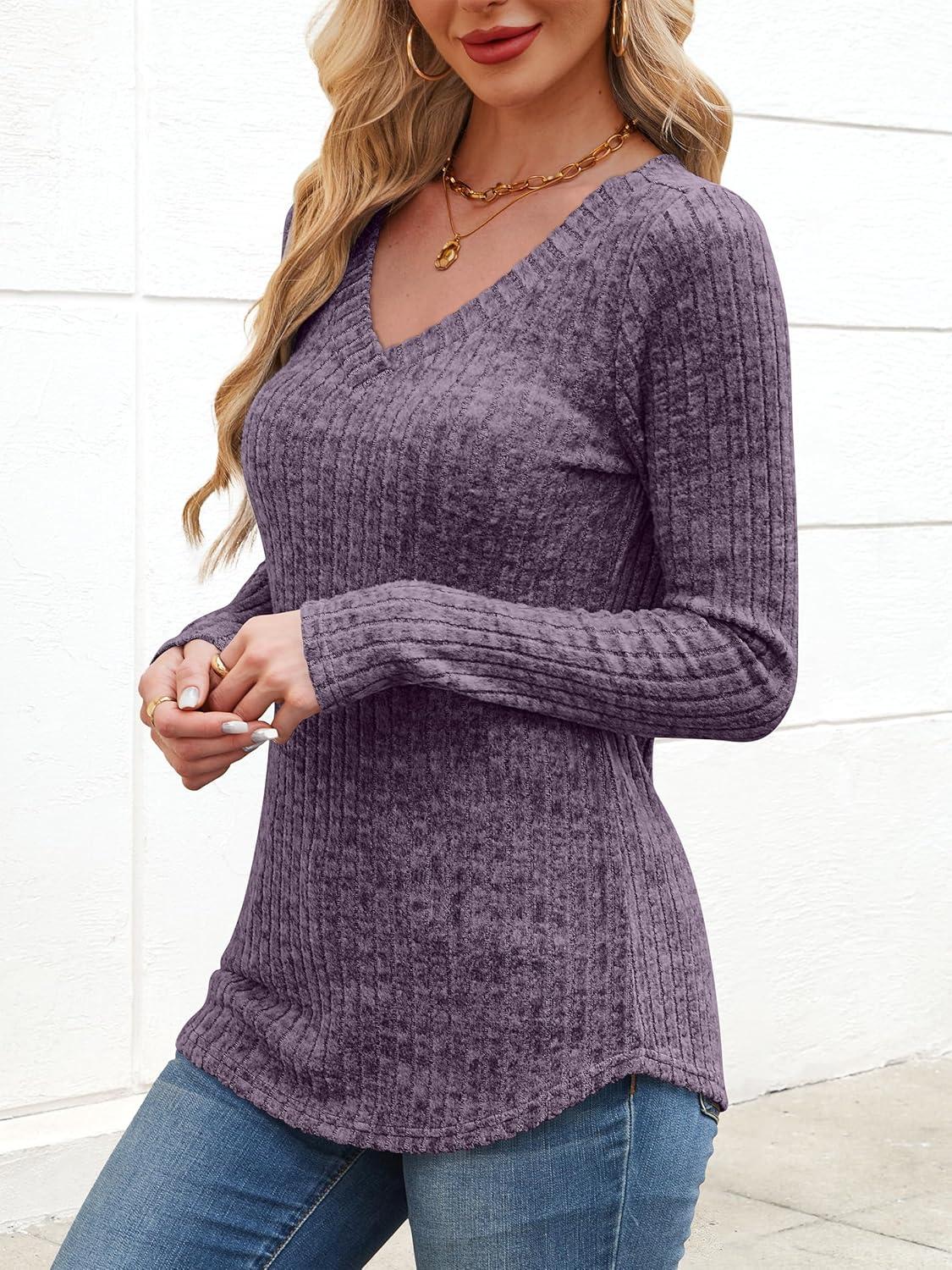 ANRABESS Womens Long Sleeve Shirts V Neck Lightweight Sweater Tops 2025 Fall Dressy Casual Work Tunic Blouse(Purple)