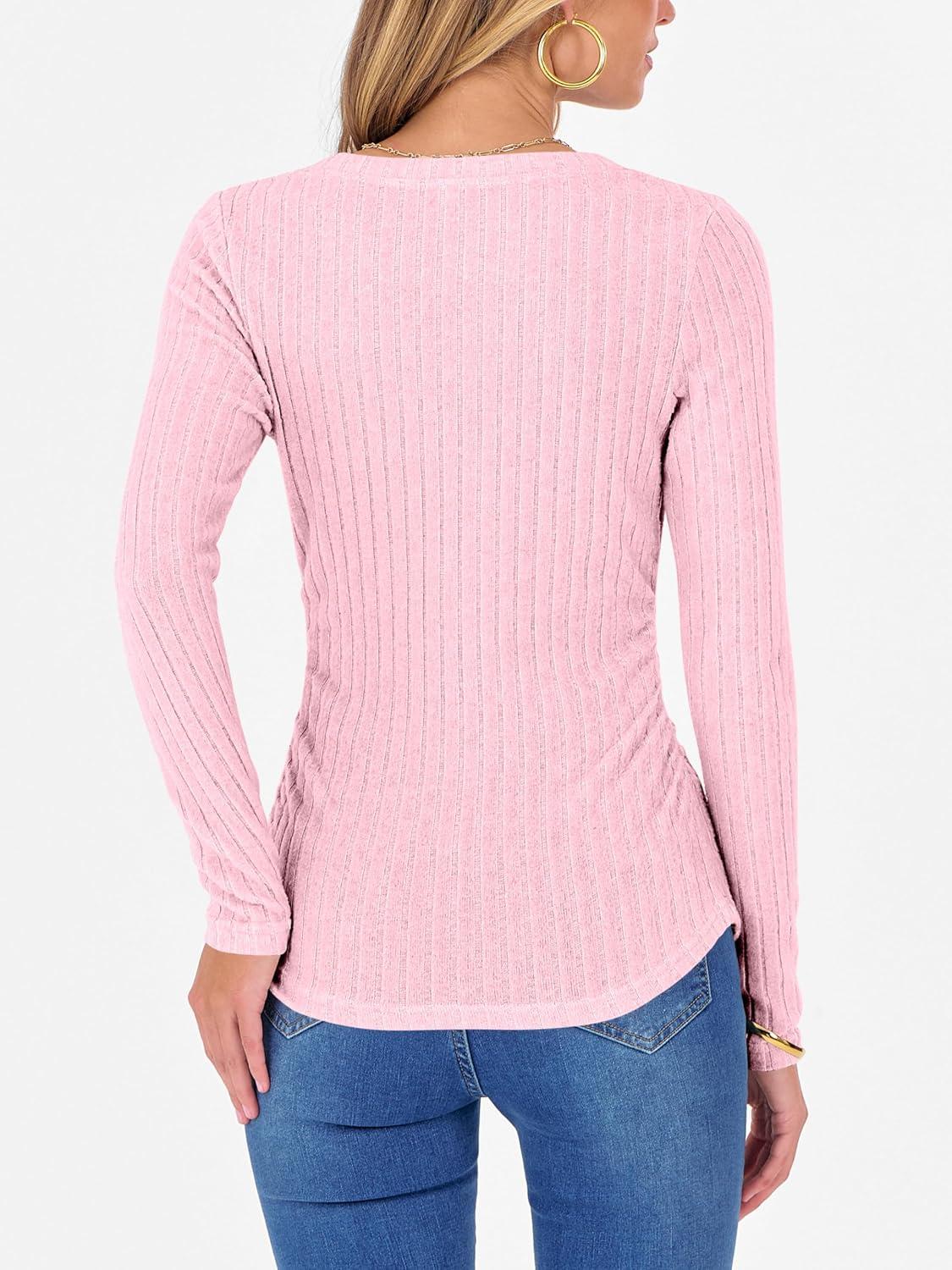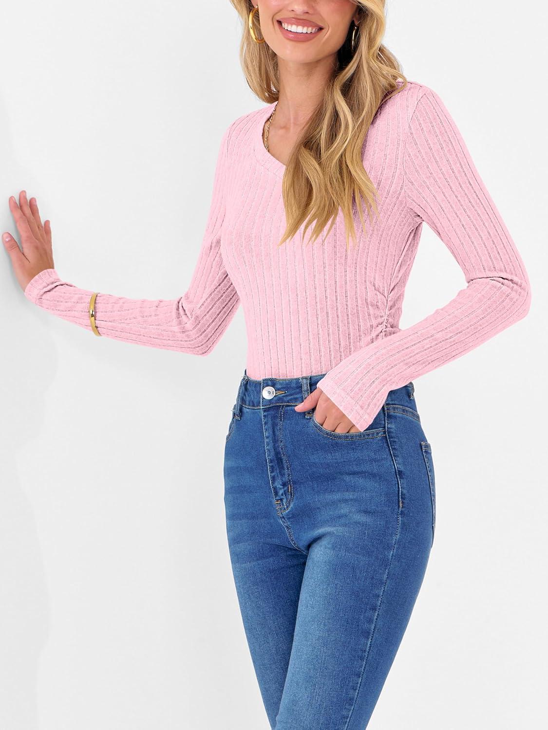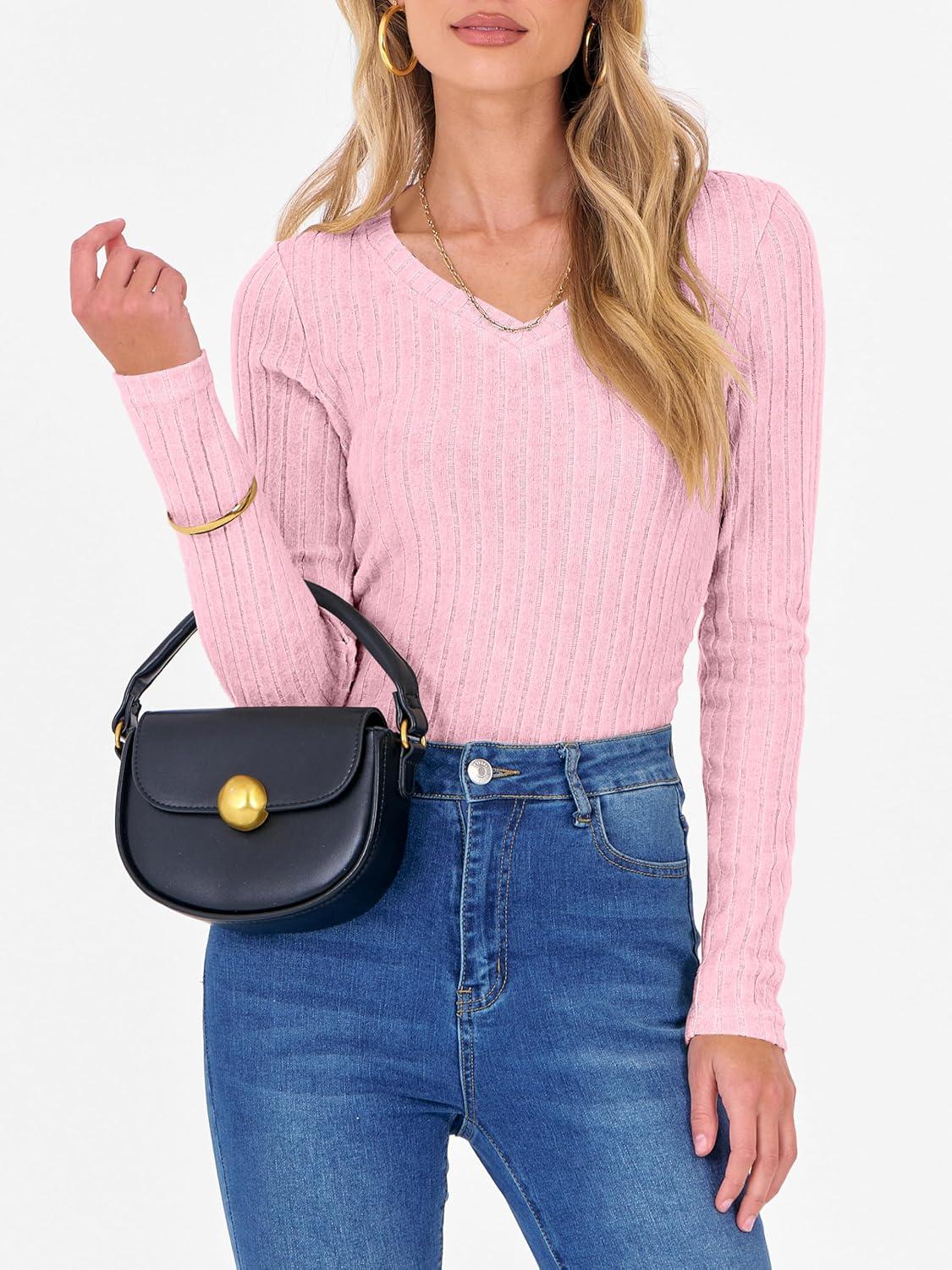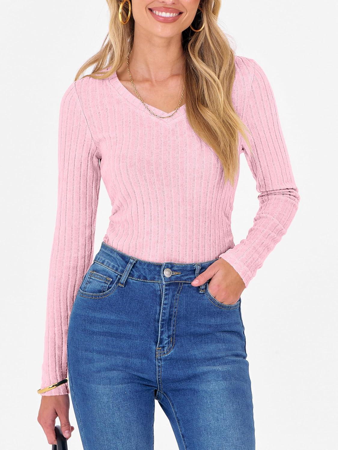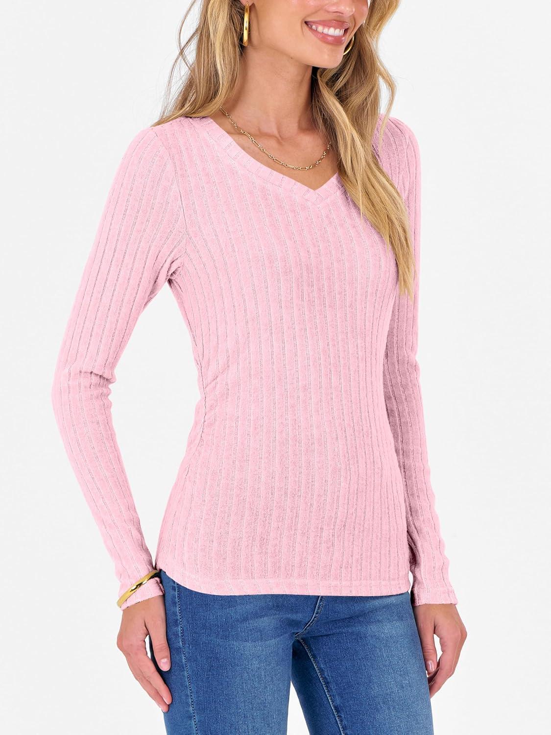 ANRABESS Womens Long Sleeve Shirts V Neck Ribbed Knit Slim Fit Lightweight Sweater 2025 Fall Dressy Casual Travel Work Tops(Pink)