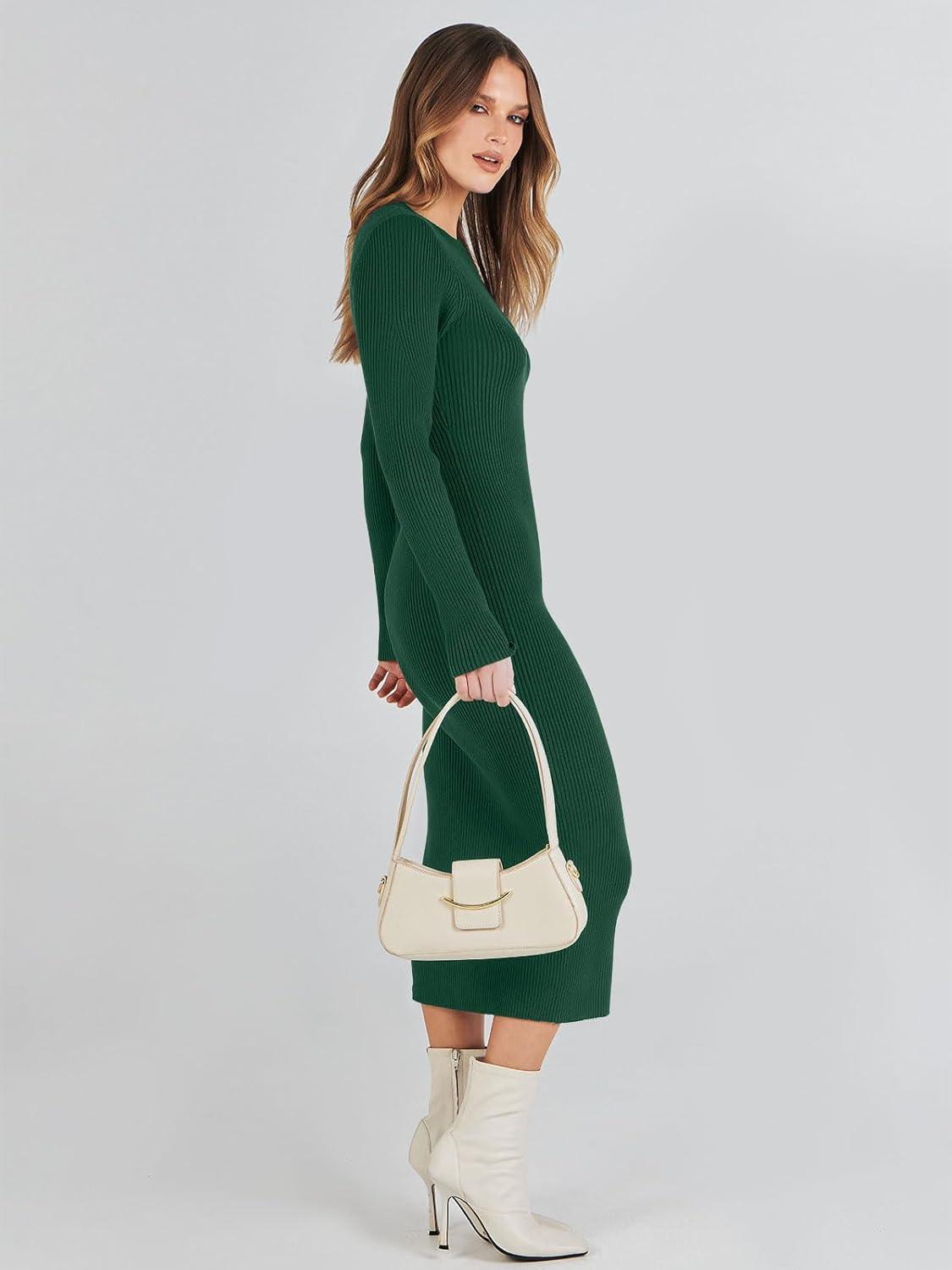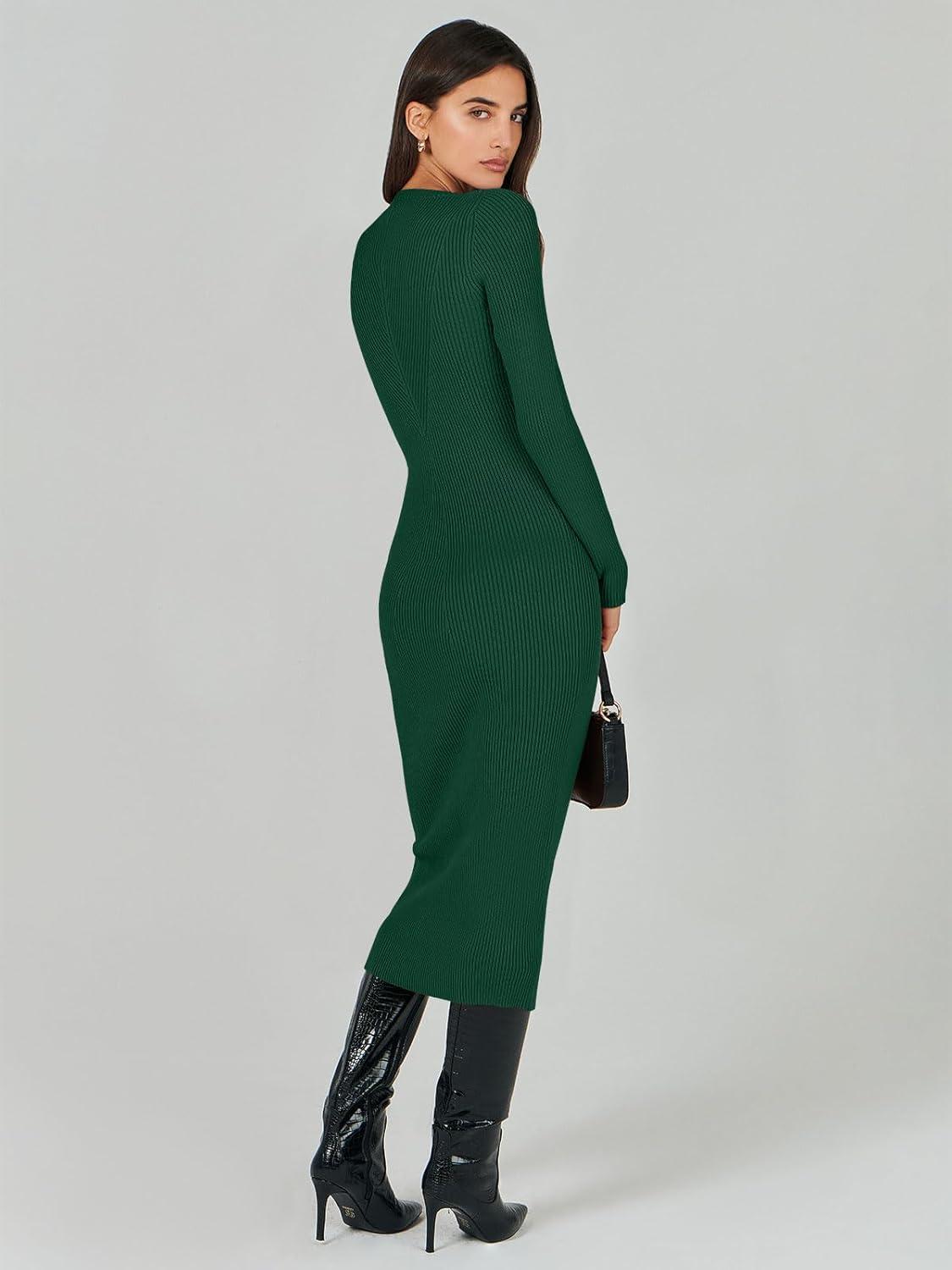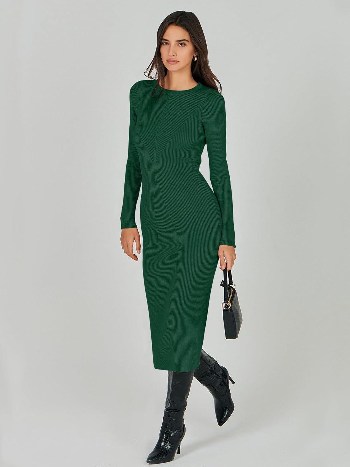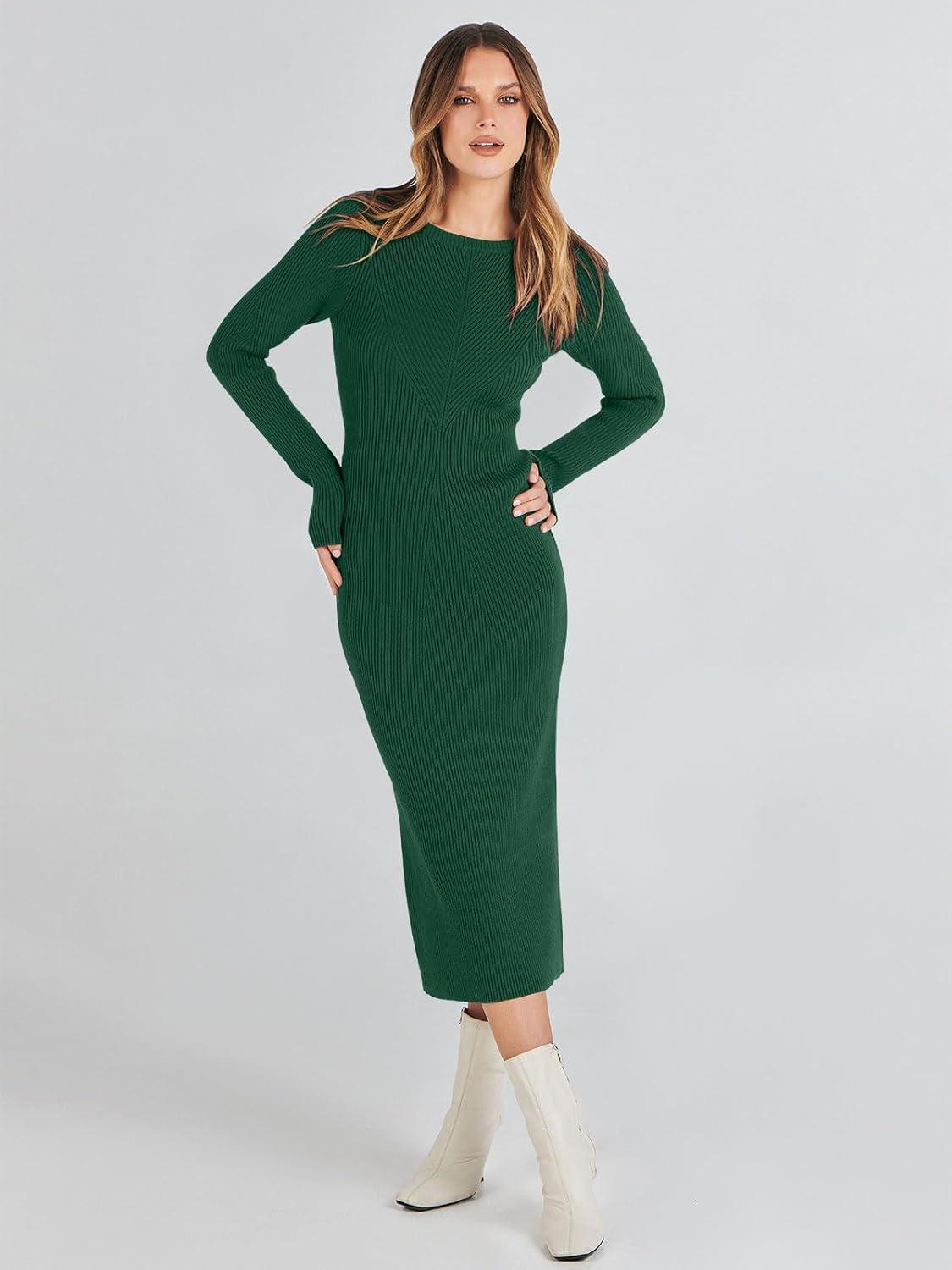 ANRABESS Womens Long Sleeve Sweater Dress 2025 Fall Crewneck Bodycon Stretch Ribbed Knit Slim Fit Midi Dresses Trendy Outfits(Green)
