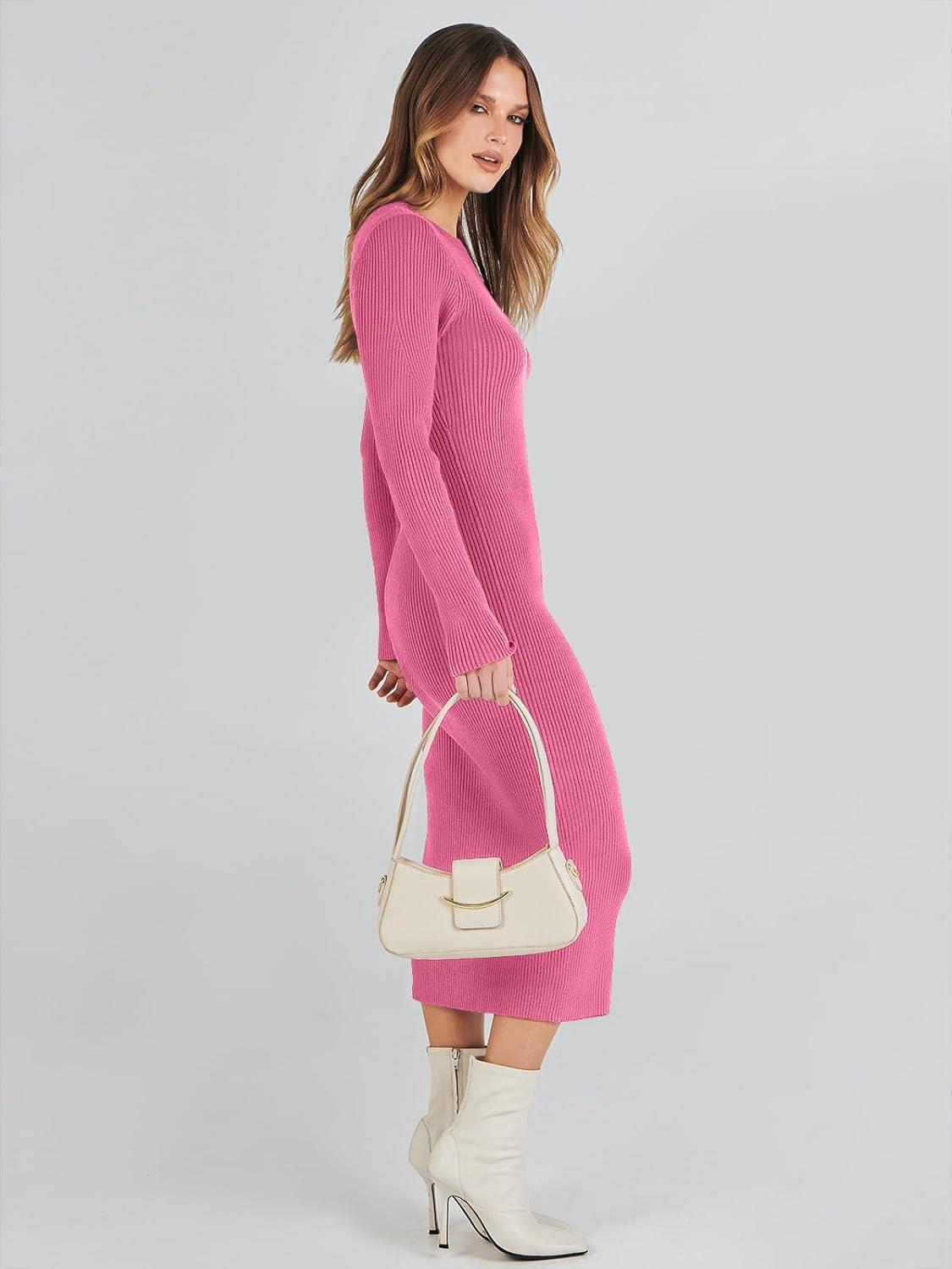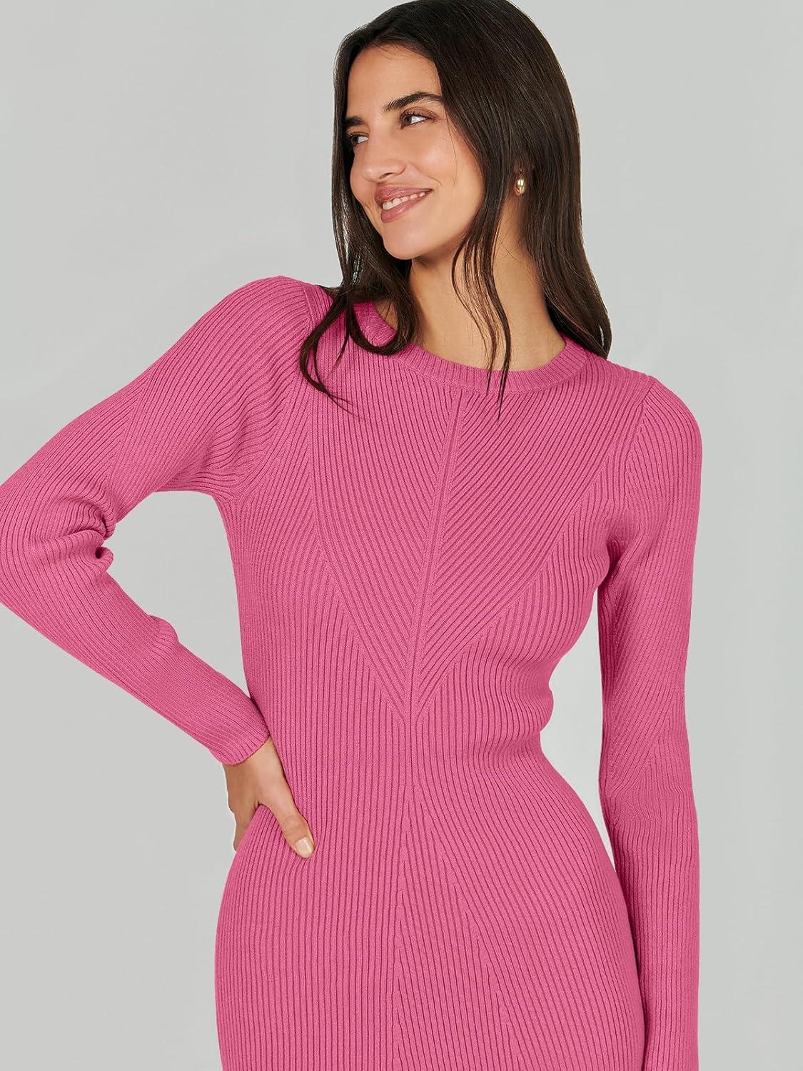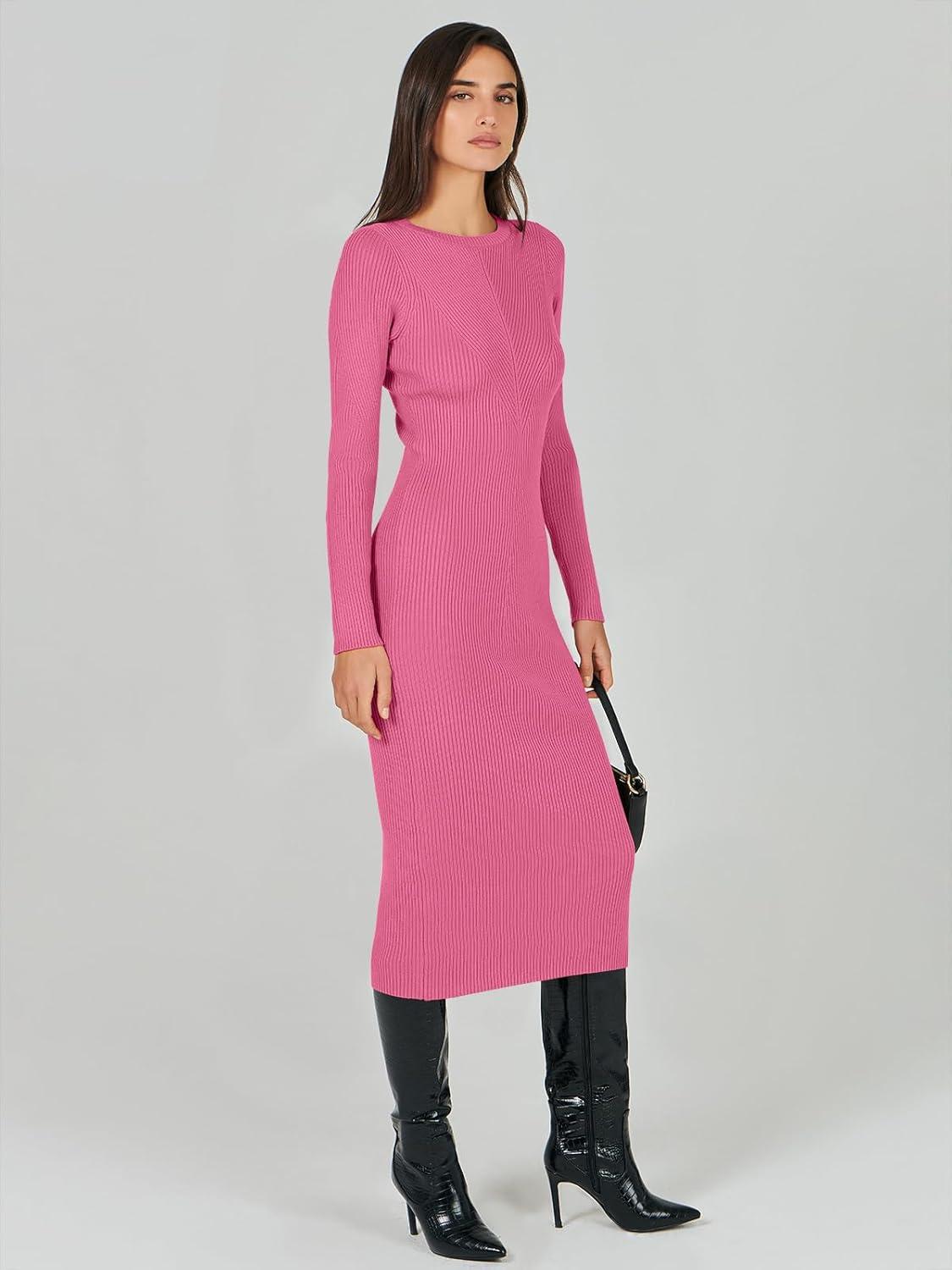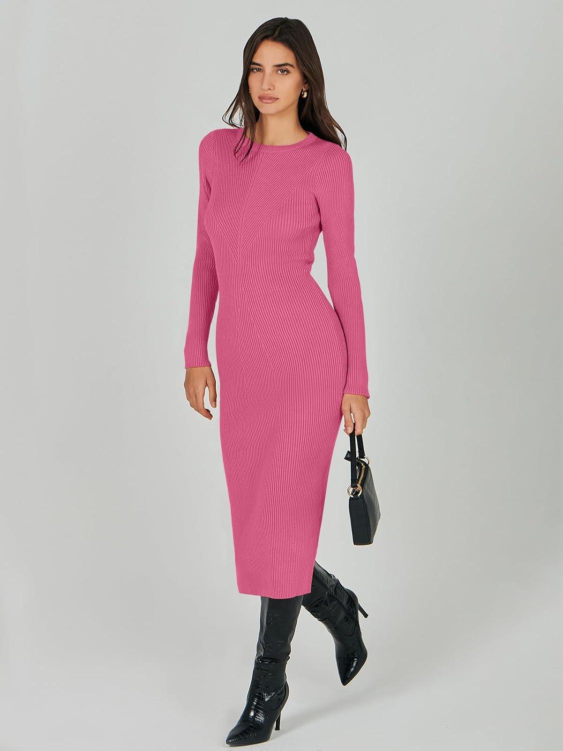 imageANRABESS Womens Long Sleeve Sweater Dress 2025 Fall Crewneck Bodycon Stretch Ribbed Knit Slim Fit Midi Dresses Trendy OutfitsHot Pink