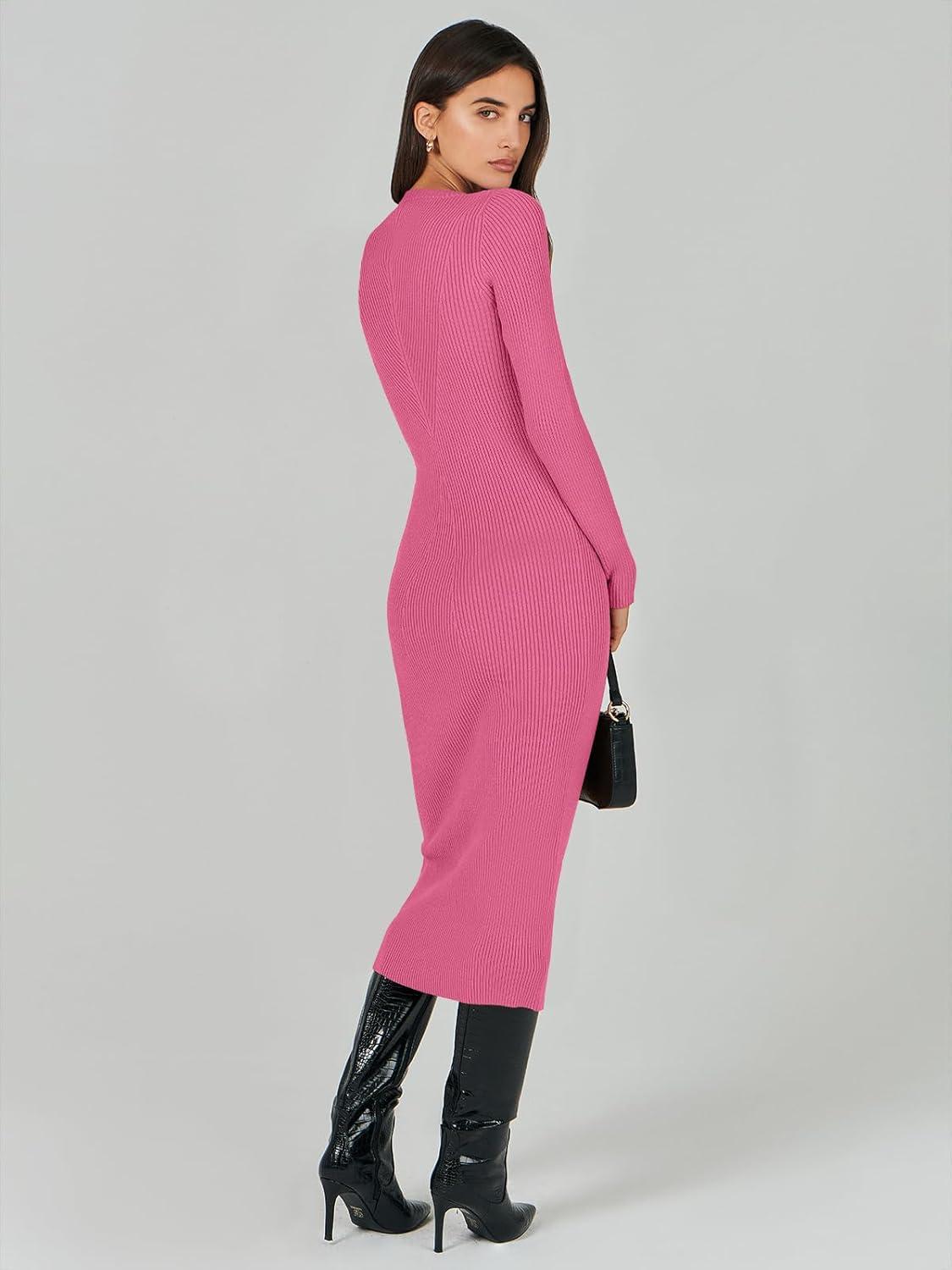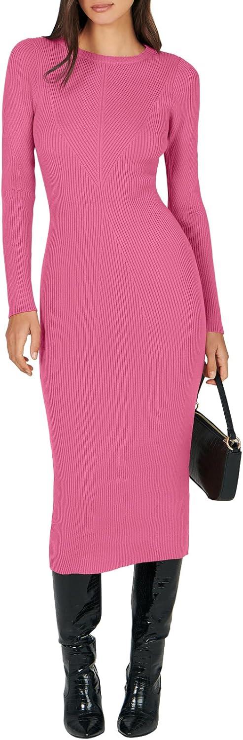 ANRABESS Womens Long Sleeve Sweater Dress 2025 Fall Crewneck Bodycon Stretch Ribbed Knit Slim Fit Midi Dresses Trendy Outfits(Hot Pink)