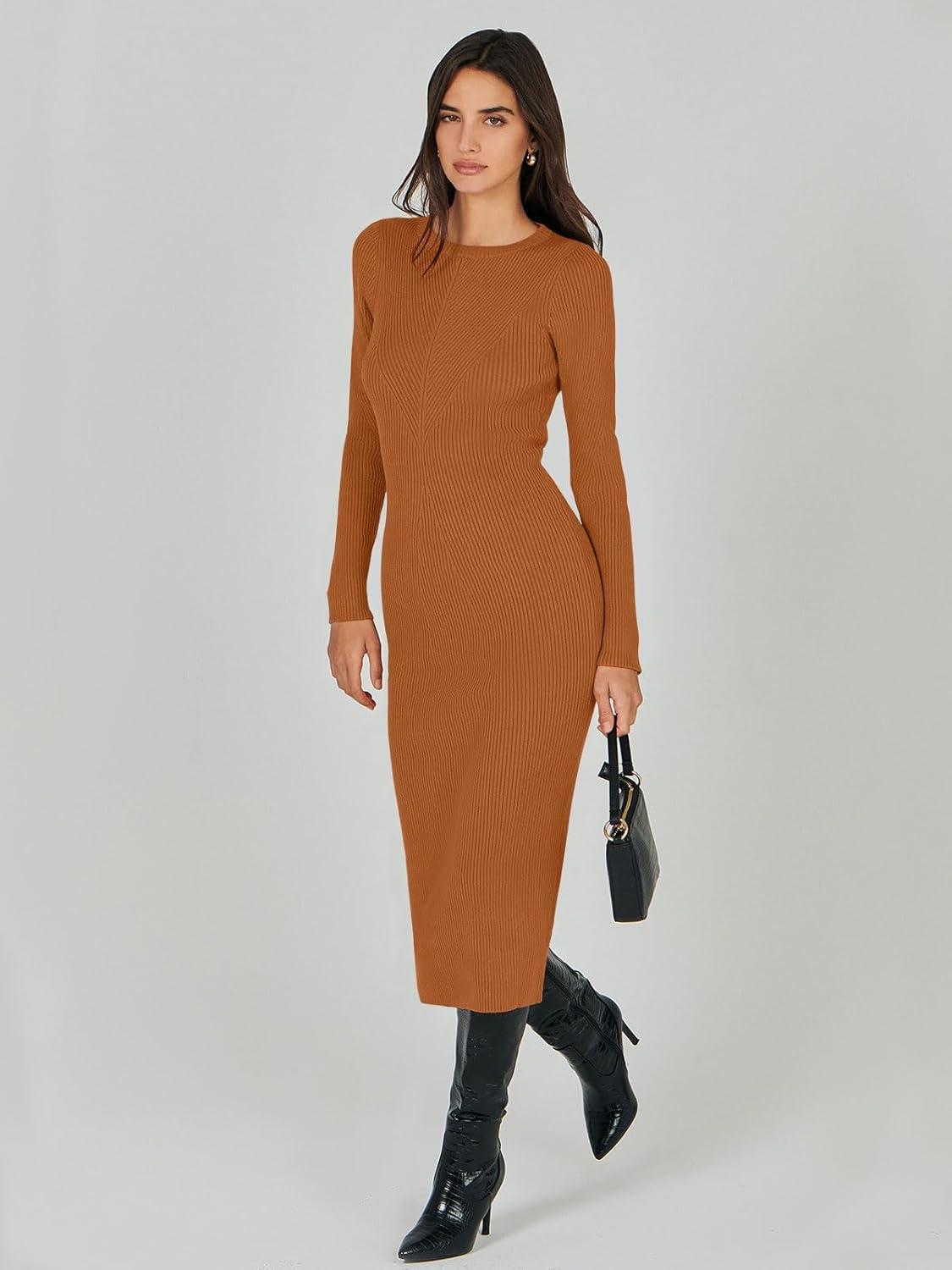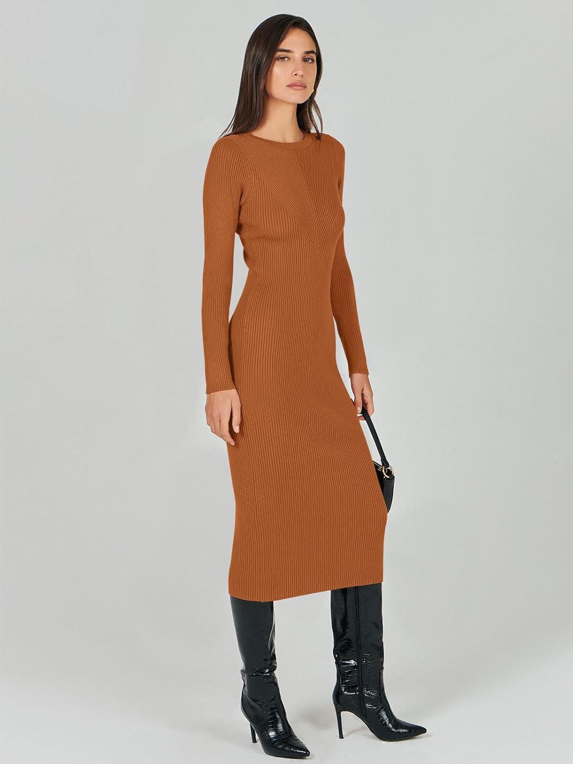 ANRABESS Womens Long Sleeve Sweater Dress 2025 Fall Crewneck Bodycon Stretch Ribbed Knit Slim Fit Midi Dresses Trendy Outfits(Rust)