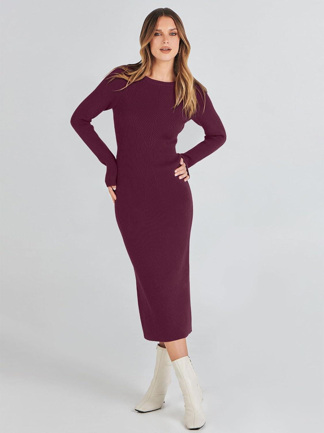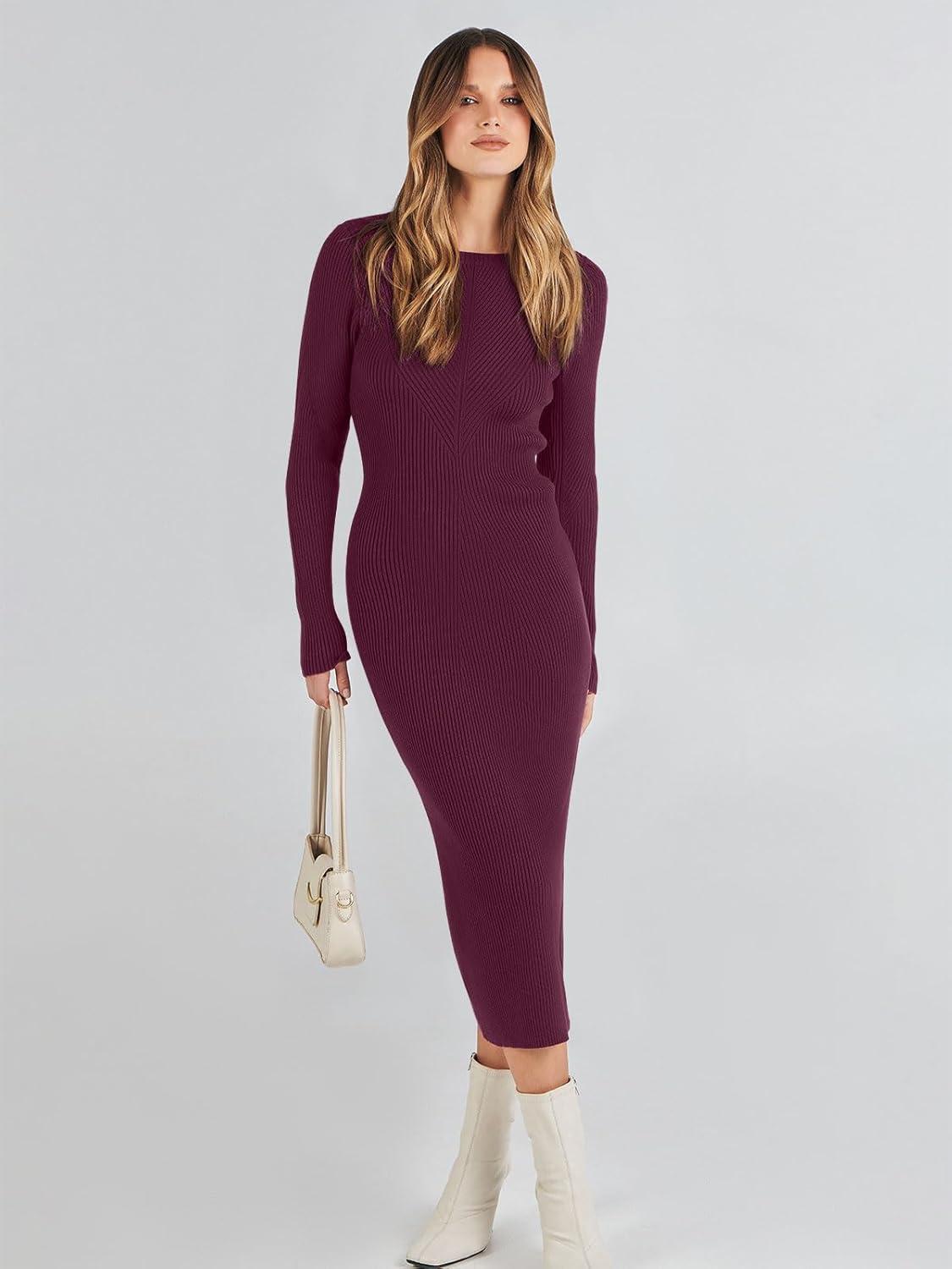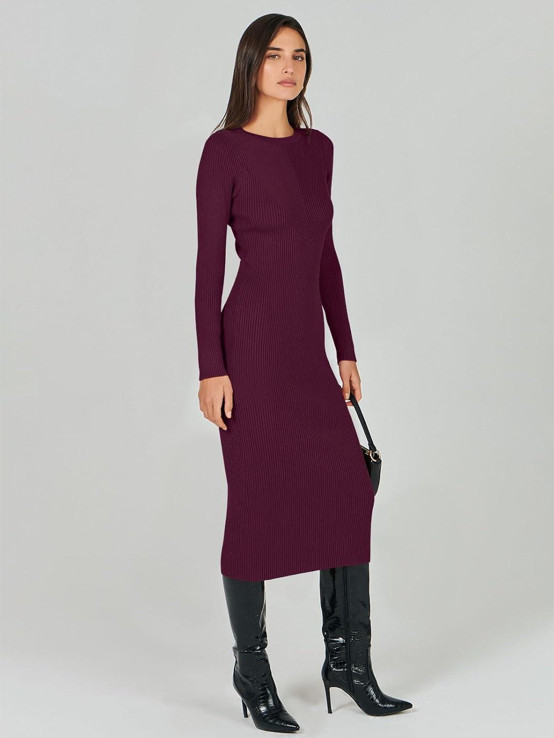 ANRABESS Womens Long Sleeve Sweater Dress 2025 Fall Crewneck Bodycon Stretch Ribbed Knit Slim Fit Midi Dresses Trendy Outfits(Wine Red)