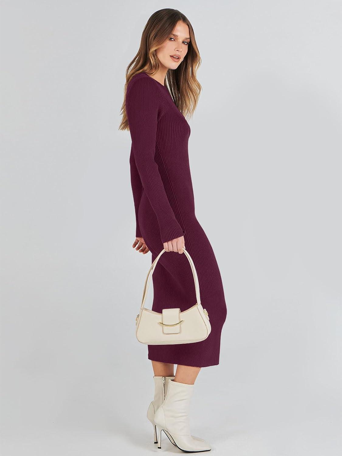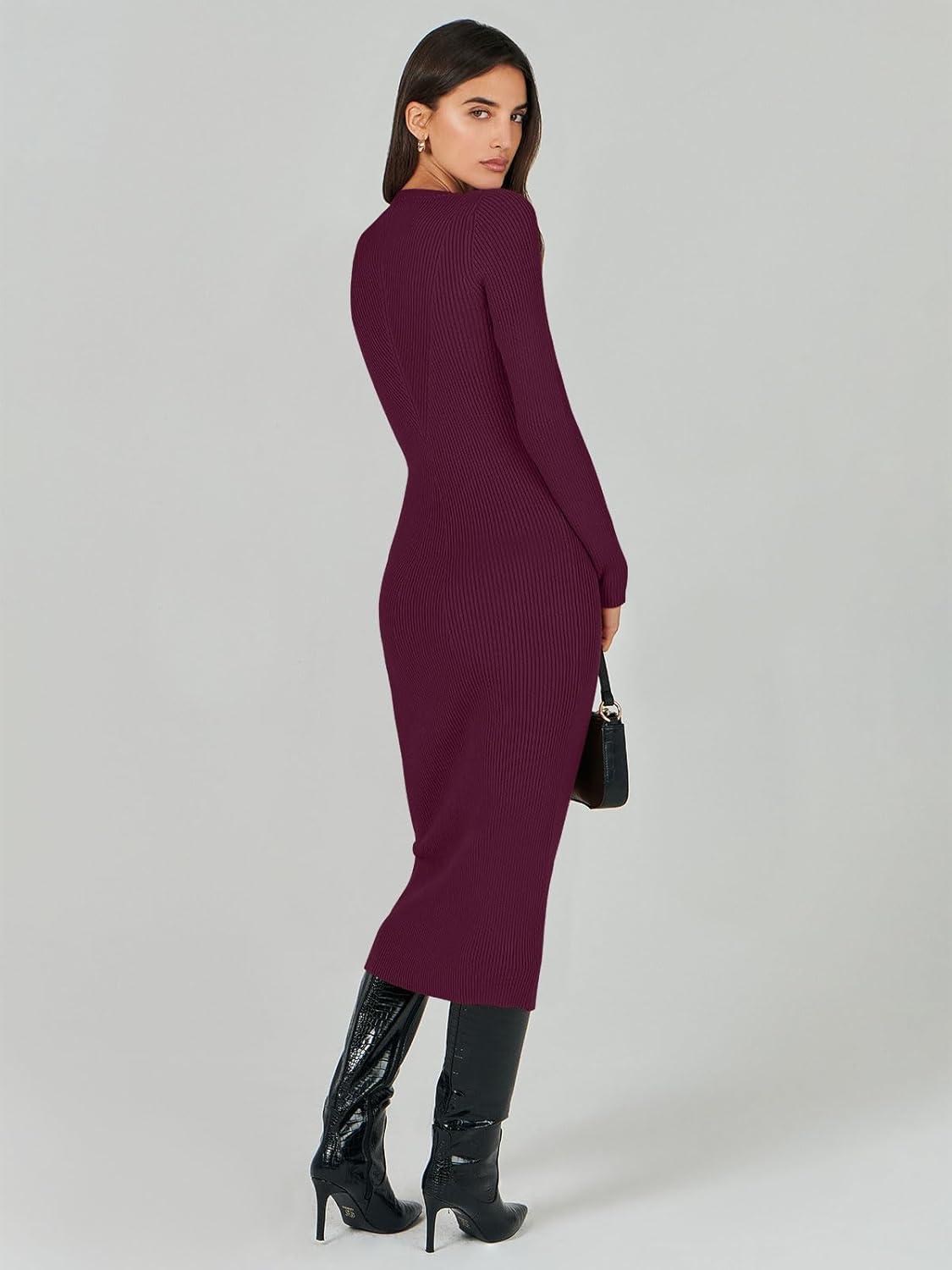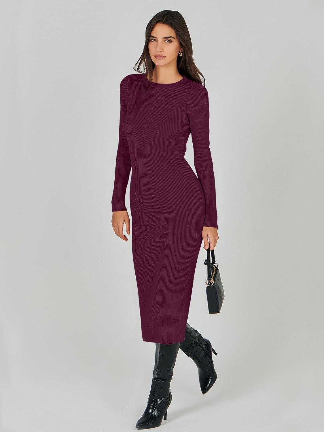 ANRABESS Womens Long Sleeve Sweater Dress 2025 Fall Crewneck Bodycon Stretch Ribbed Knit Slim Fit Midi Dresses Trendy Outfits(Wine Red)