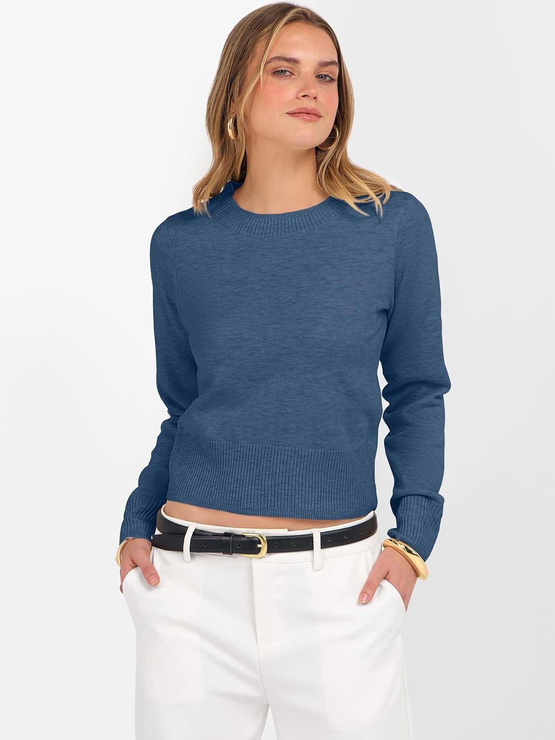 ANRABESS Women’s Long Sleeve Sweaters Cropped Crew Neck Business Casual Light Weight Sweater Tops Fall Fashion Clothes 2025(Deep Blue)