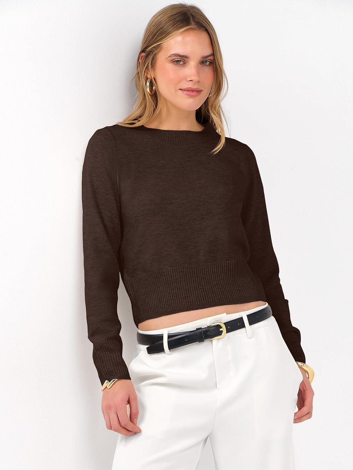 ANRABESS Women’s Long Sleeve Sweaters Cropped Crew Neck Business Casual Light Weight Sweater Tops Fall Fashion Clothes 2025(Deep Coffee)
