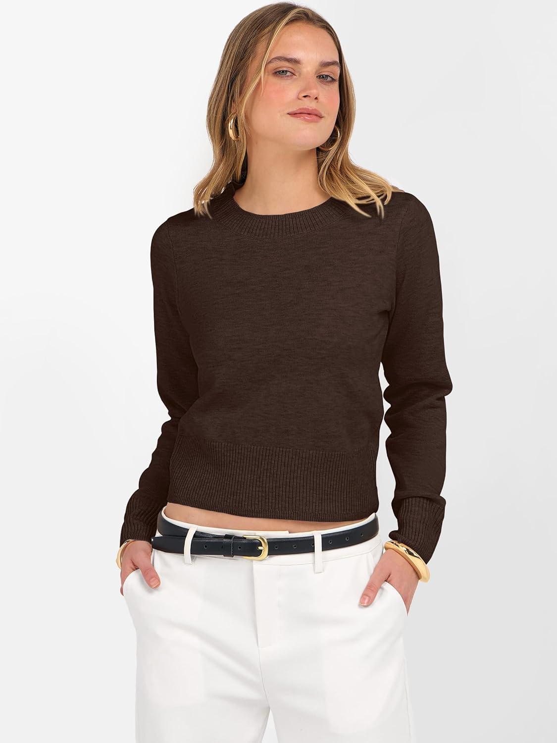 imageANRABESS Womens Long Sleeve Sweaters Cropped Crew Neck Business Casual Light Weight Sweater Tops Fall Fashion Clothes 2025Deep Coffee