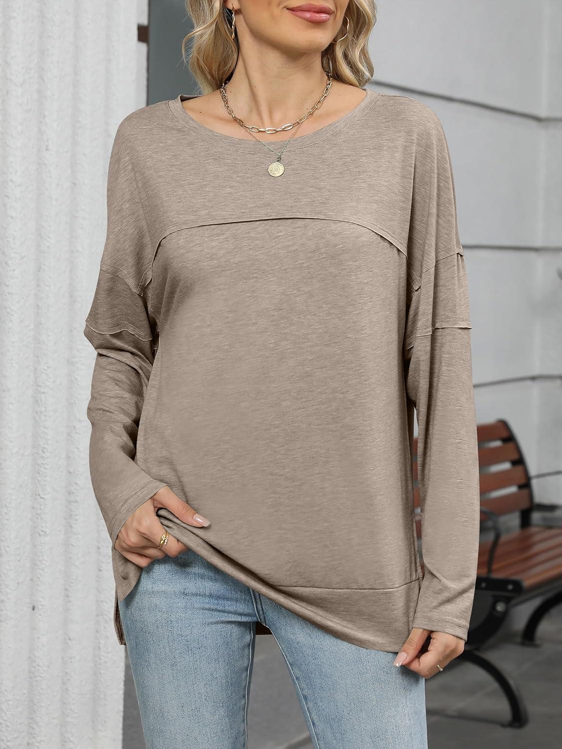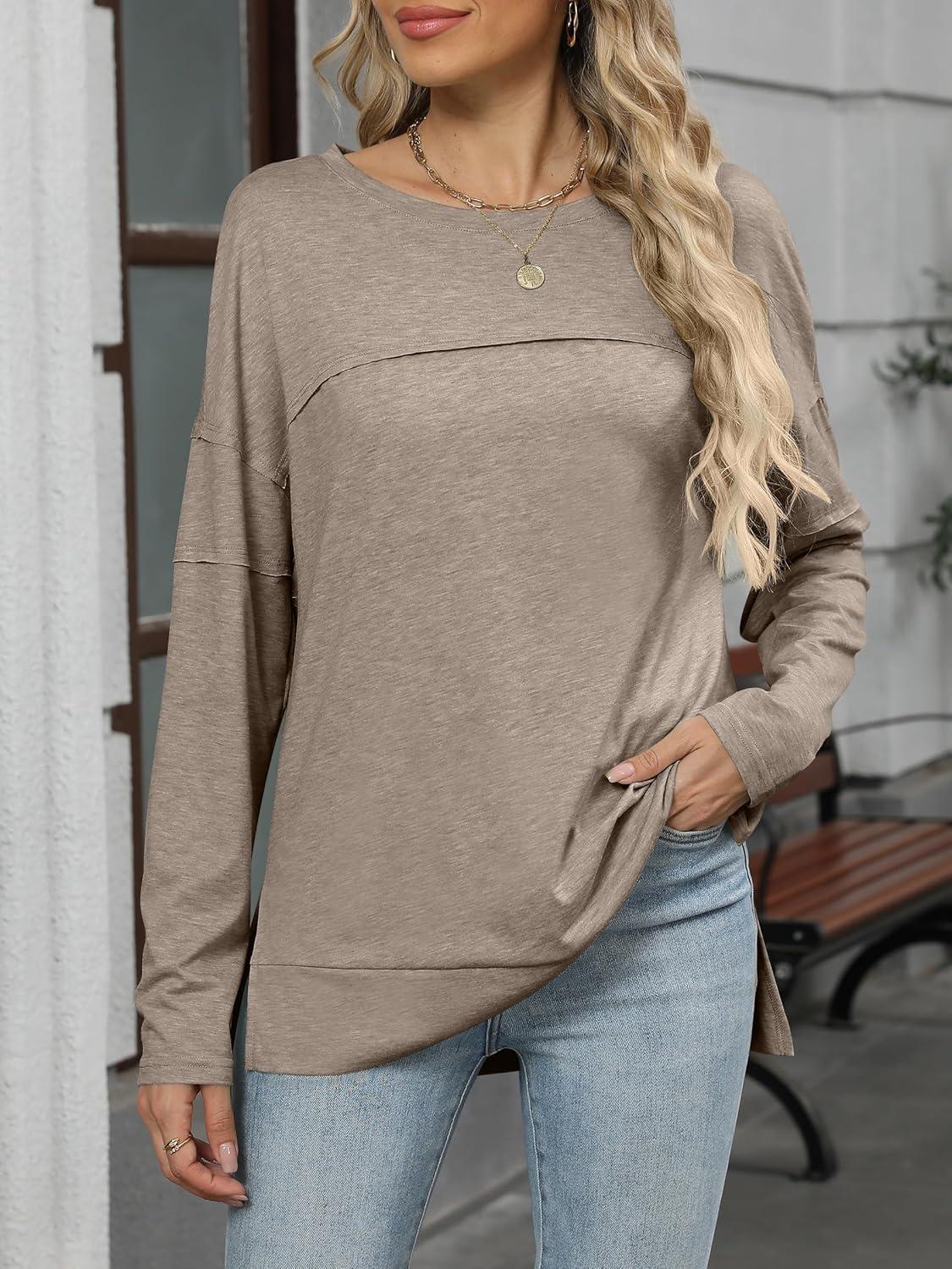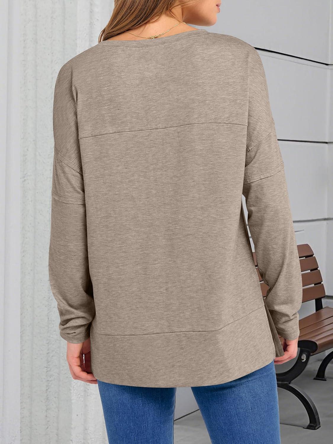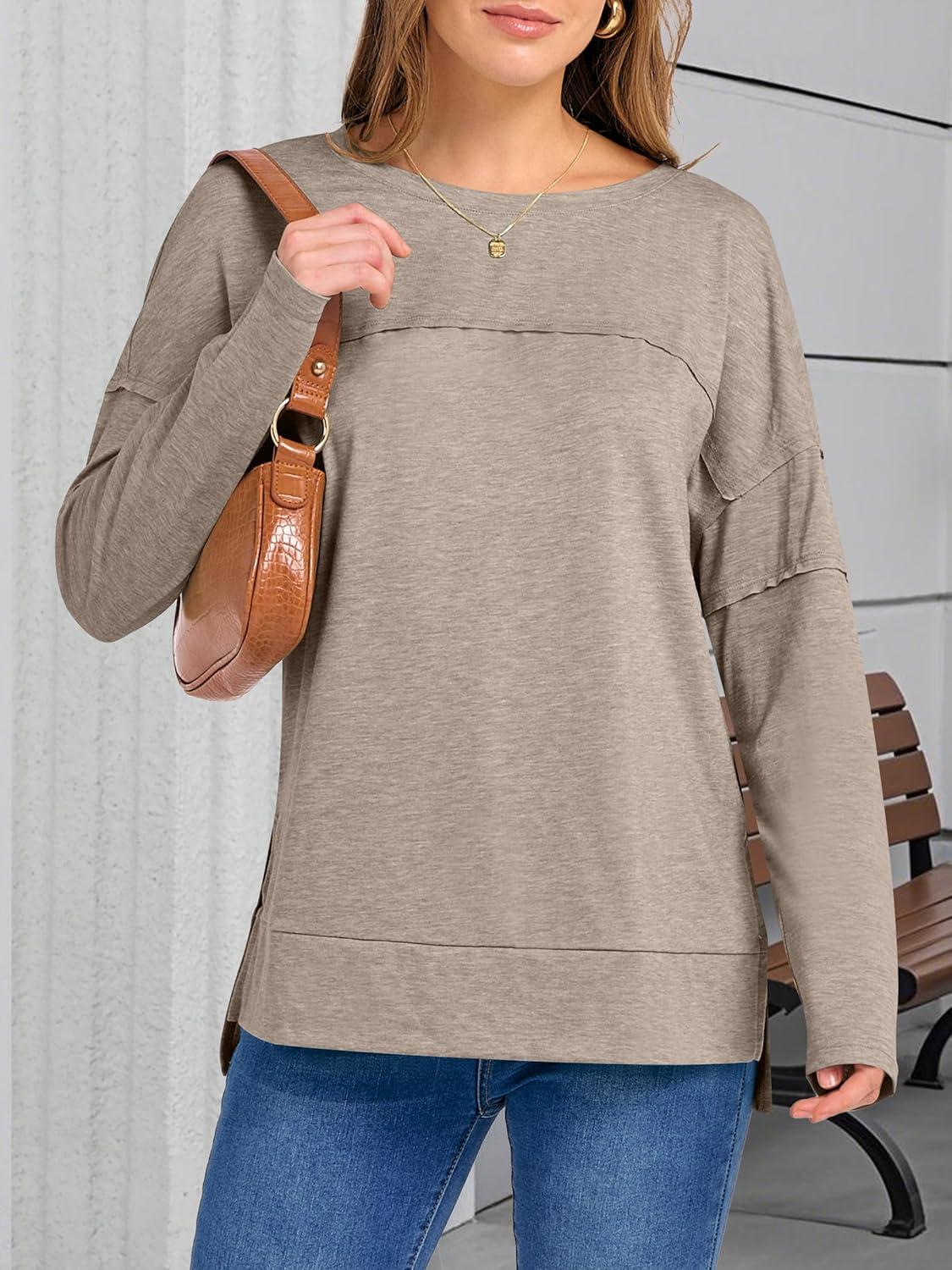 ANRABESS Womens Long Sleeve T Shirts Split Side Tunic Tops 2025 Fall Outfits(Light Khaki)