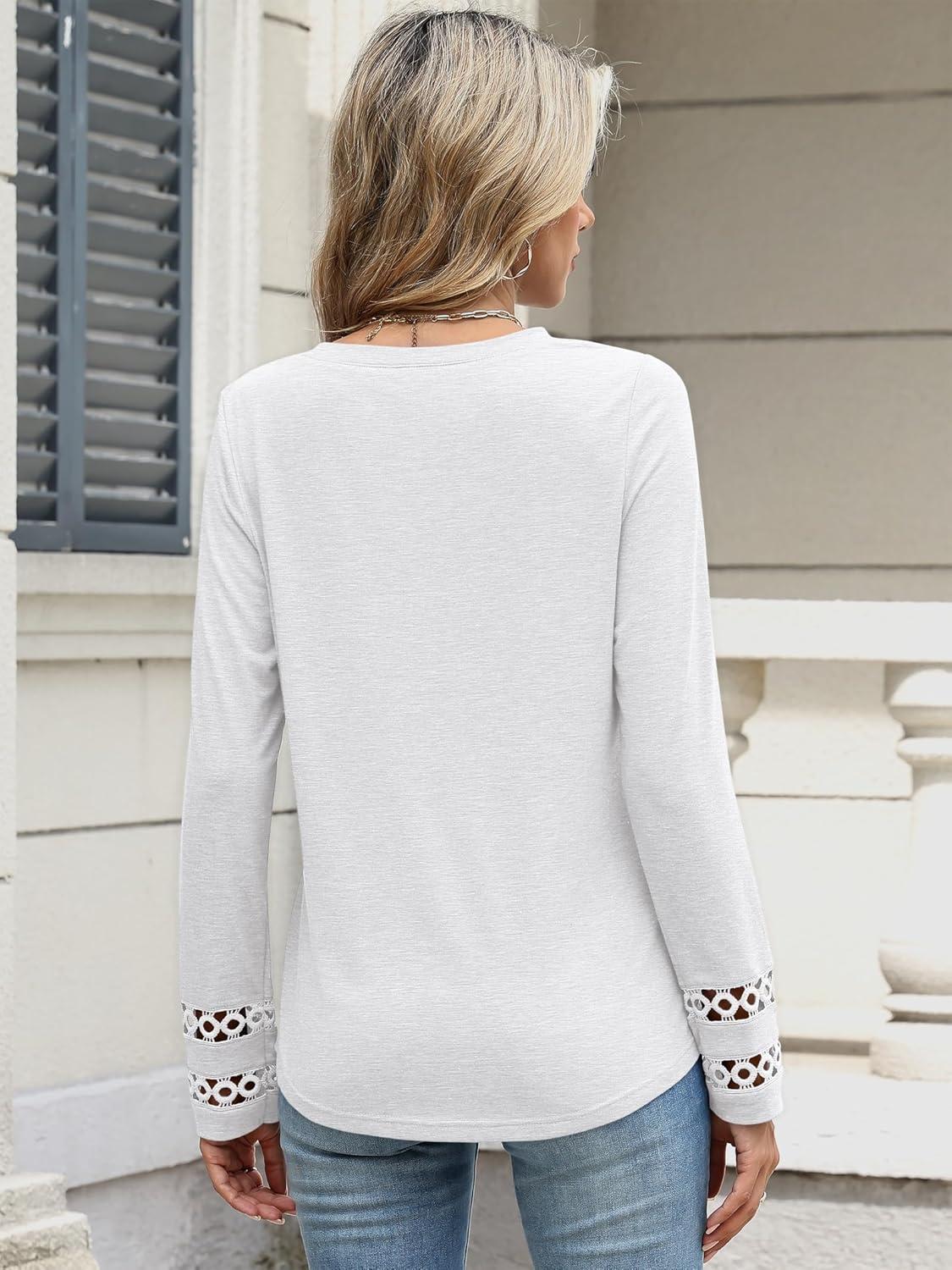 ANRABESS Womens Long Sleeve Tops Lace Dressy Casual Blouses 2025 Fall Tunic Shirts Trendy V Neck T-Shirts Work Travel Outfits(White)