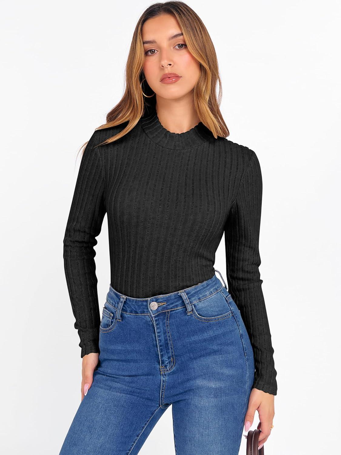 ANRABESS Women’s Long Sleeve Tops Mock Neck Ribbed Knit Slim Fit Pleated Basic T Shirts Lightweight Sweater Going Out Clothes(Black)