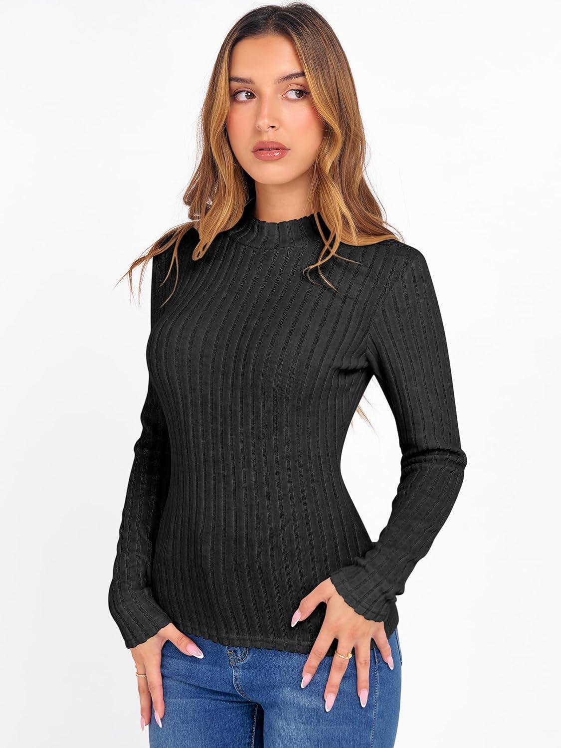 ANRABESS Women's Long Sleeve Tops Mock Neck Ribbed Knit Slim Fit Pleated Basic T Shirts Lightweight Sweater Going Out Clothes(Black)