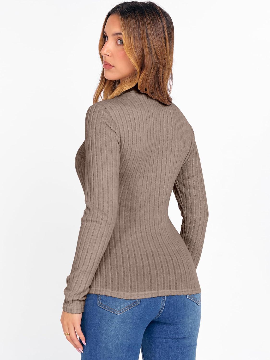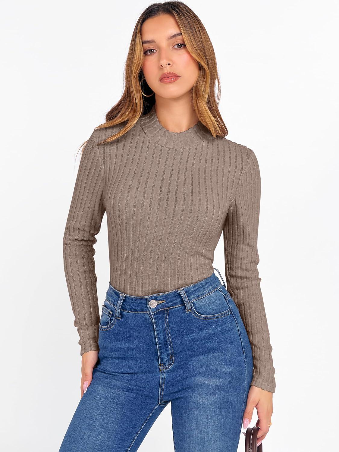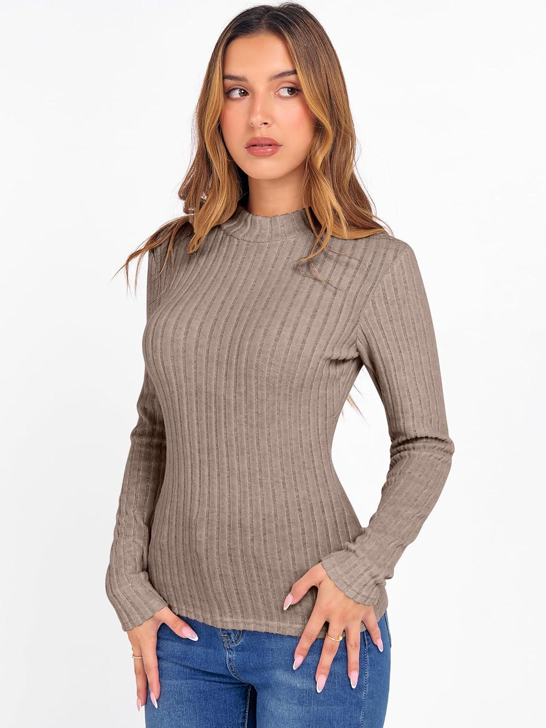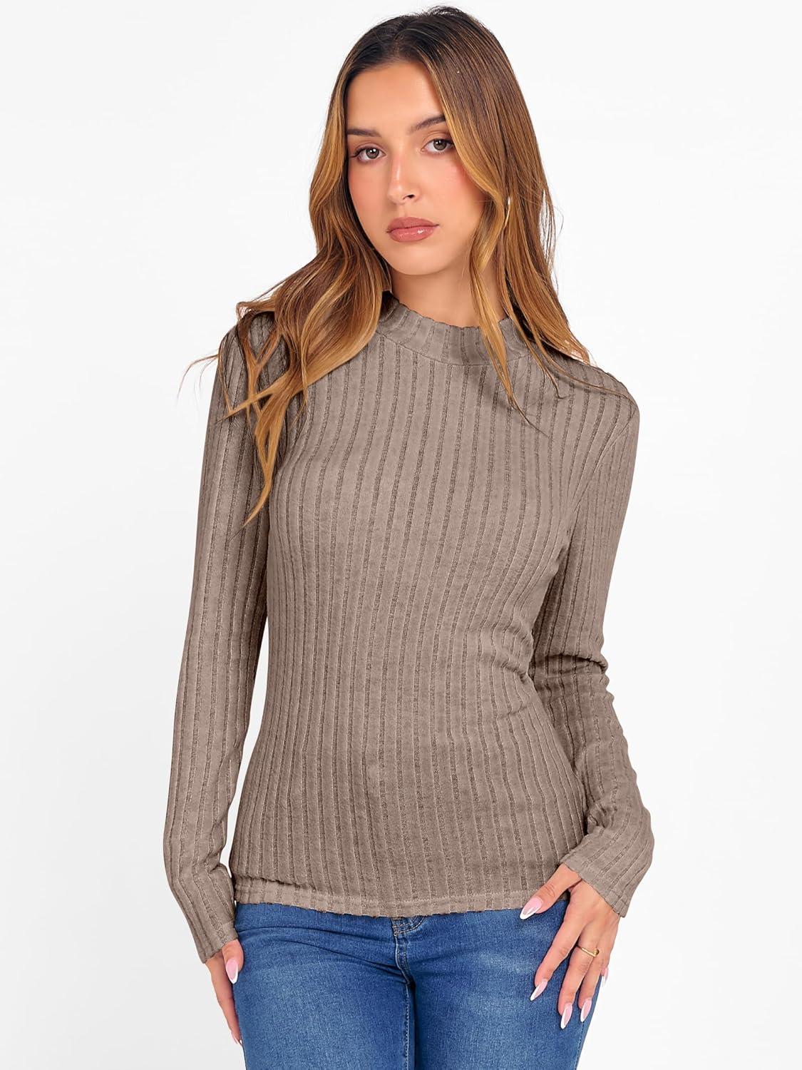 ANRABESS Women’s Long Sleeve Tops Mock Neck Ribbed Knit Slim Fit Pleated Basic T Shirts Lightweight Sweater Going Out Clothes(Khaki)