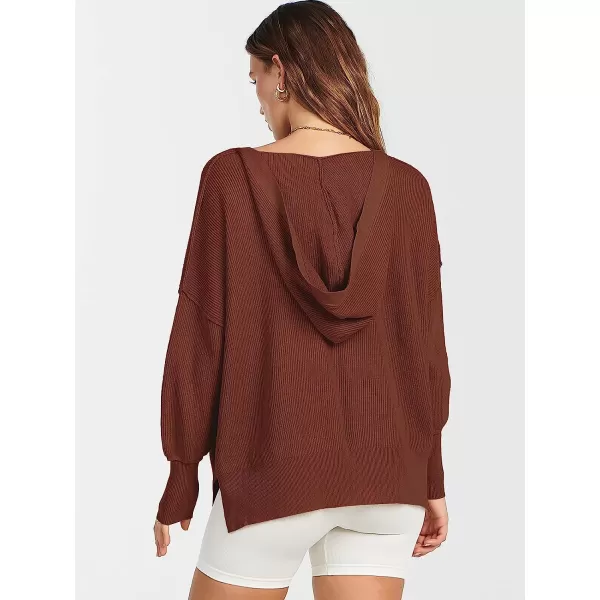 ANRABESS Women’s Long Sleeve V Neck Hooded Drop Shoulder Oversized Slouchy Knit Pullover Sweater with Slit(Rust)