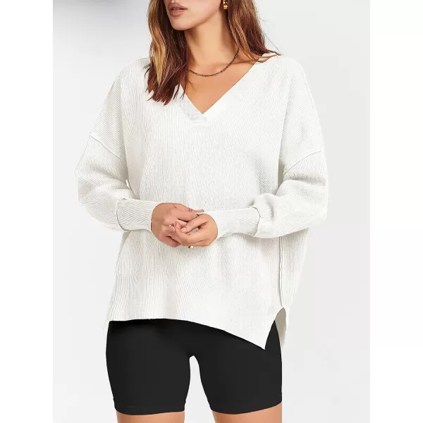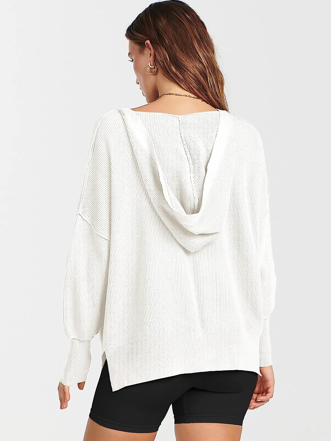 ANRABESS Women’s Long Sleeve V Neck Hooded Drop Shoulder Oversized Slouchy Knit Pullover Sweater with Slit(White)