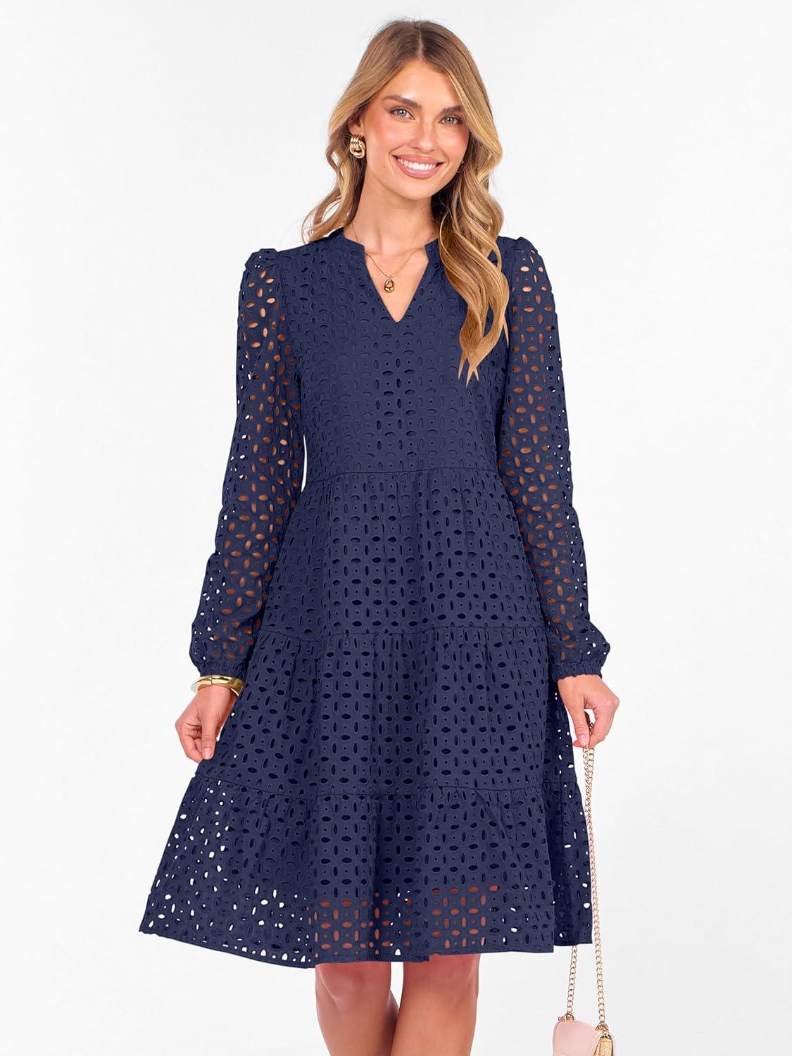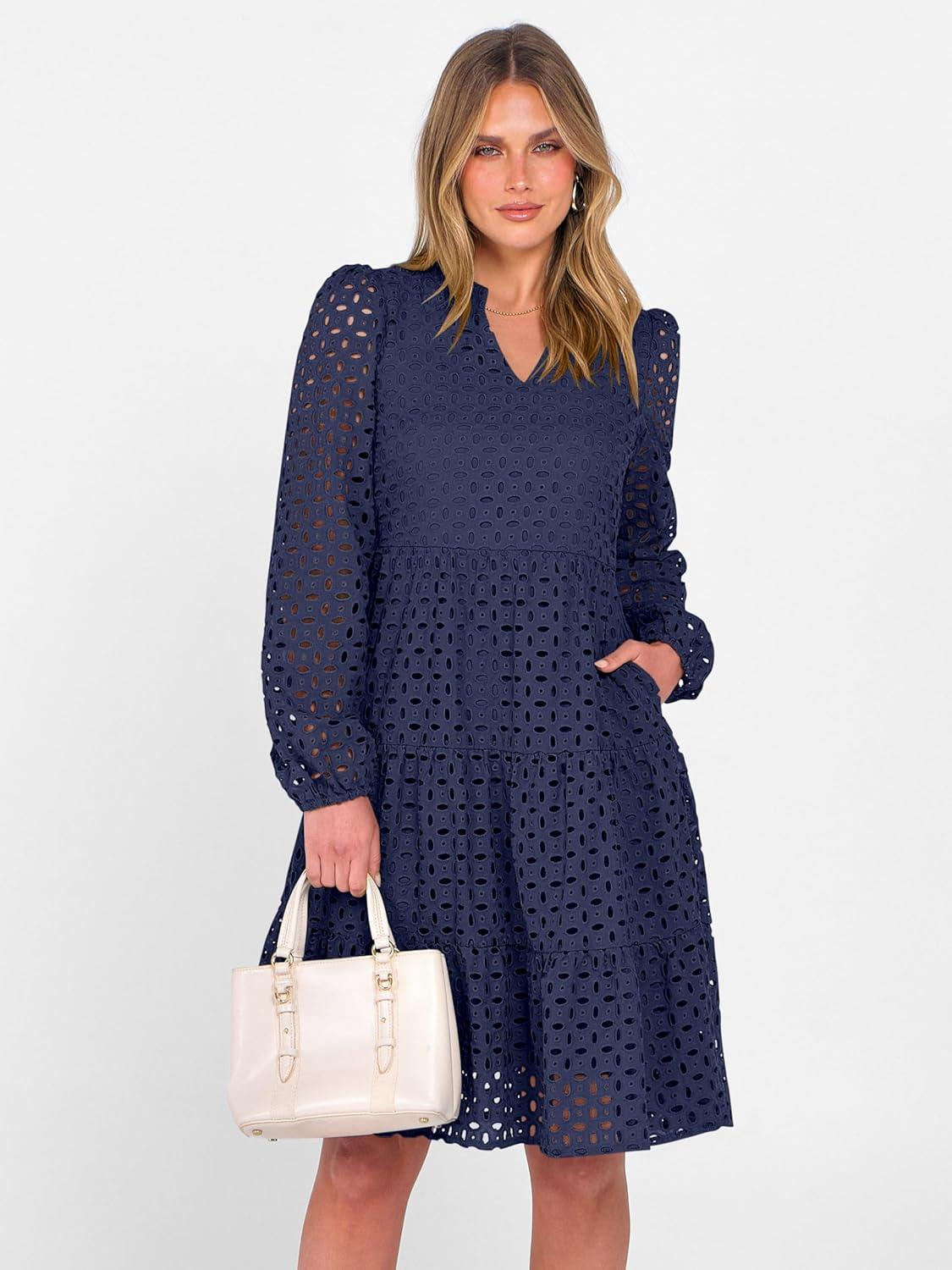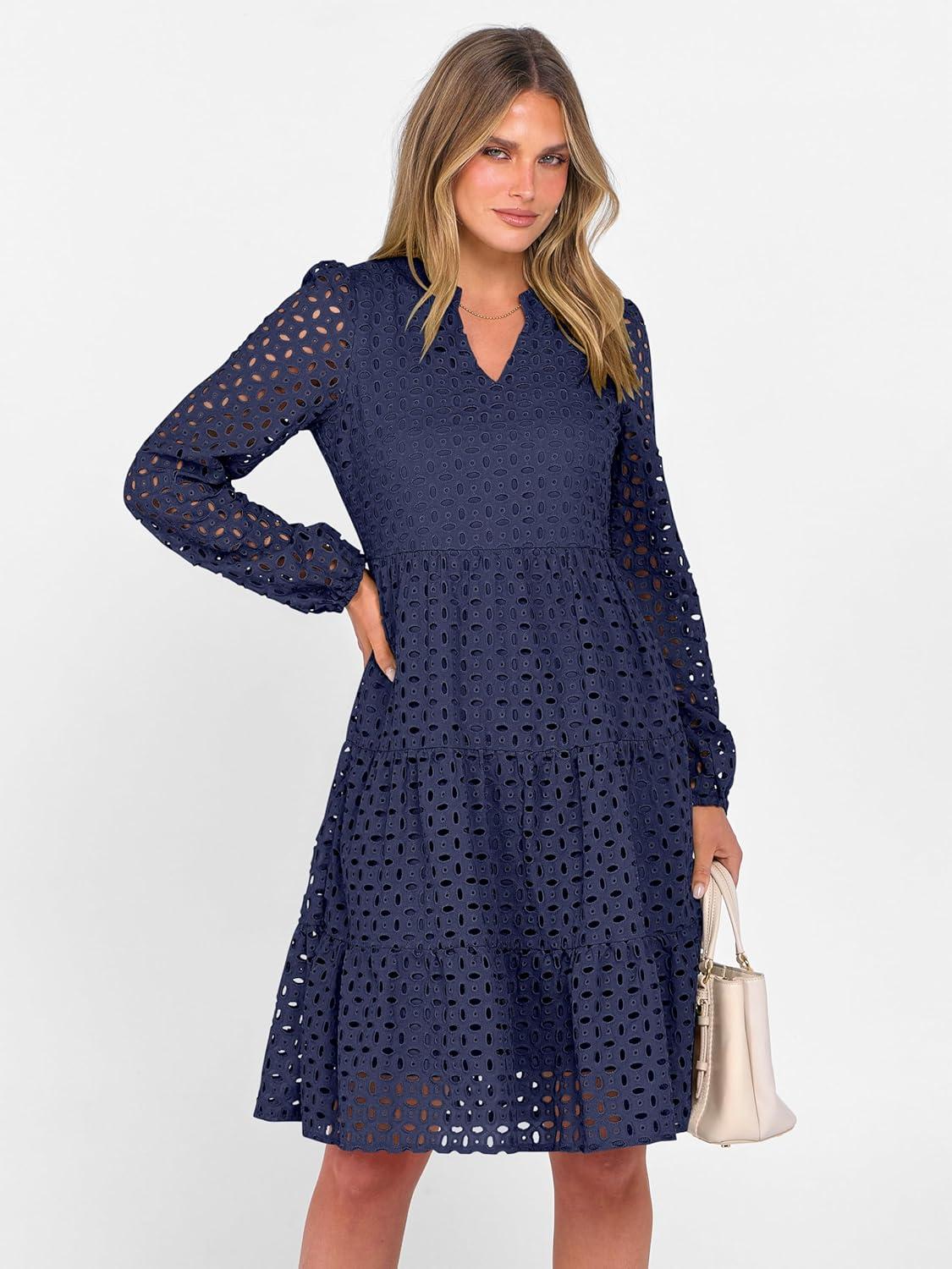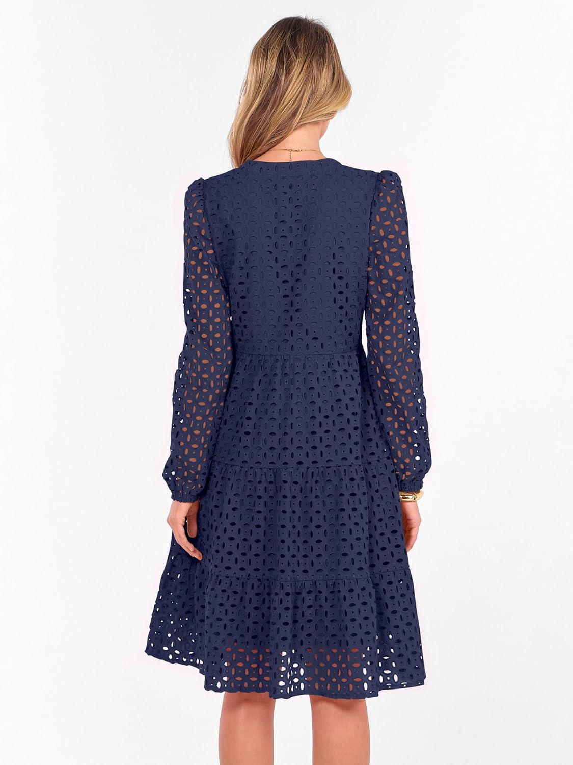 ANRABESS Womens Long Sleeve V Neck MIdi Dresses Hollow Out Eyelet Casual Tiered 2025 Fall Beach Vacation Dress with Pockets(Navy Blue)